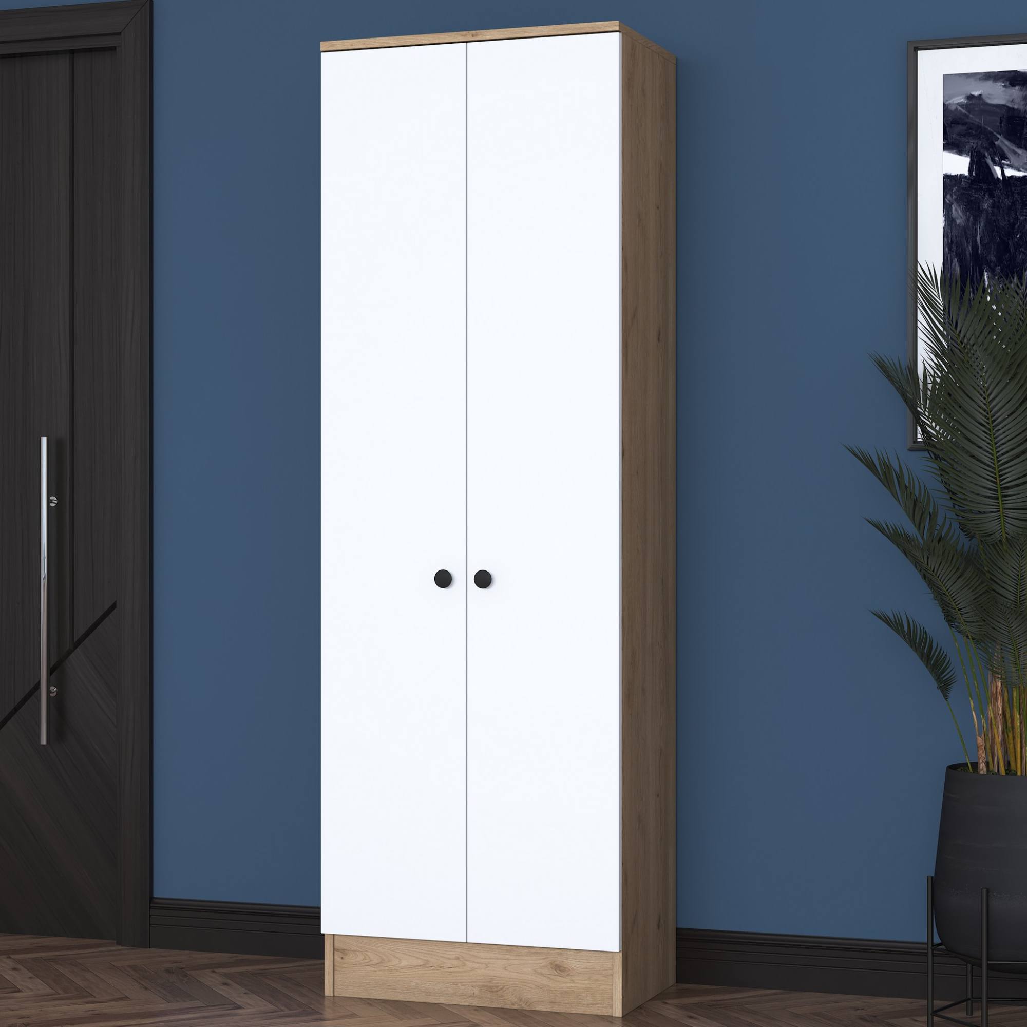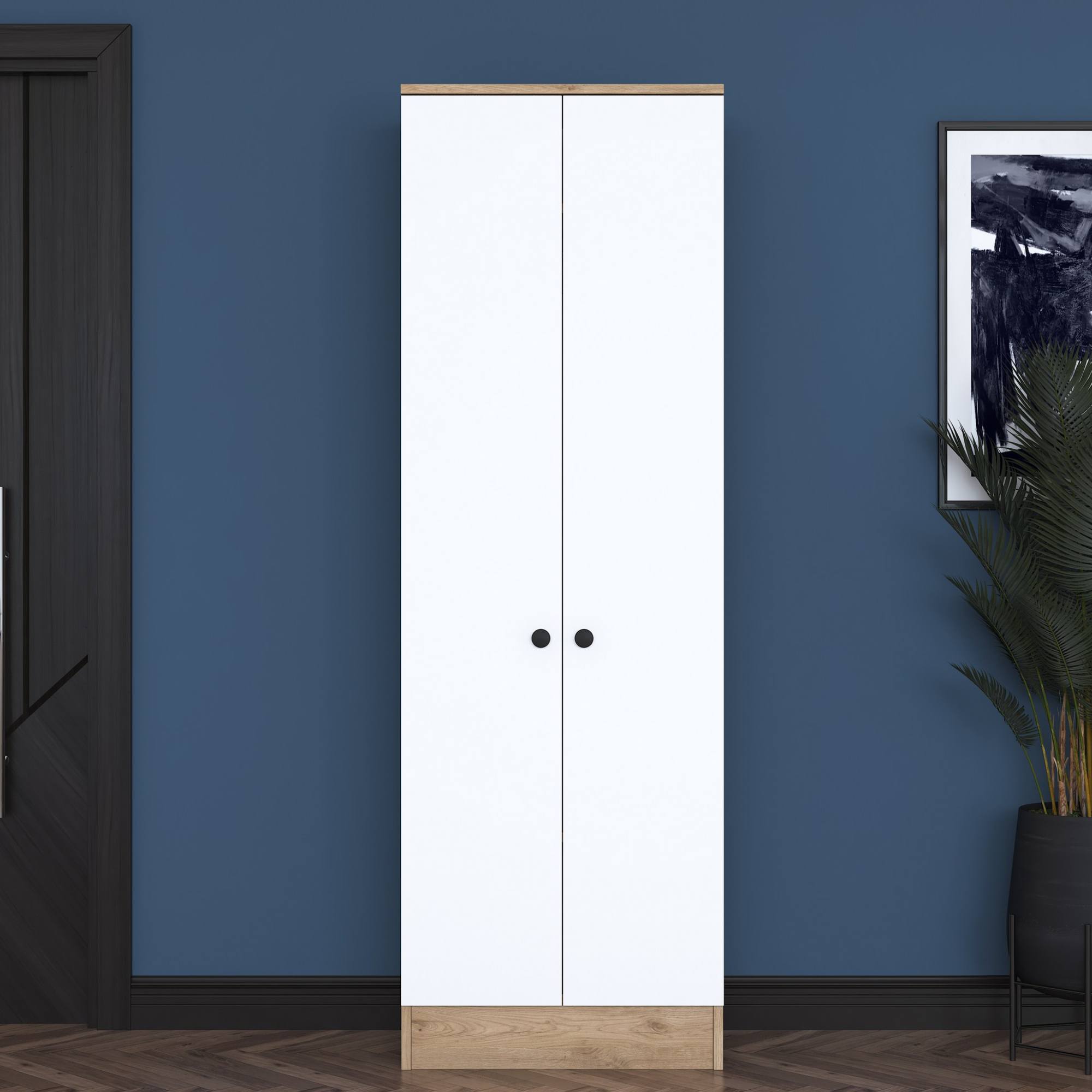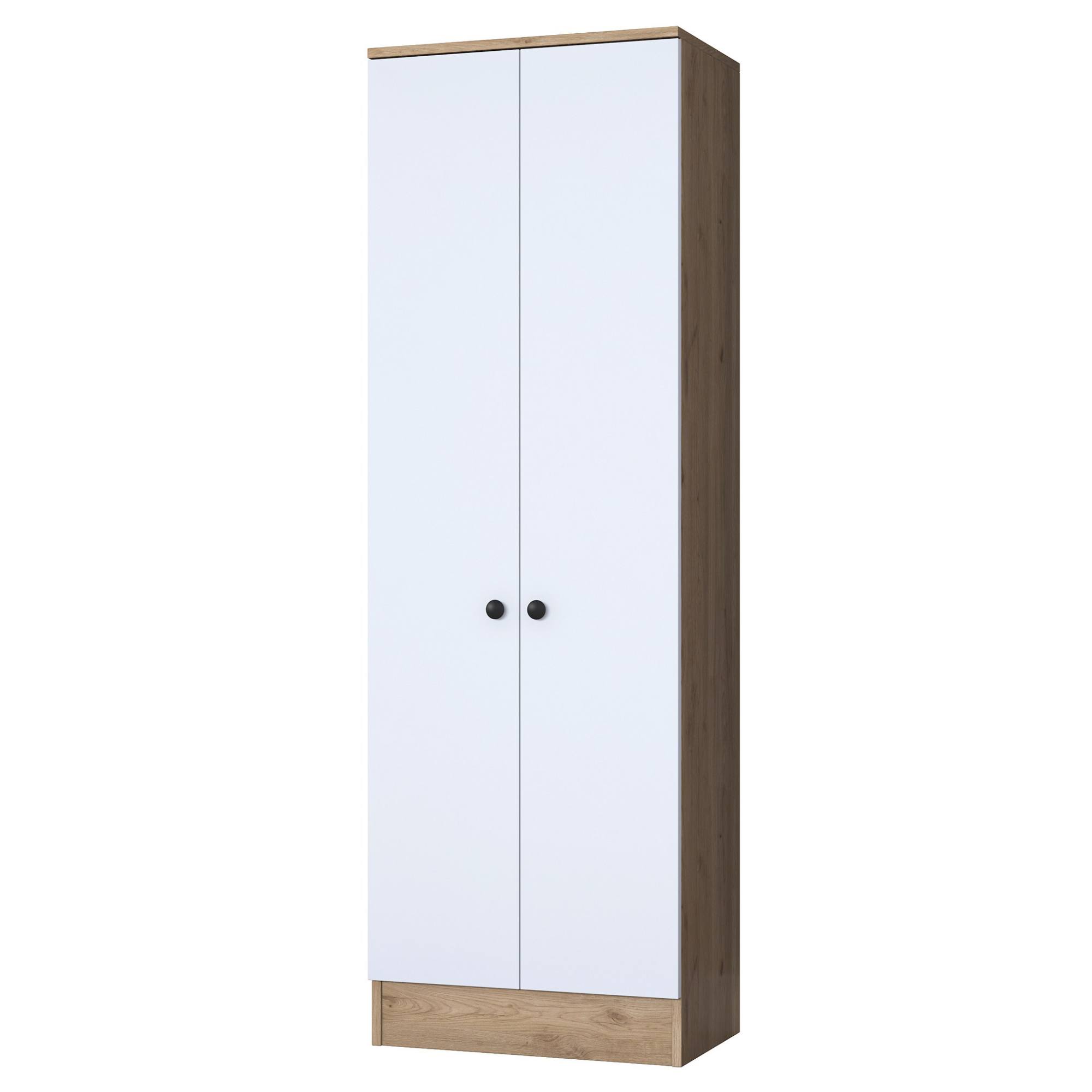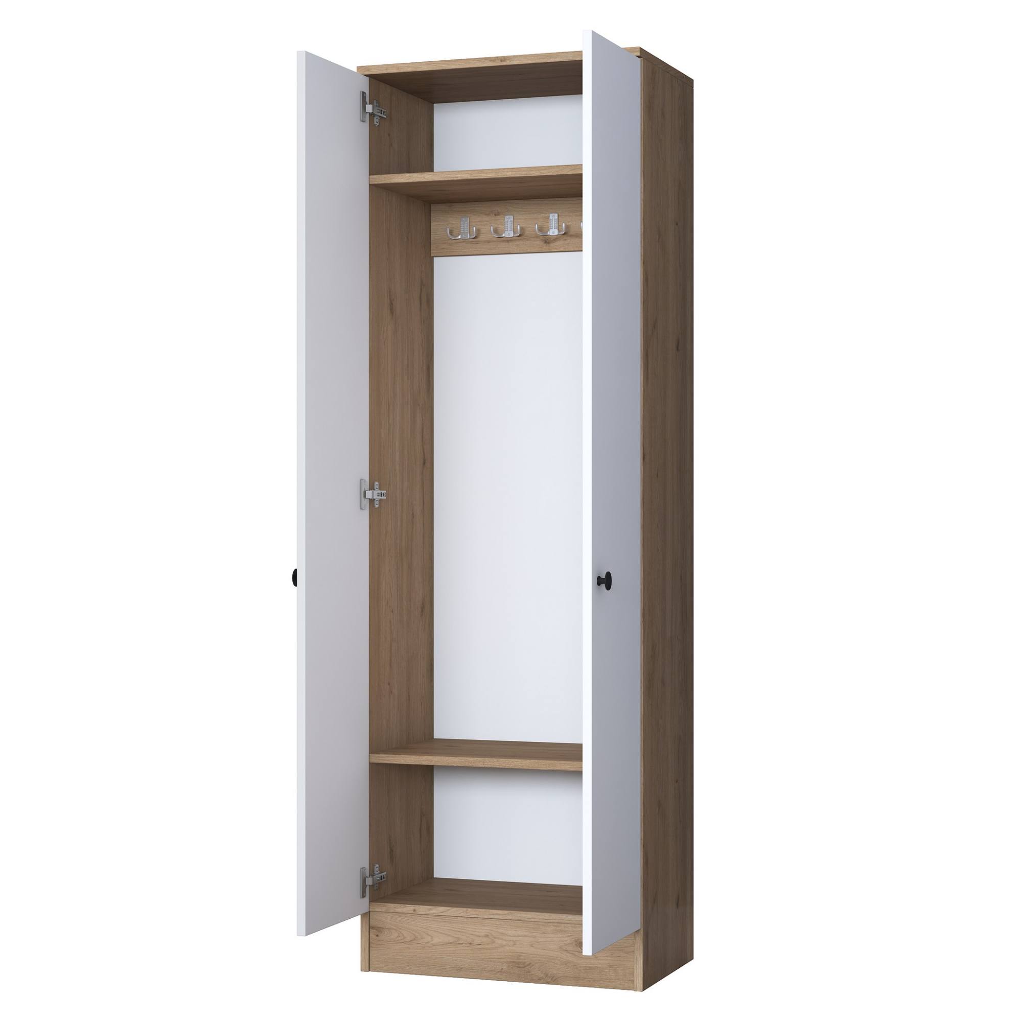 Skříň nabízí dostatek úložného prostoru. Za jejími dveřmi, které jsou pro lepší manipulaci vybaveny úchyty, se nacházejí nejen 2 vložené police. Nechybí ani 5 dvojitých háčků, na které si můžete pověsit bundy, kabáty i módní doplňky.