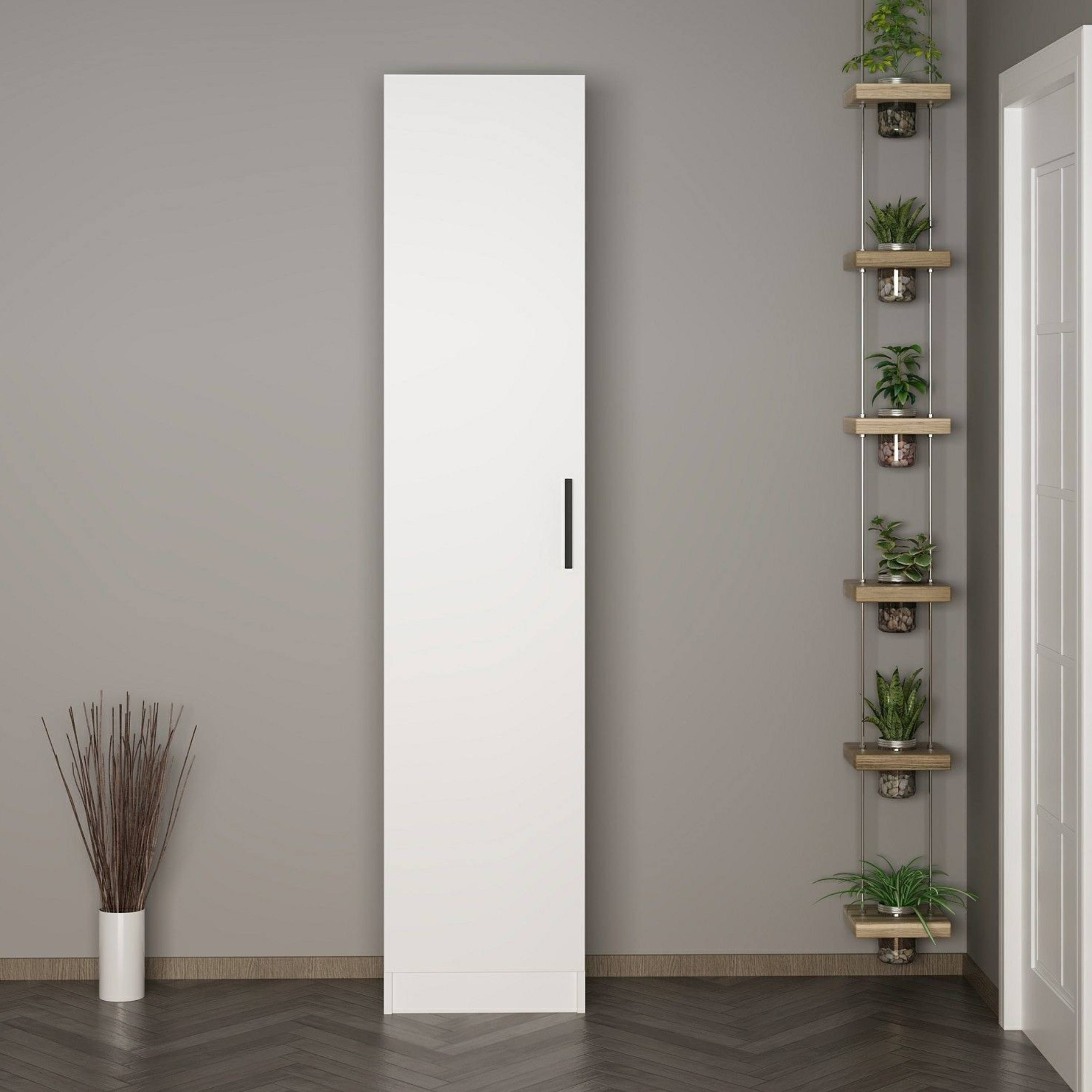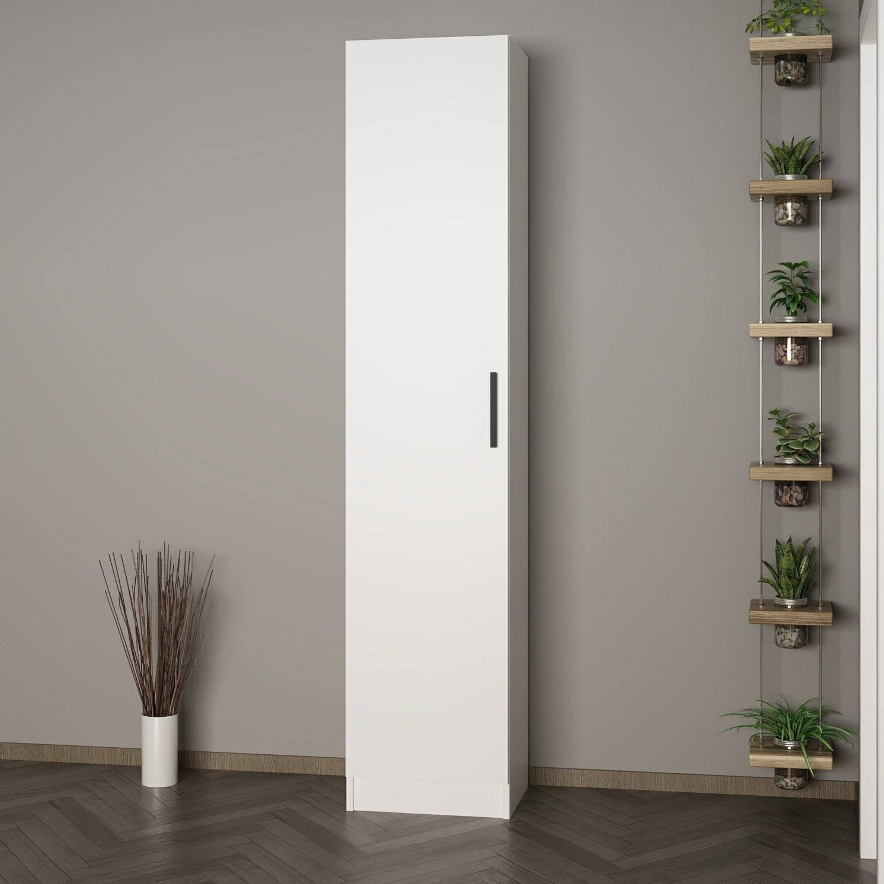 Skříň nabízí dostatek uzavíratelného úložného prostoru pro přehledné uložení vaší obuvi, doplňků a dalších nezbytností. Vnitřní vybavení sestává celkem ze 6 vložených polic pro přehledné skladování. Konstrukce je vybavena otočnými dveřmi, které jsou osazeny praktickým úchytem pro snadnou každodenní manipulaci. Skříň je vyrobena z laminovaného dřevěného materiálu s povrchem nenáročným na údržbu. Díky úzkému provedení snadno zapadne i do menších prostor.