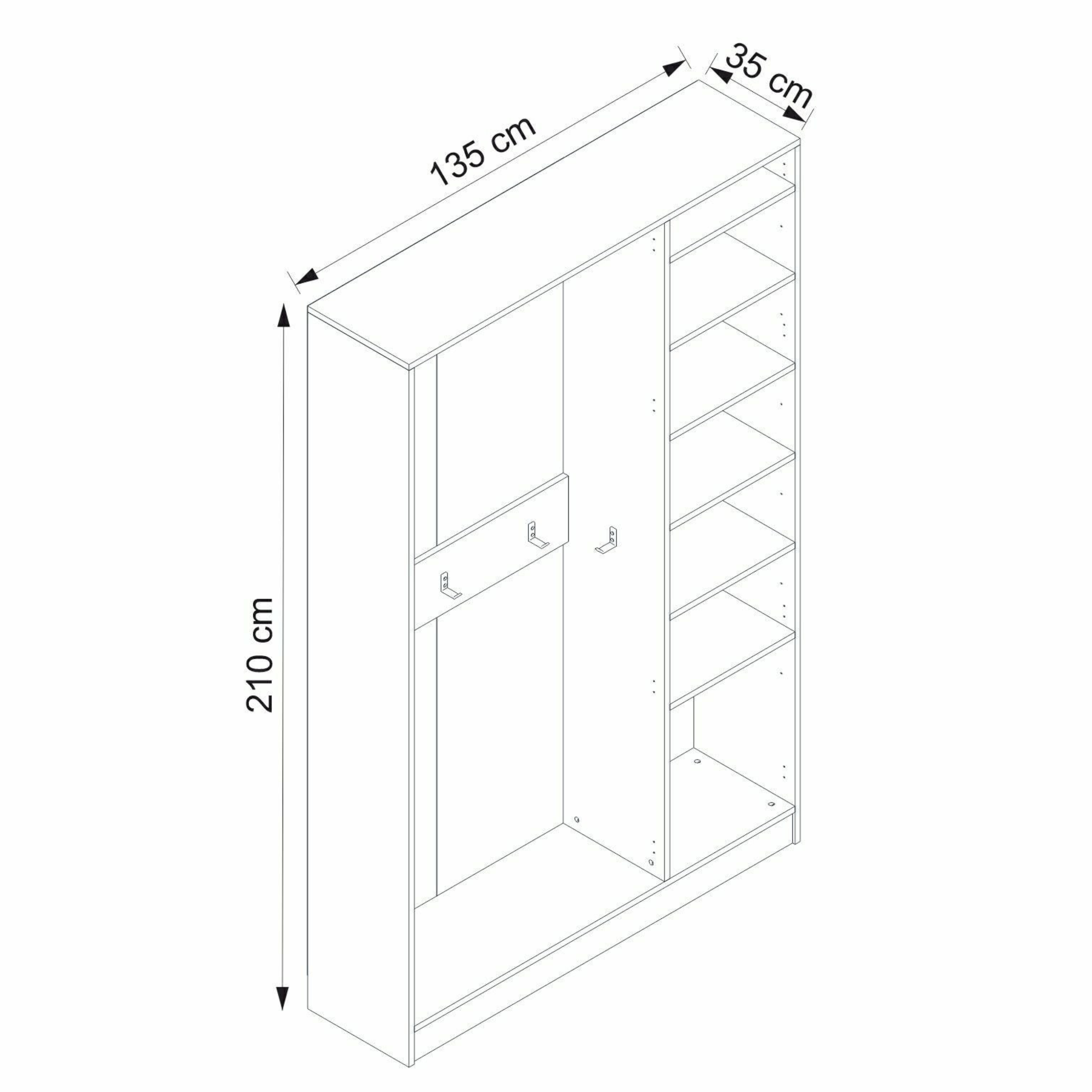 Skříň nabízí dostatek uzavíratelného úložného prostoru pro přehledné uložení vašich svršků, obuvi, doplňků a dalších nezbytností. Vnitřní vybavení sestává celkem ze 6 odkládacích háčků a 6 vložených polic. Konstrukce je vybavena otočnými dveřmi, které jsou osazeny praktickými úchyty. Skříň je vyrobena z laminovaného dřevěného materiálu s povrchem nenáročným na údržbu.