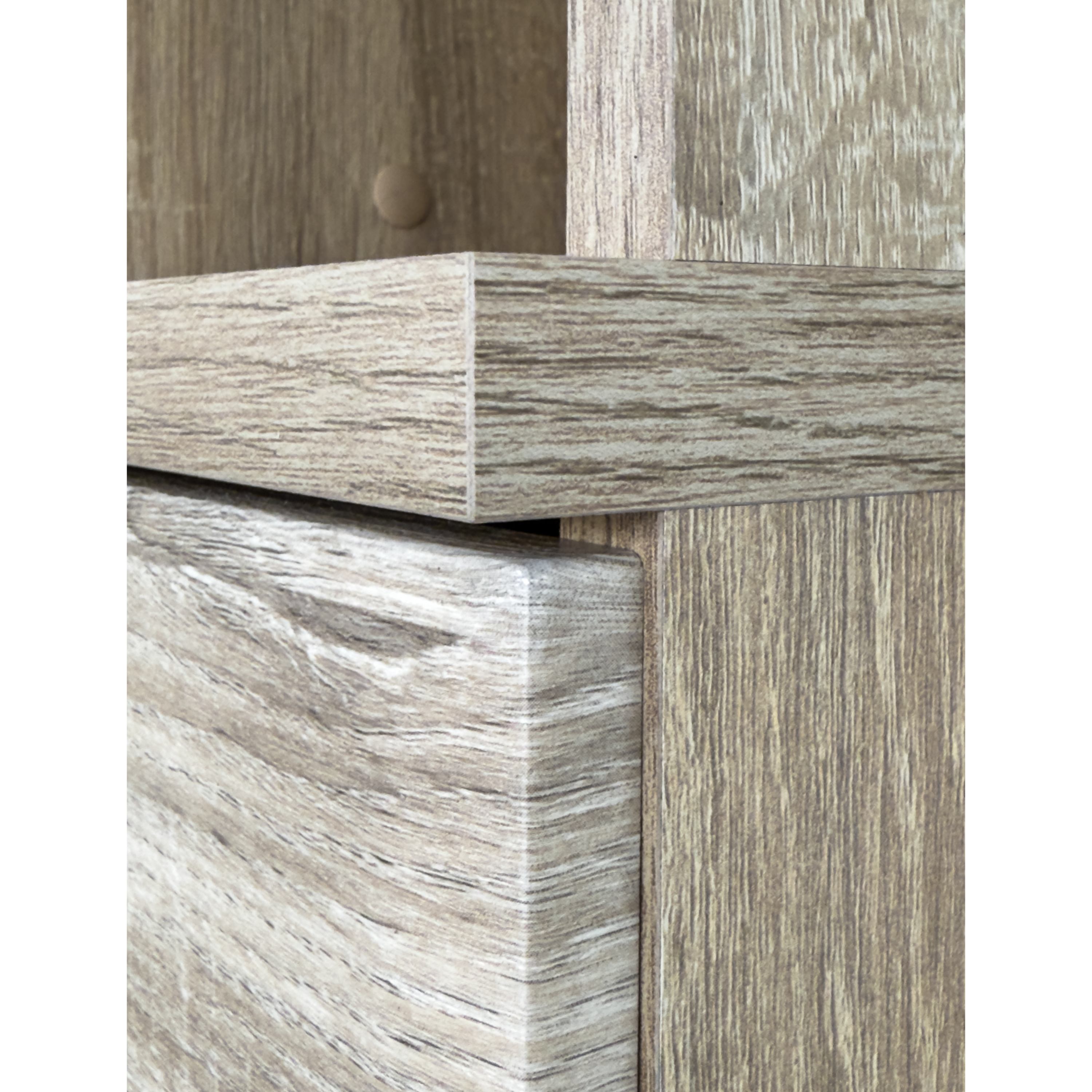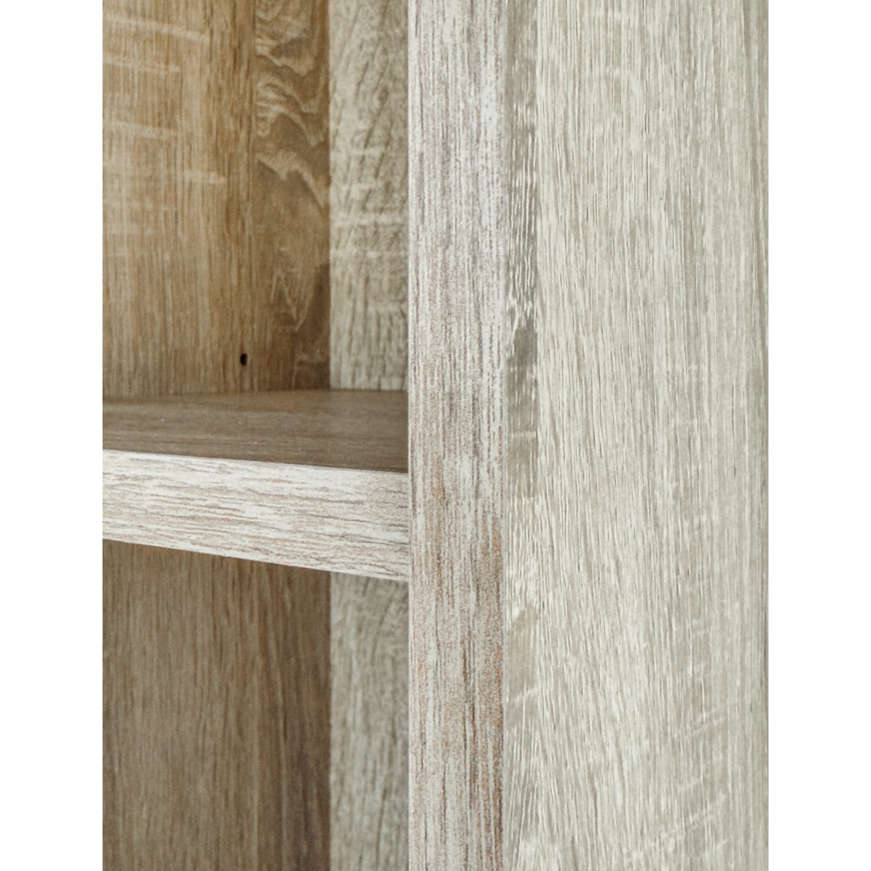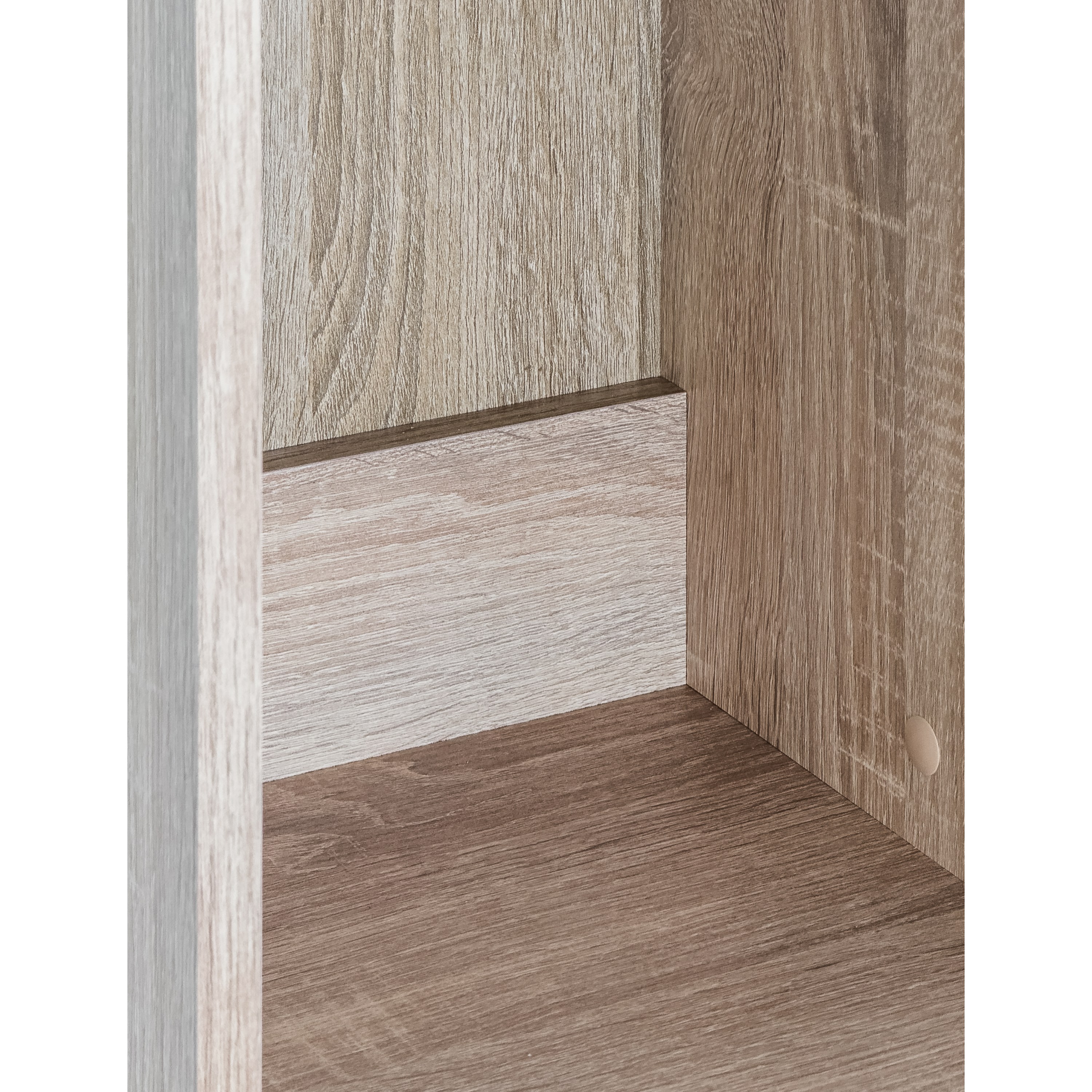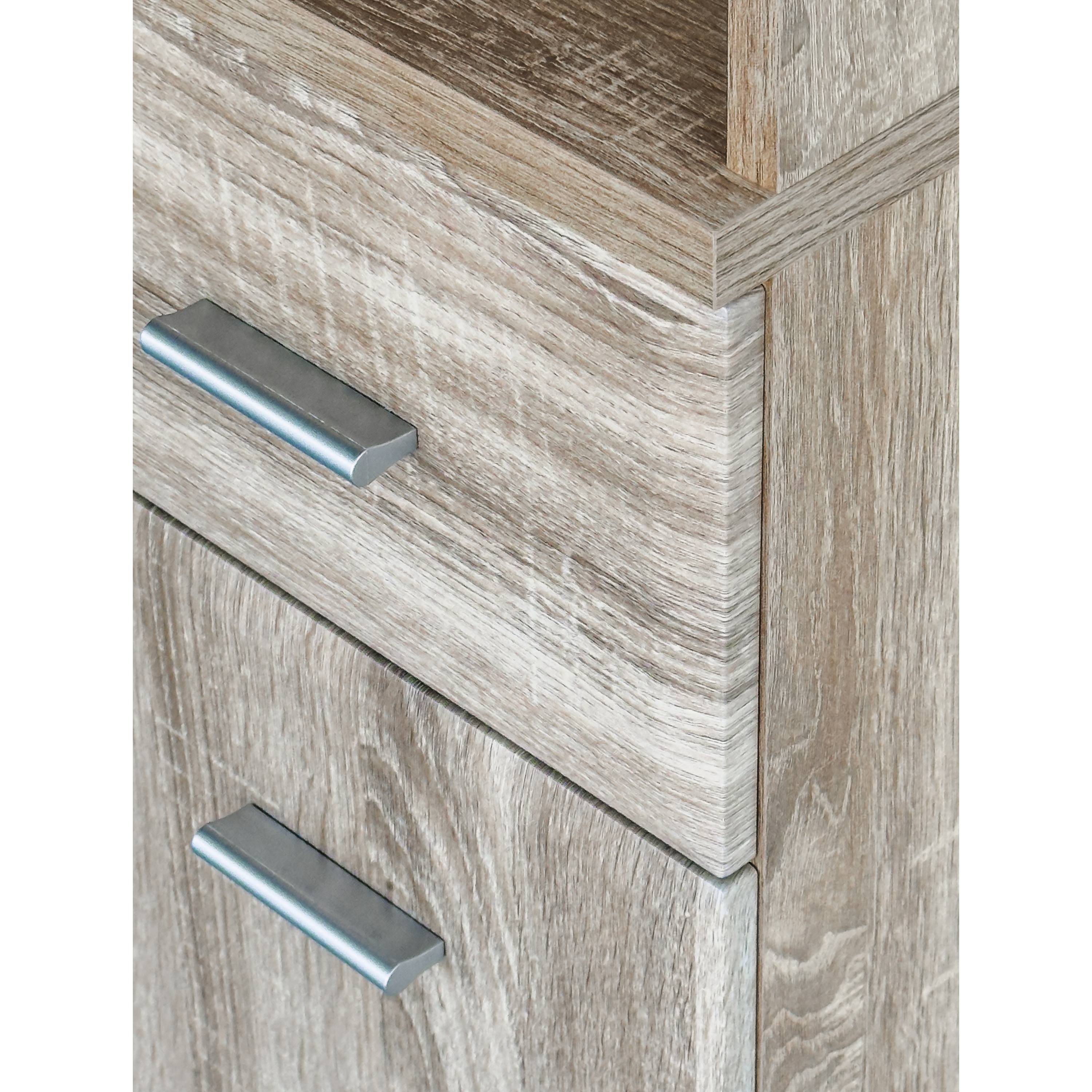 Vyrobena je z laminovaného dřevovláknitého materiálu MDF, který se vyznačuje snadnou udržovatelností i dlouhou životností. Dekor dubu sonoma pak vnese do interiéru nádech přírody. Skříň je členěna do tří úložných sekcí – horní otevřené se dvěma policemi, spodní dvířkově uzavíratelné (rovněž se dvěma policemi) a centrální se zásuvkou. Manipulaci usnadní plastové úchyty.