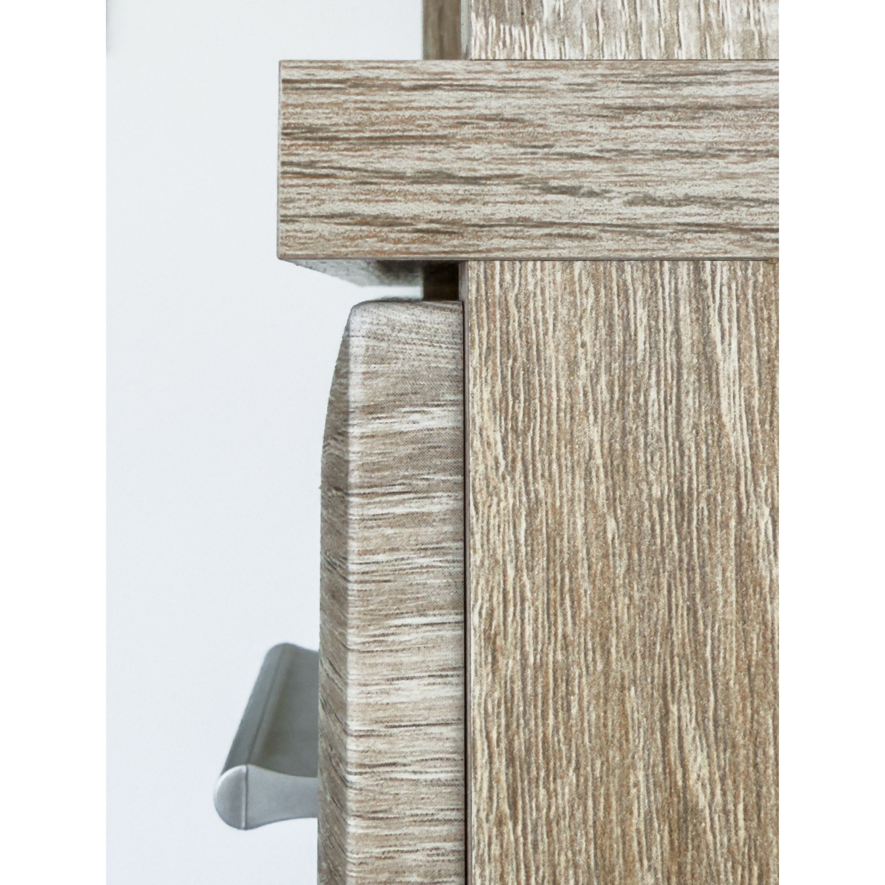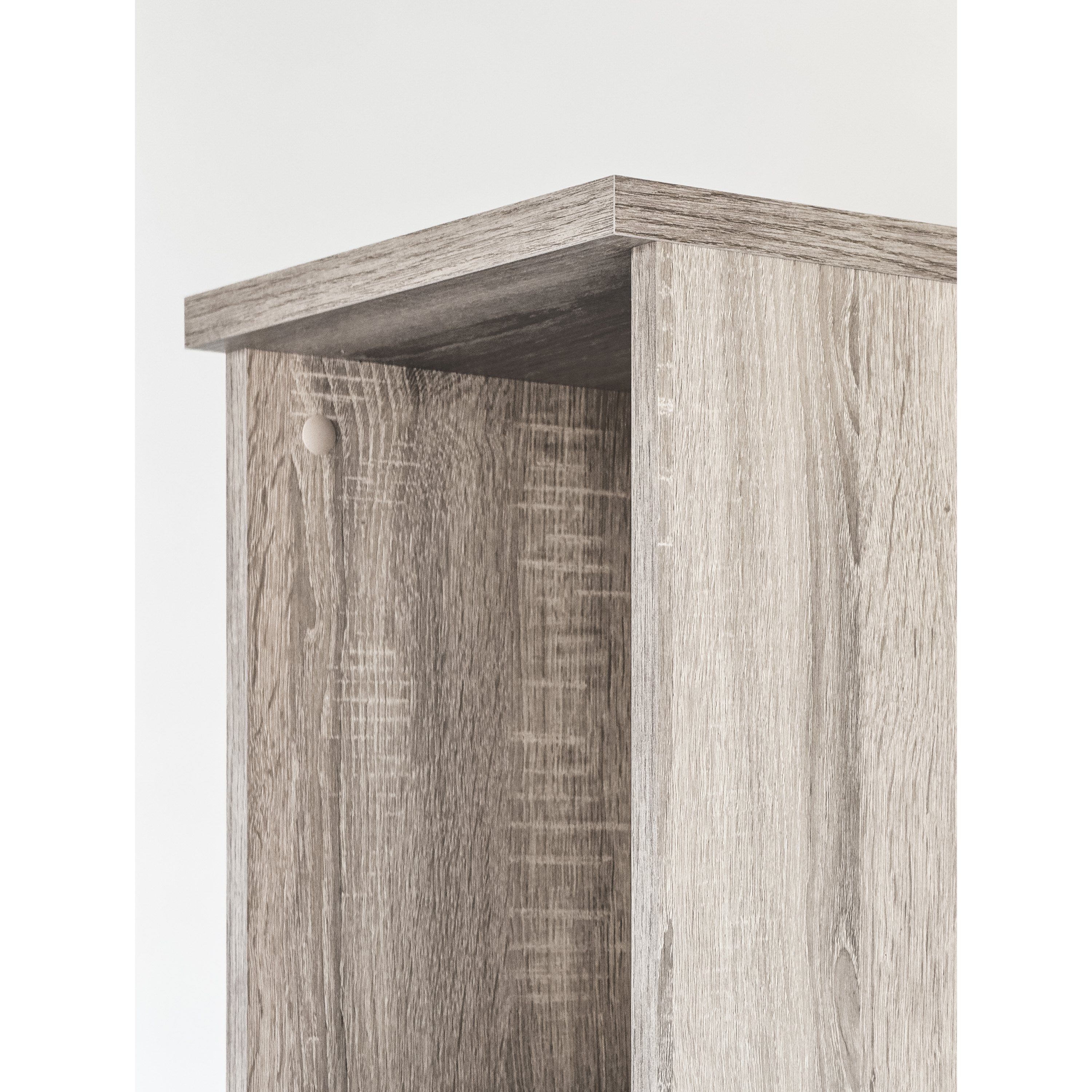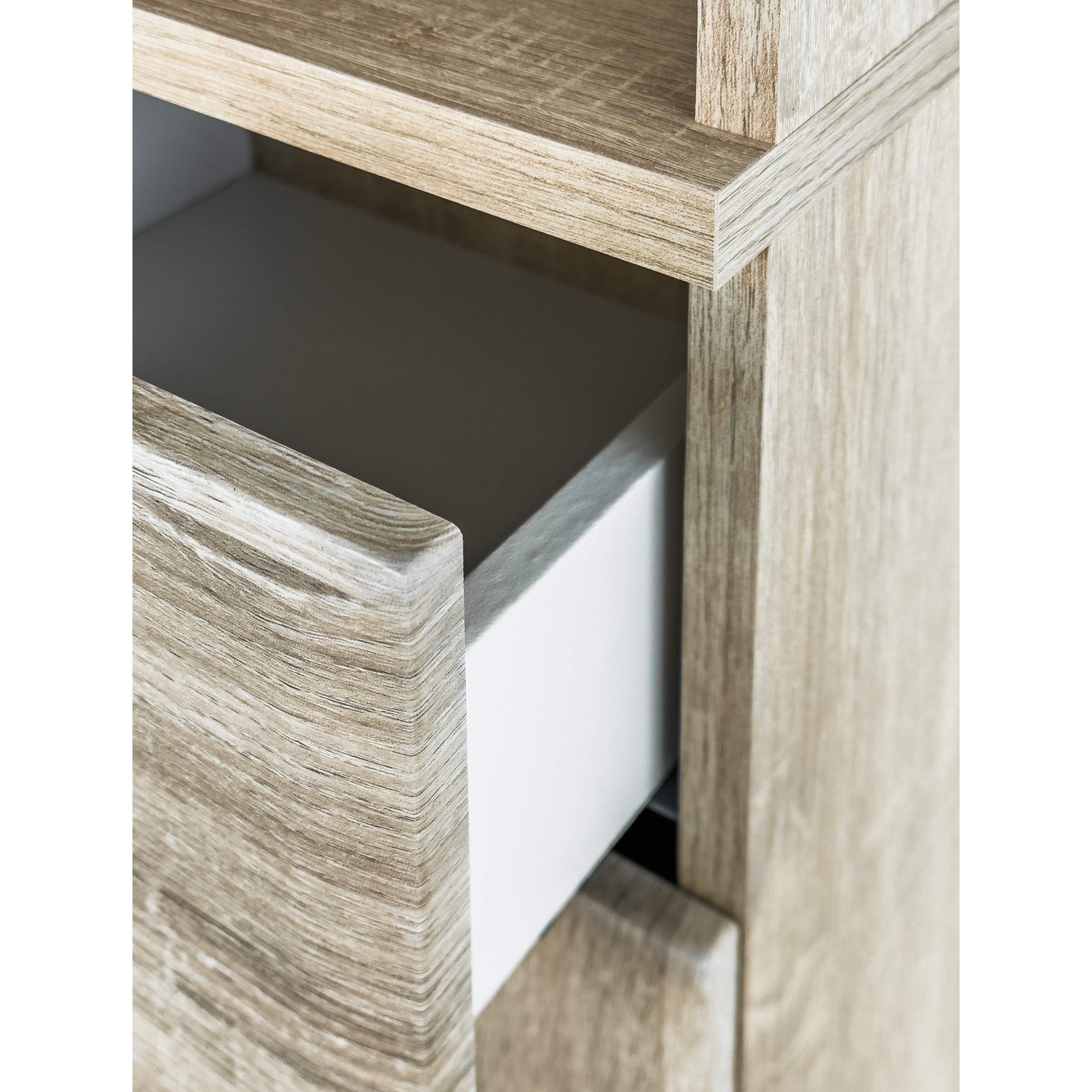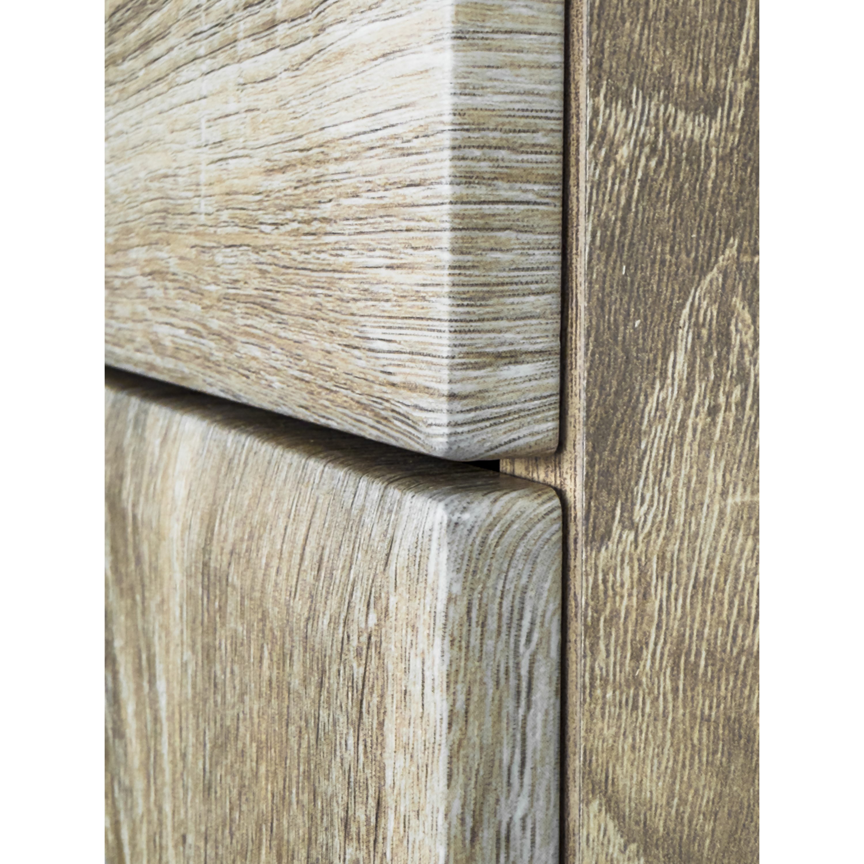 Vyrobena je z laminovaného dřevovláknitého materiálu MDF, který se vyznačuje snadnou udržovatelností i dlouhou životností. Dekor dubu sonoma pak vnese do interiéru nádech přírody. Skříň je členěna do tří úložných sekcí – horní otevřené se dvěma policemi, spodní dvířkově uzavíratelné (rovněž se dvěma policemi) a centrální se zásuvkou. Manipulaci usnadní plastové úchyty.