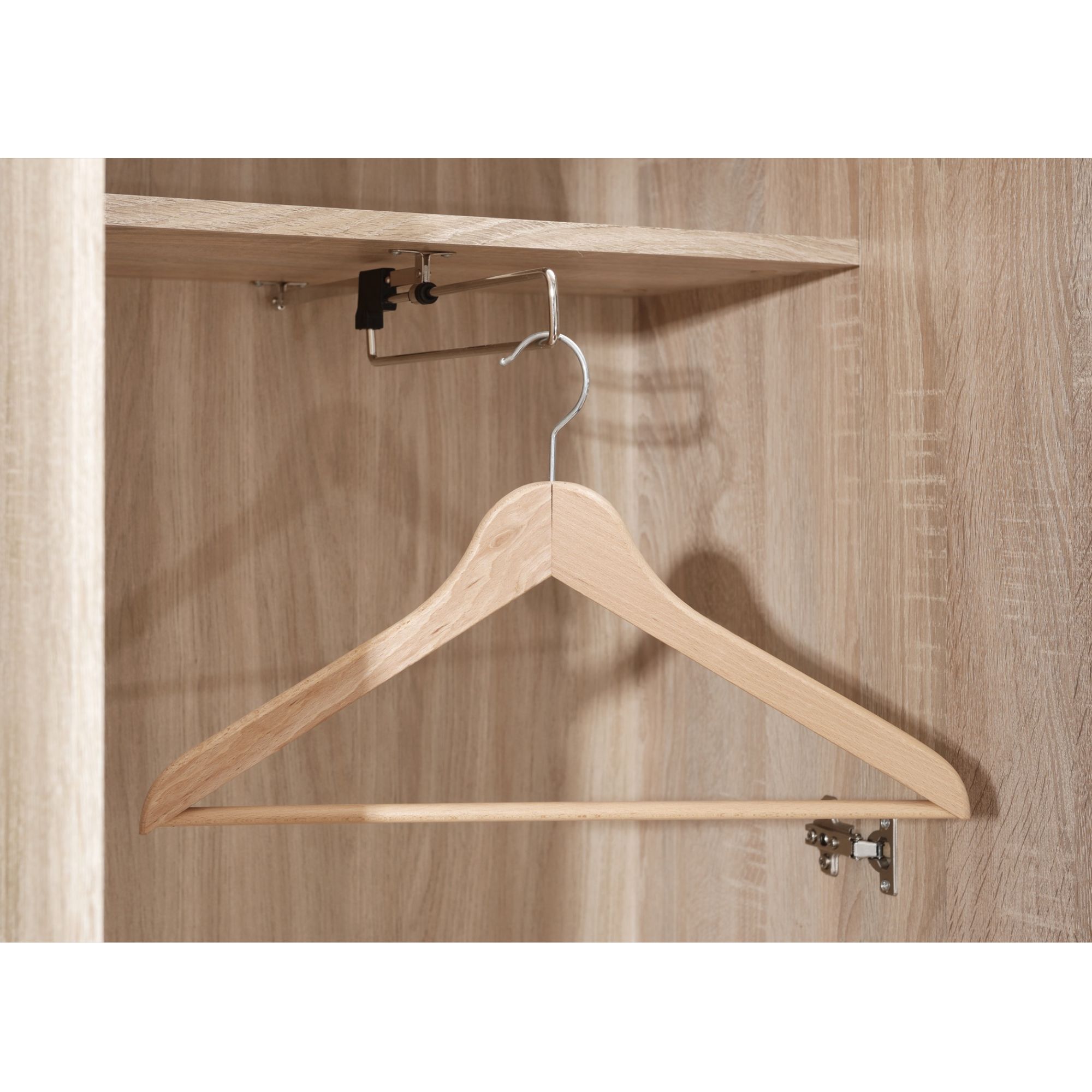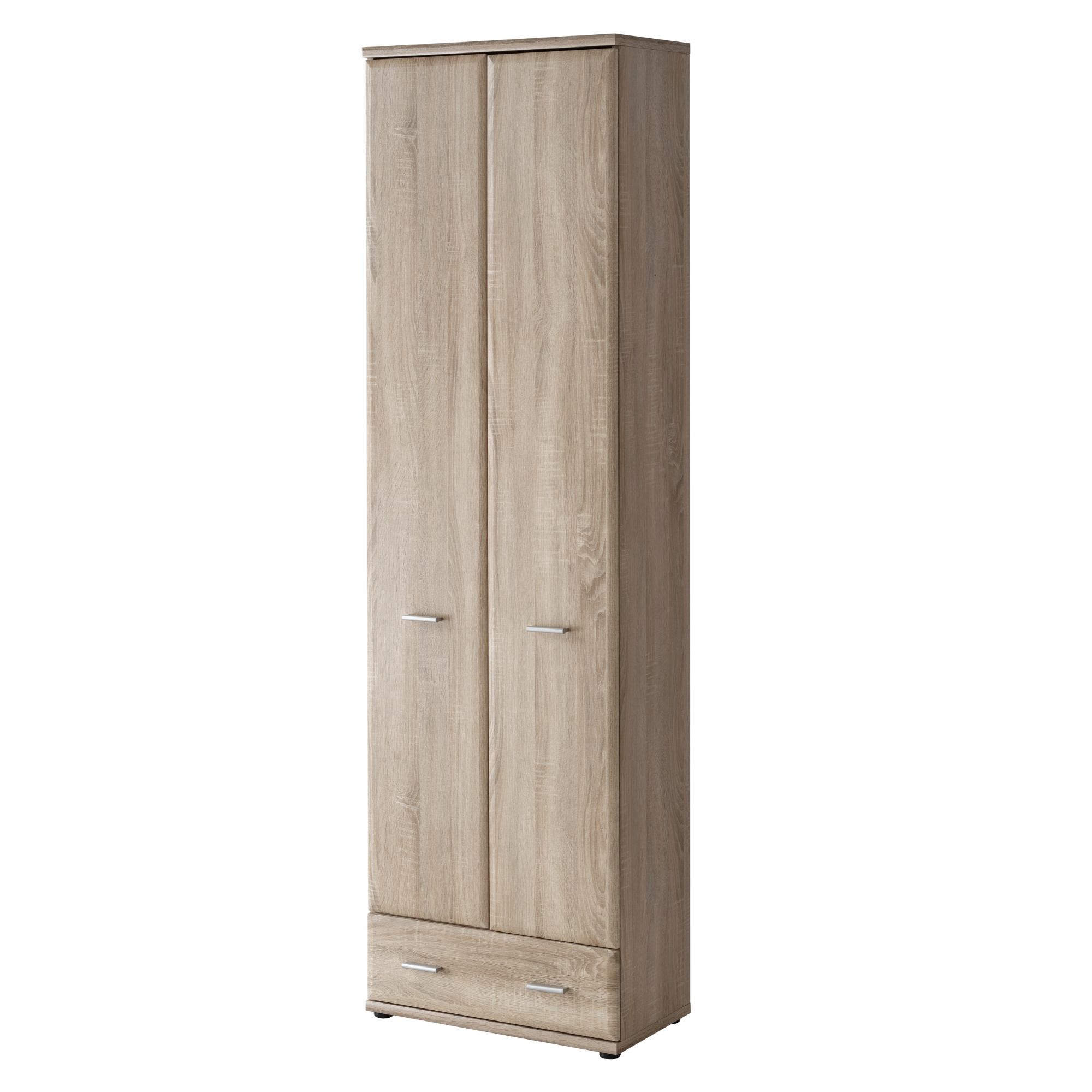 Vyrobena je z laminovaného dřevovláknitého materiálu MDF, který se vyznačuje snadnou udržovatelností i dlouhou životností. Dekor dubu sonoma pak vnese do interiéru nádech přírody. Dvířka skrývají dostatečný úložný prostor se dvěma policemi a šatní tyčí. Ve spodní části je pak zásuvka na drobnosti. Manipulaci usnadní praktické plastové úchyty.