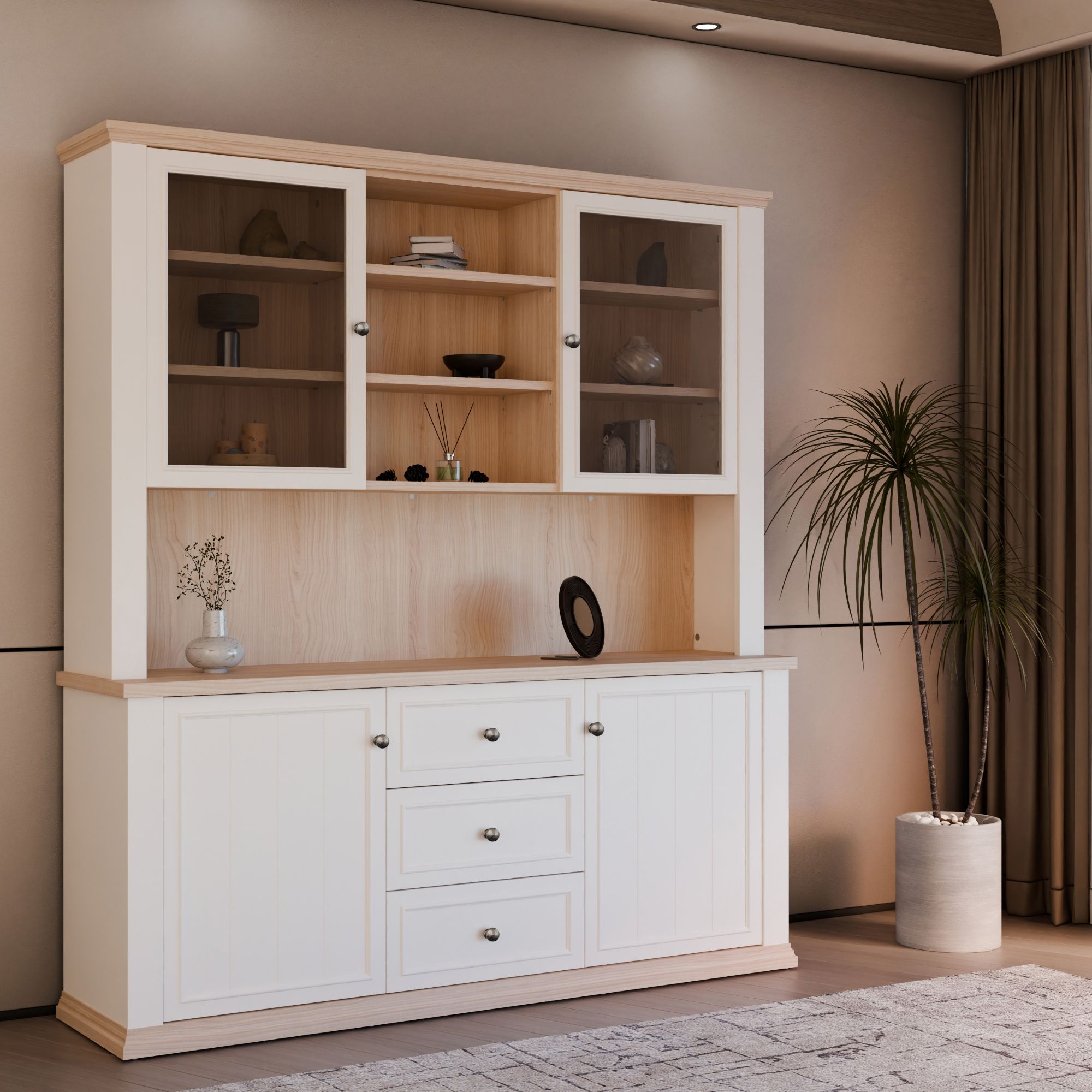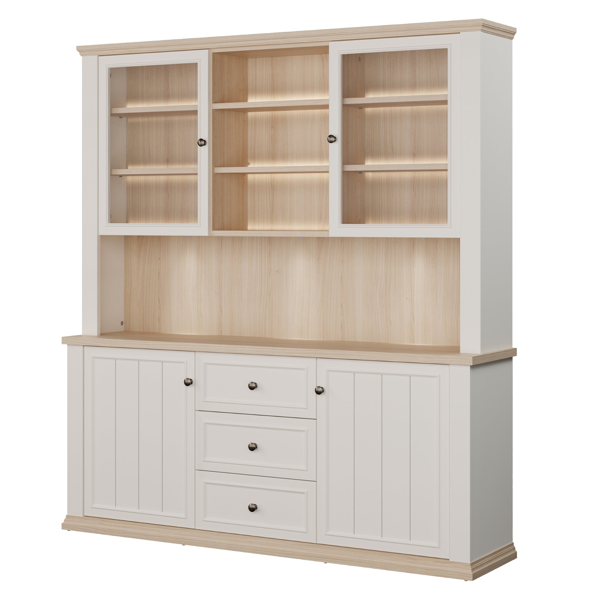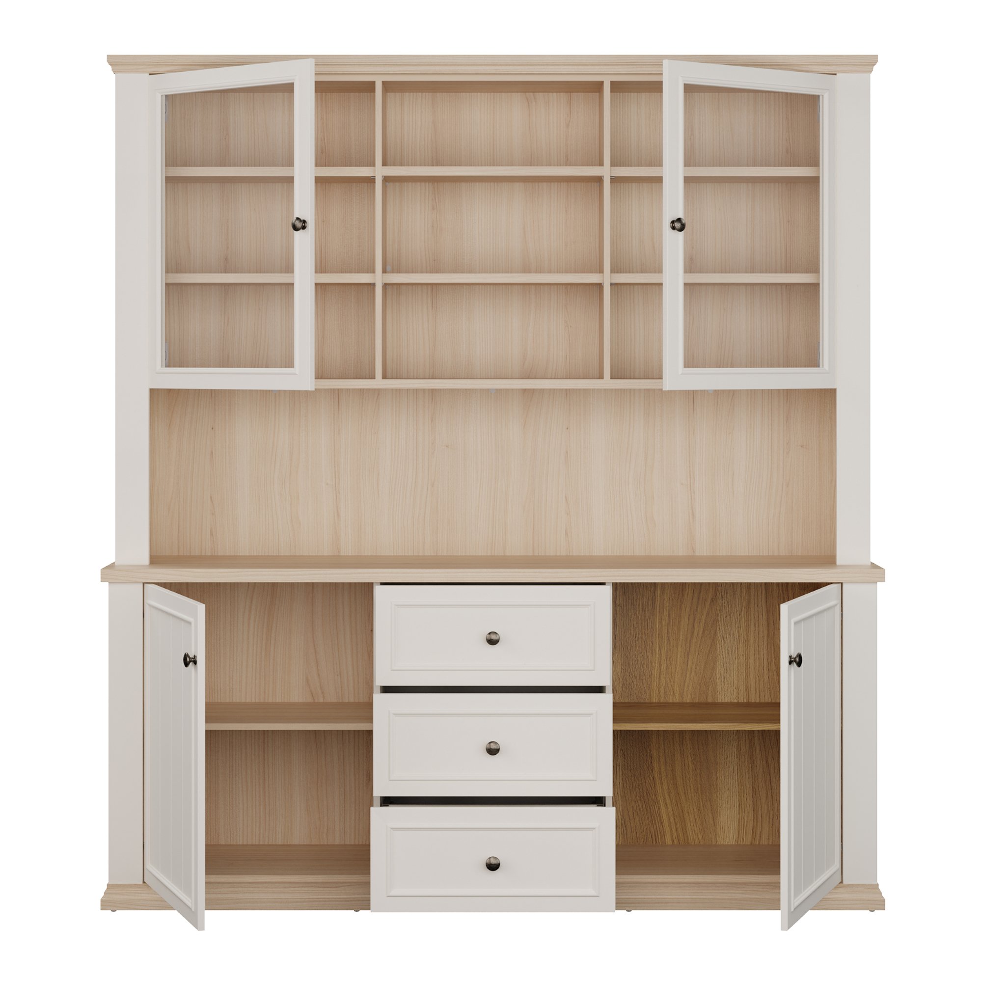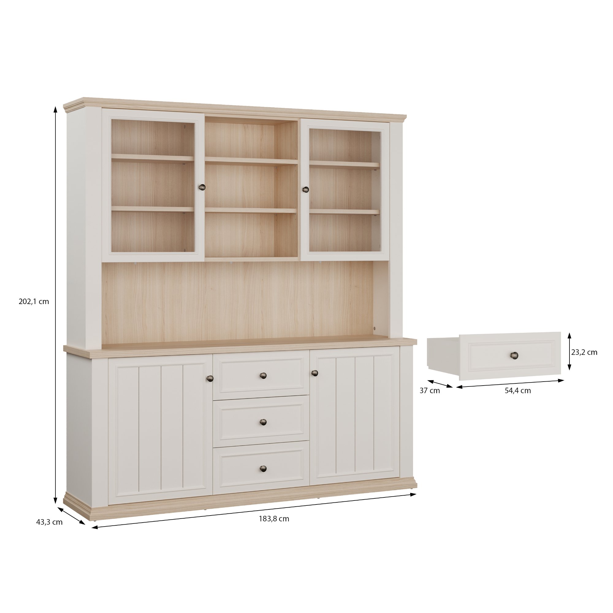 Součástí příborníku je nejen 8 vložených polic, ale i 3 zásuvky. Aby se s dvířky i zásuvkami dobře manipulovalo, jsou vybaveny úchyty. K příborníku je možné dokoupit LED osvětlení, díky kterému předměty vystavené za prosklenými dvířky budou moct vyniknout naplno.