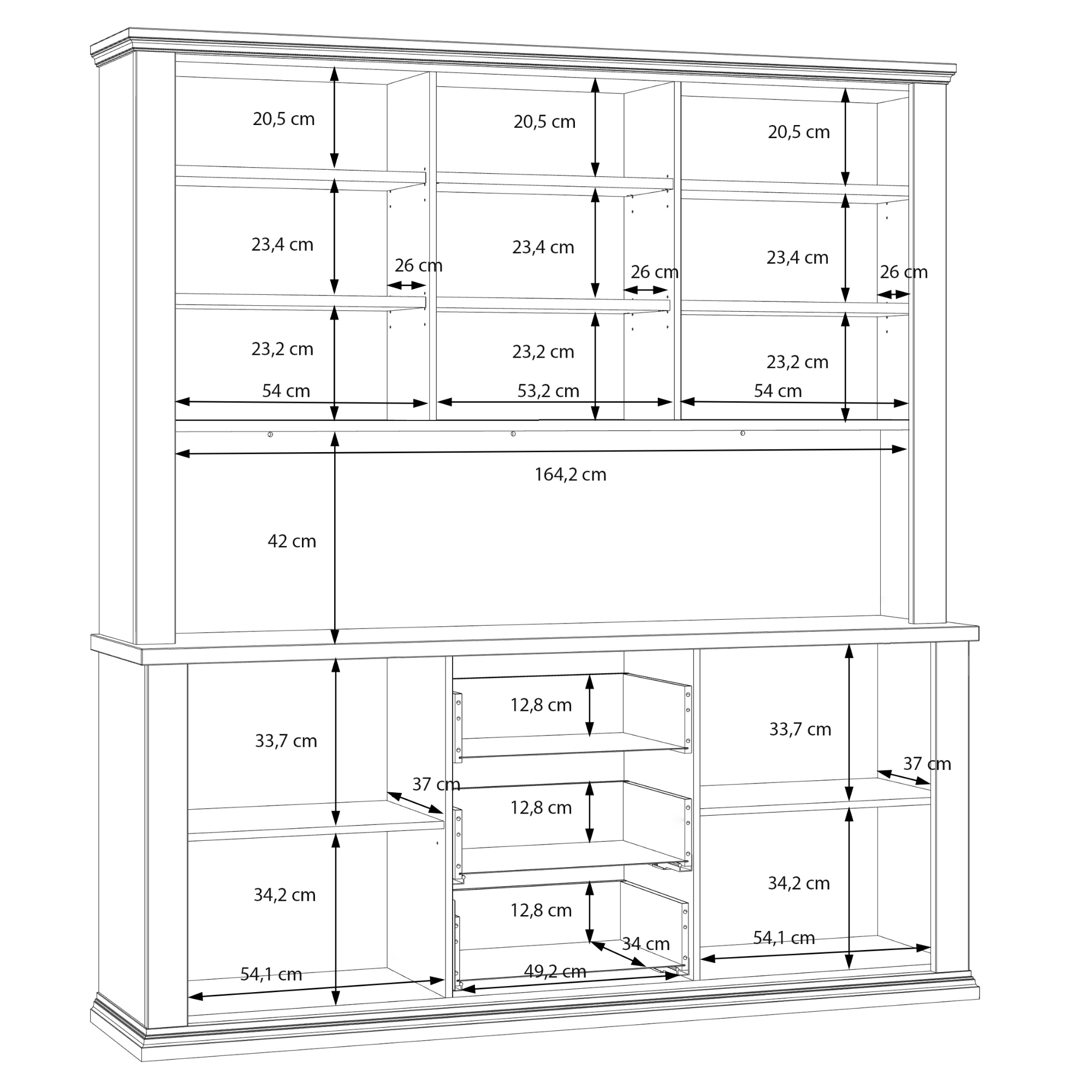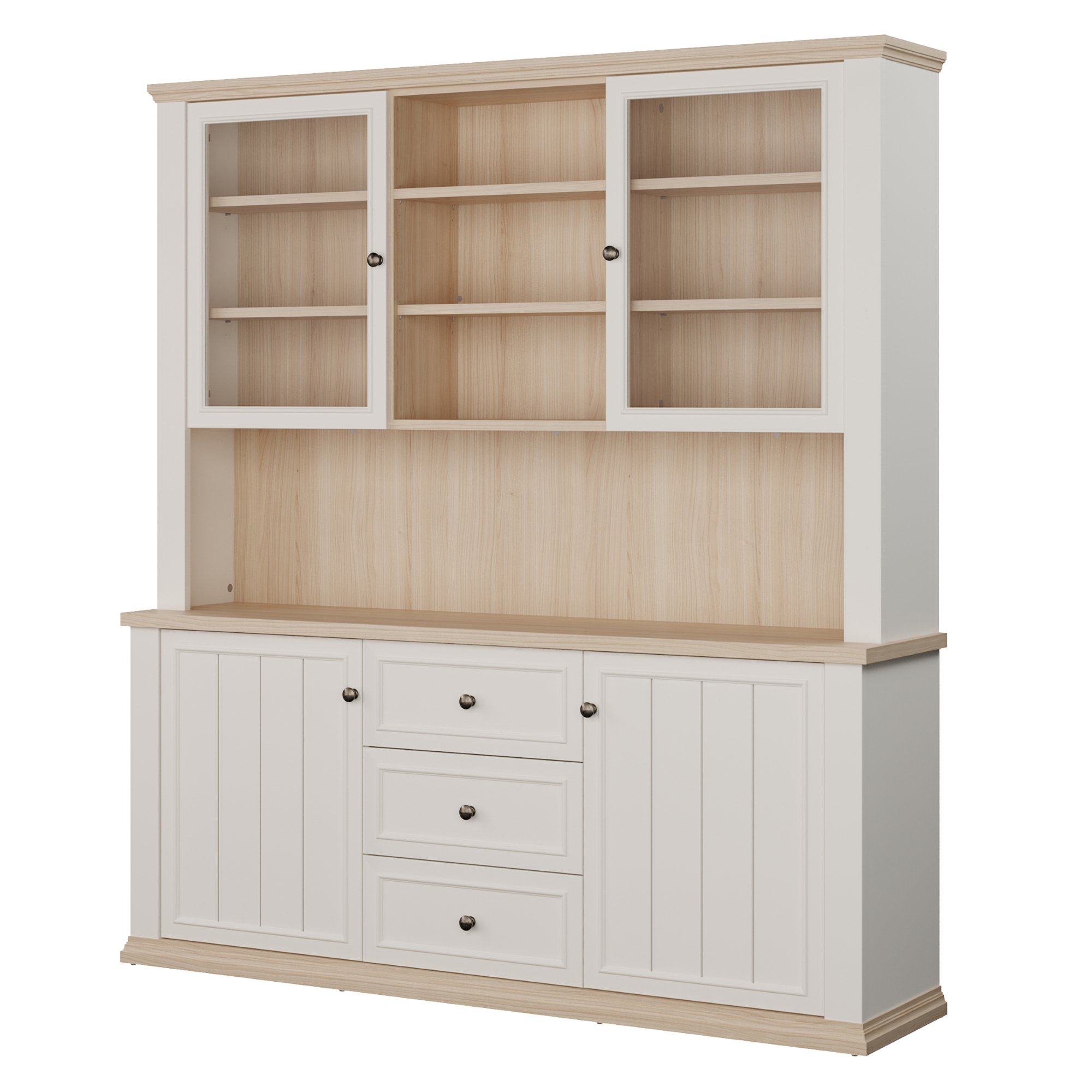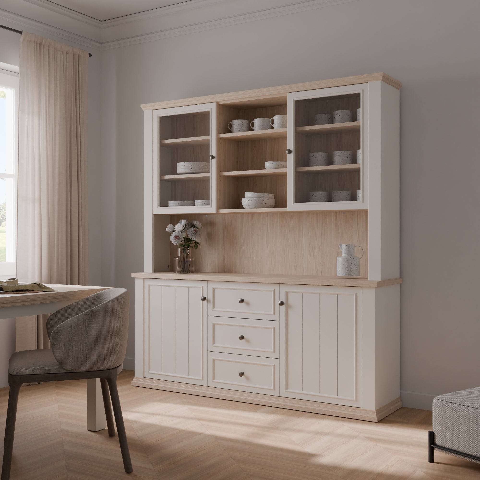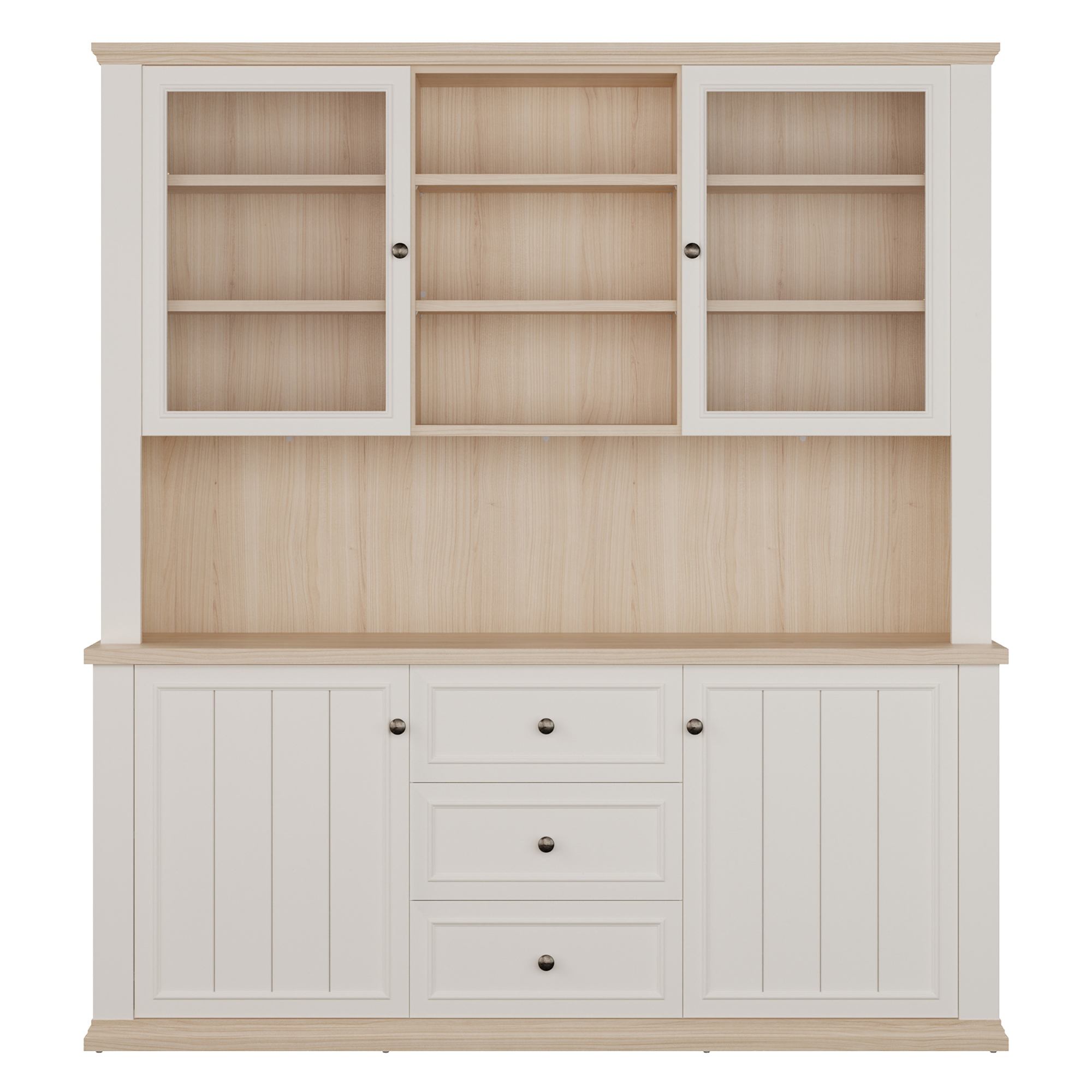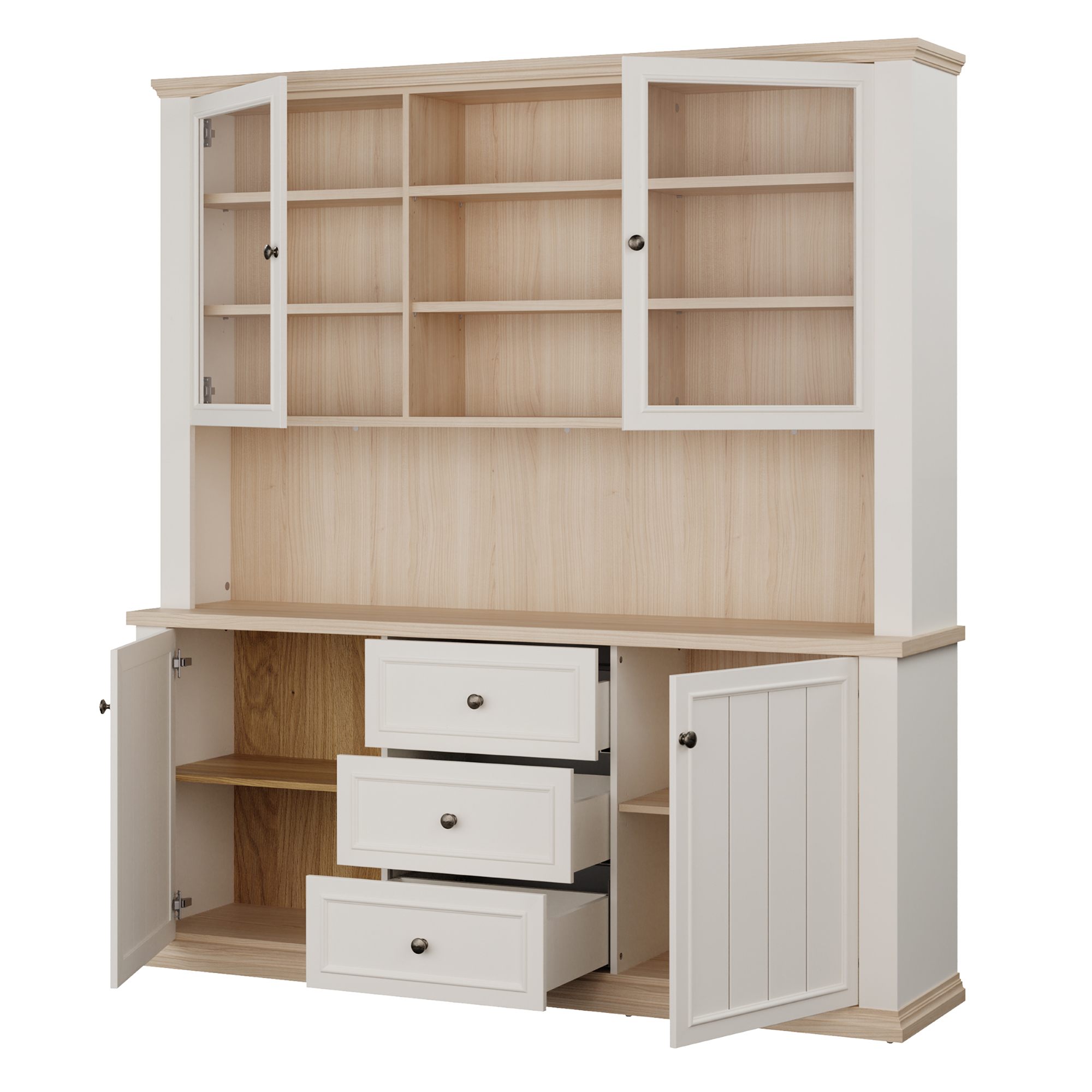 Součástí příborníku je nejen 8 vložených polic, ale i 3 zásuvky. Aby se s dvířky i zásuvkami dobře manipulovalo, jsou vybaveny úchyty. K příborníku je možné dokoupit LED osvětlení, díky kterému předměty vystavené za prosklenými dvířky budou moct vyniknout naplno.