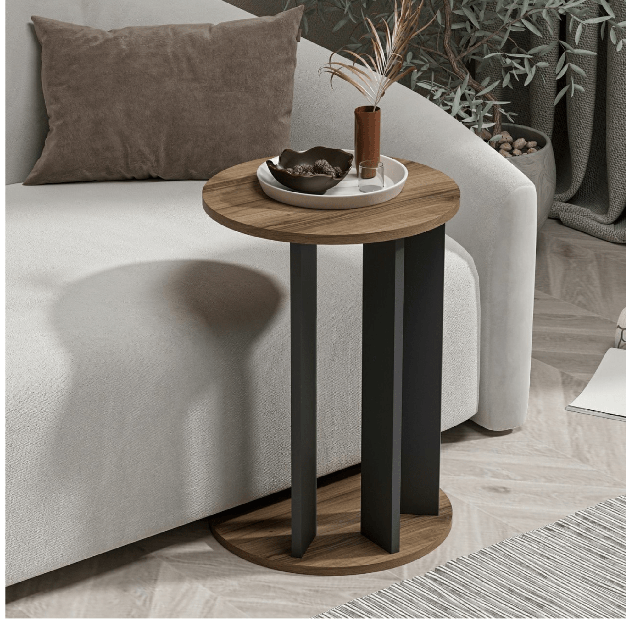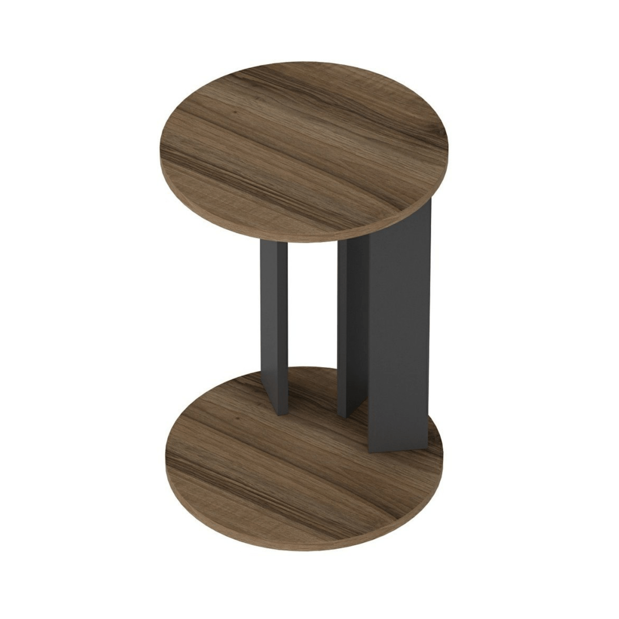 Vyrobený je z laminovaného dřevěného materiálu. Dostatečný odkládací prostor zajišťuje hlavní deska s průměrem 34 cm. Stabilitu má na starost podnož ze tří nosných desek v antracitovém odstínu. Odkládací deska a spodní základna je pak v dekoru ořechu. Ke křeslu na kávu, do rohu na kytku, k posteli a jednoduše kamkoli, kde potřebujete decentní odkládací prostor – univerzální přístavný stolek EMA najde uplatnění napříč celou domácností.