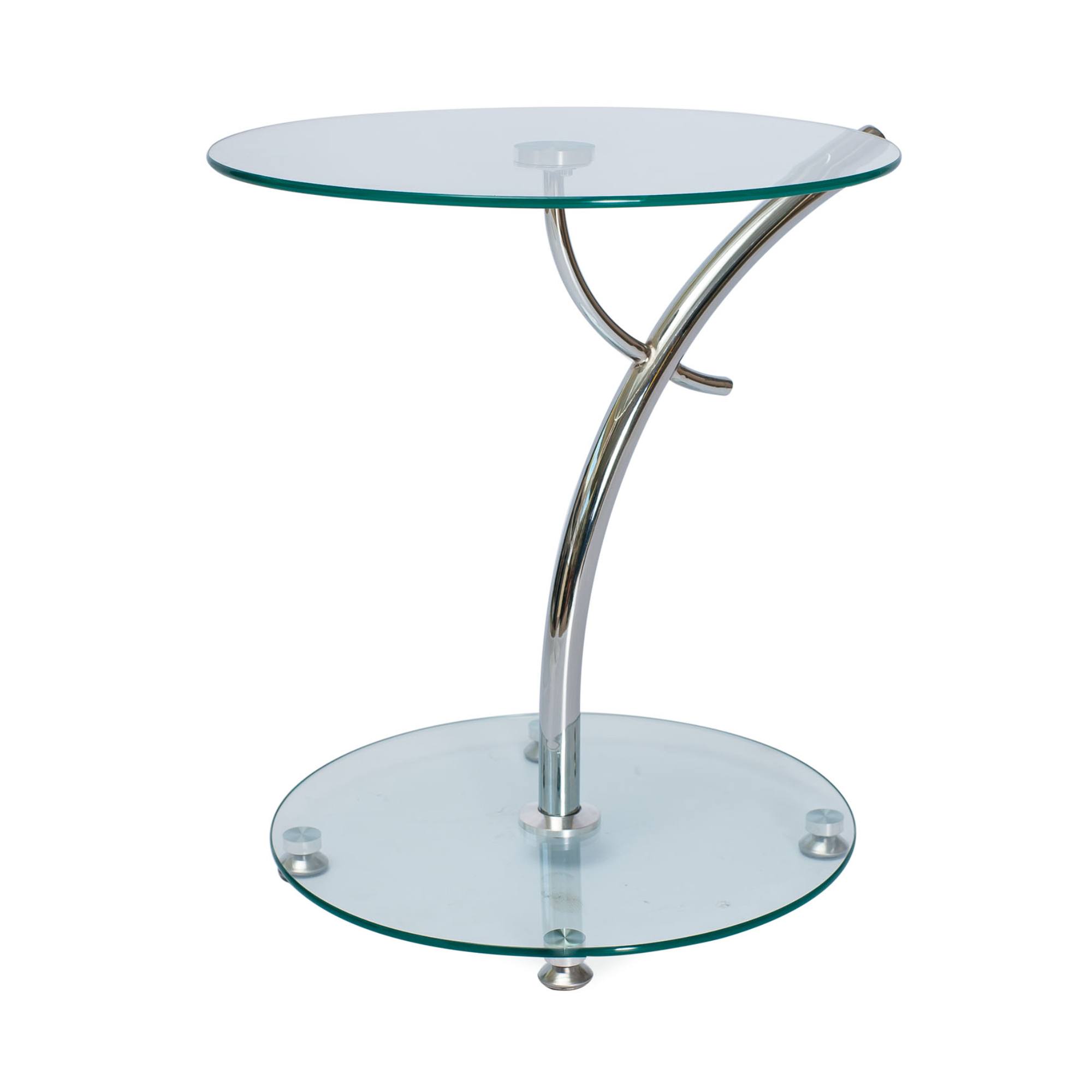 Kruhová odkládací deska je vyrobena z odolného tvrzeného skla. Maximální stabilitu pak zajišťuje designová středová konstrukce z kovu v chromové úpravě.