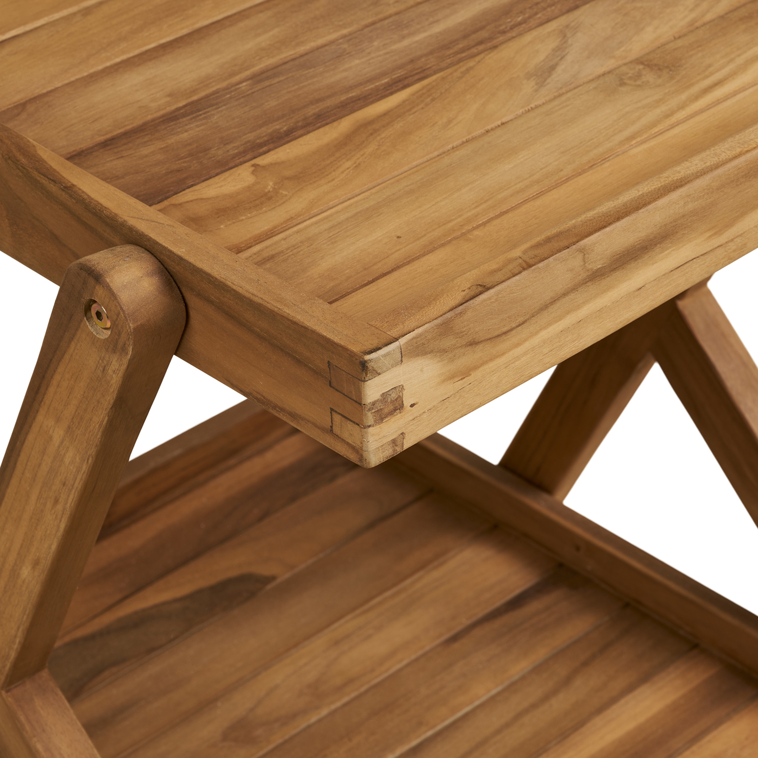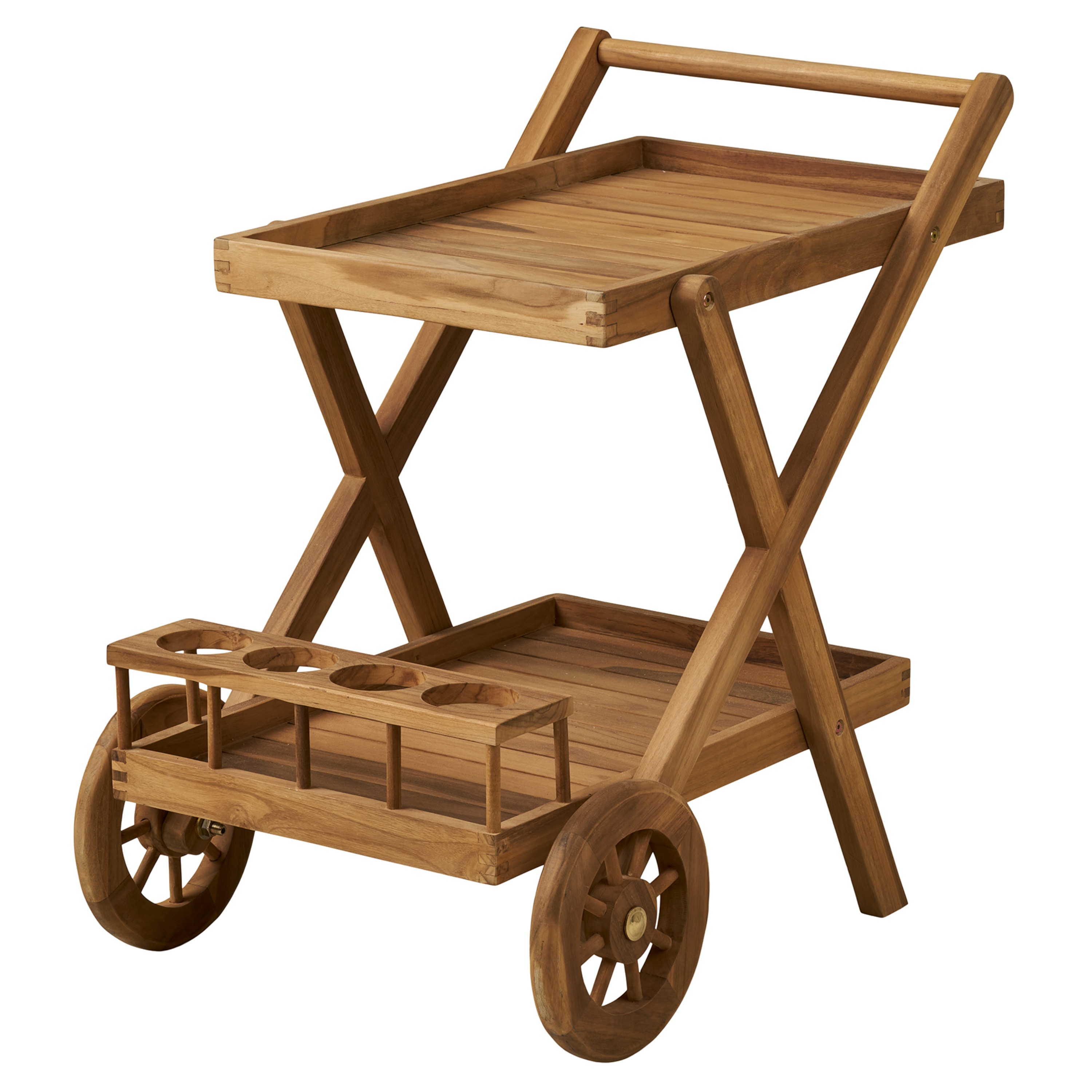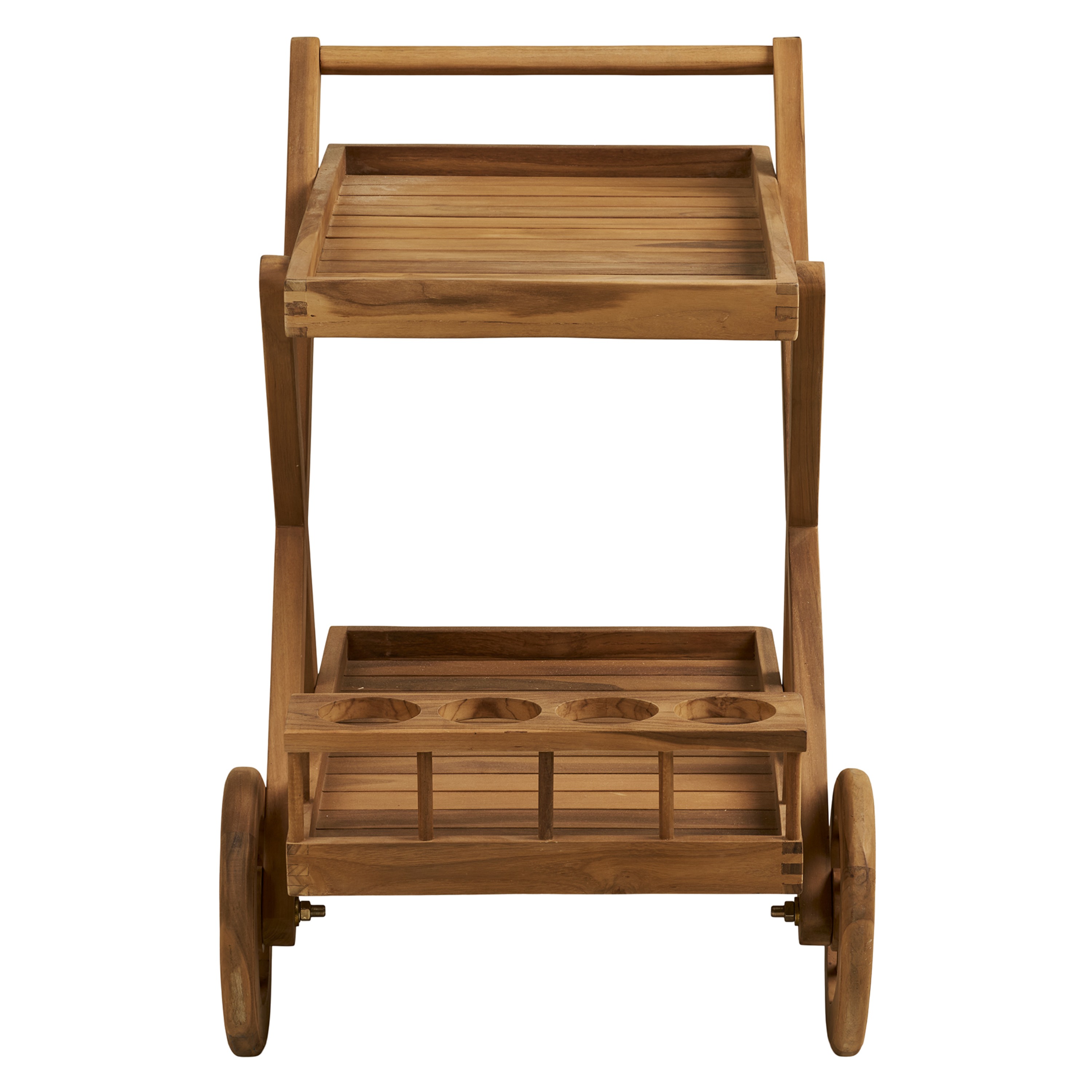 Vozík nabízí 2odkládací plochy, které poskytují dostatek prostoru pro servírování nápojů, občerstvení nebo uložení drobností. Spodní část je navíc doplněna o držák na lahve, který pomáhá udržet vše přehledně uspořádané. Díky kolečkům a praktickému madlu je manipulace s vozíkem snadná a pohodlná. Jeho konstrukce je vyrobena z teakového dřeva, které vyniká svou pevností, dlouhou životností a přirozenou odolností vůči vlhkosti.