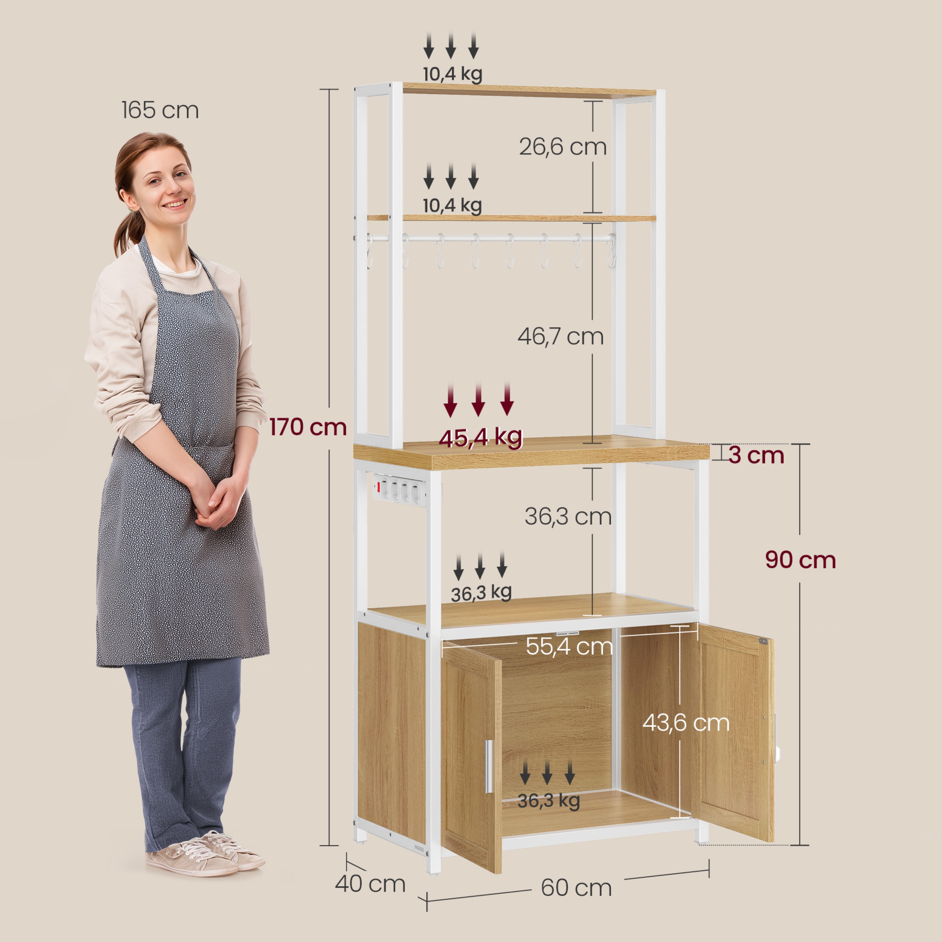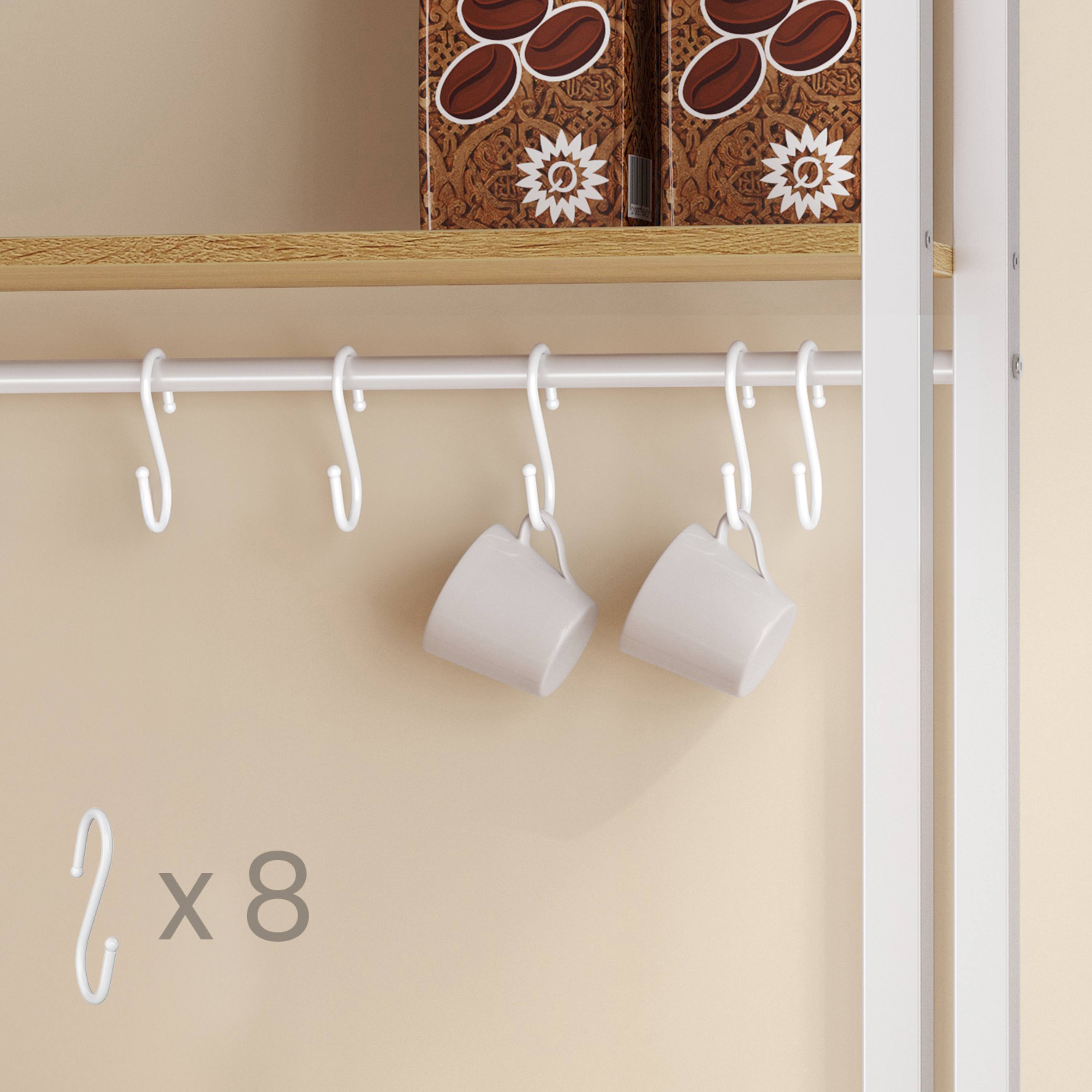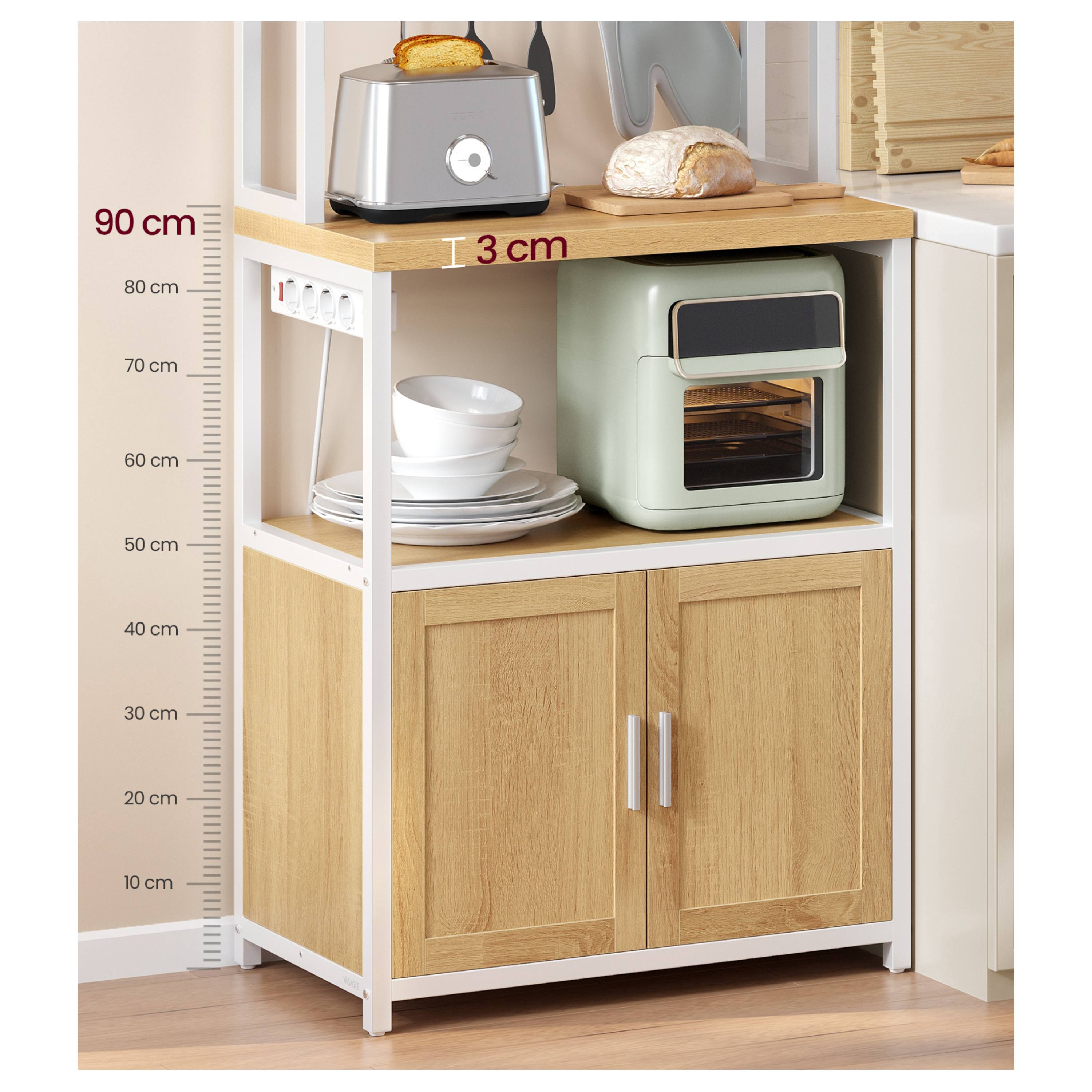 Disponuje 2 menšími policemi ideálními na koření, nádobí či dózy s potravinami. Má pracovní plochu, kterou lze využít pro umístění kávovaru, toustovače a jiných spotřebičů. Dále je k dispozici skříňka s velkým úložným prostorem za 2 otočnými dvířky. Nad skříňkou se nachází ideální místo pro mikrovlnku či mini troubu. Regál je vybaven 6 elektrickými zásuvkami s vypínačem, které usnadňují připojení spotřebičů. Součástí balení je 8 závěsných S háčků pro utěrky, chňapky nebo kuchyňské náčiní.