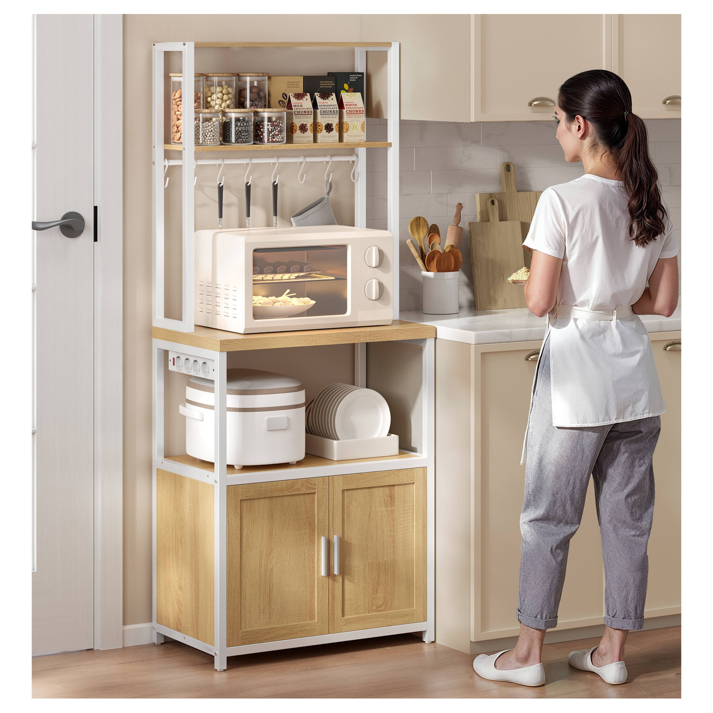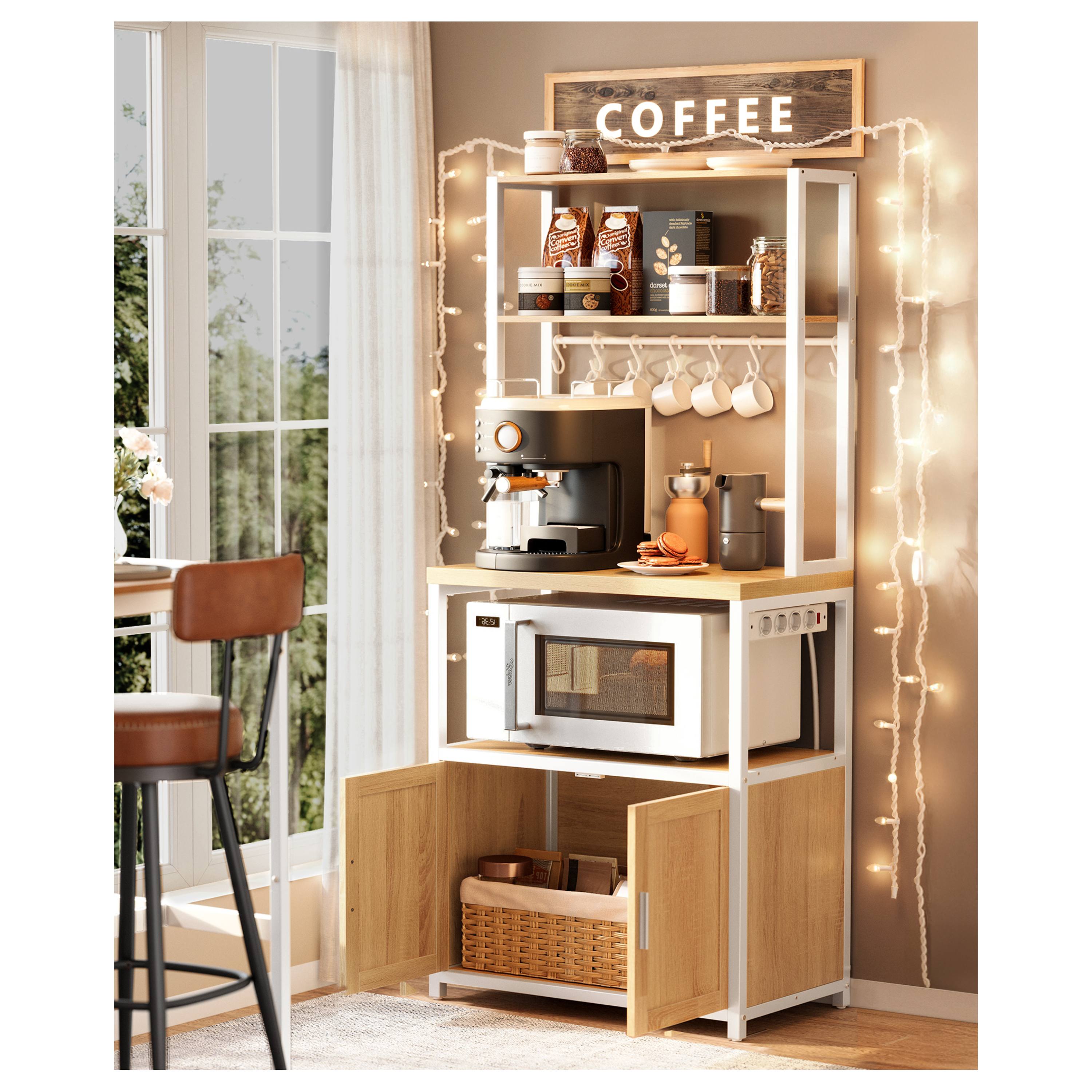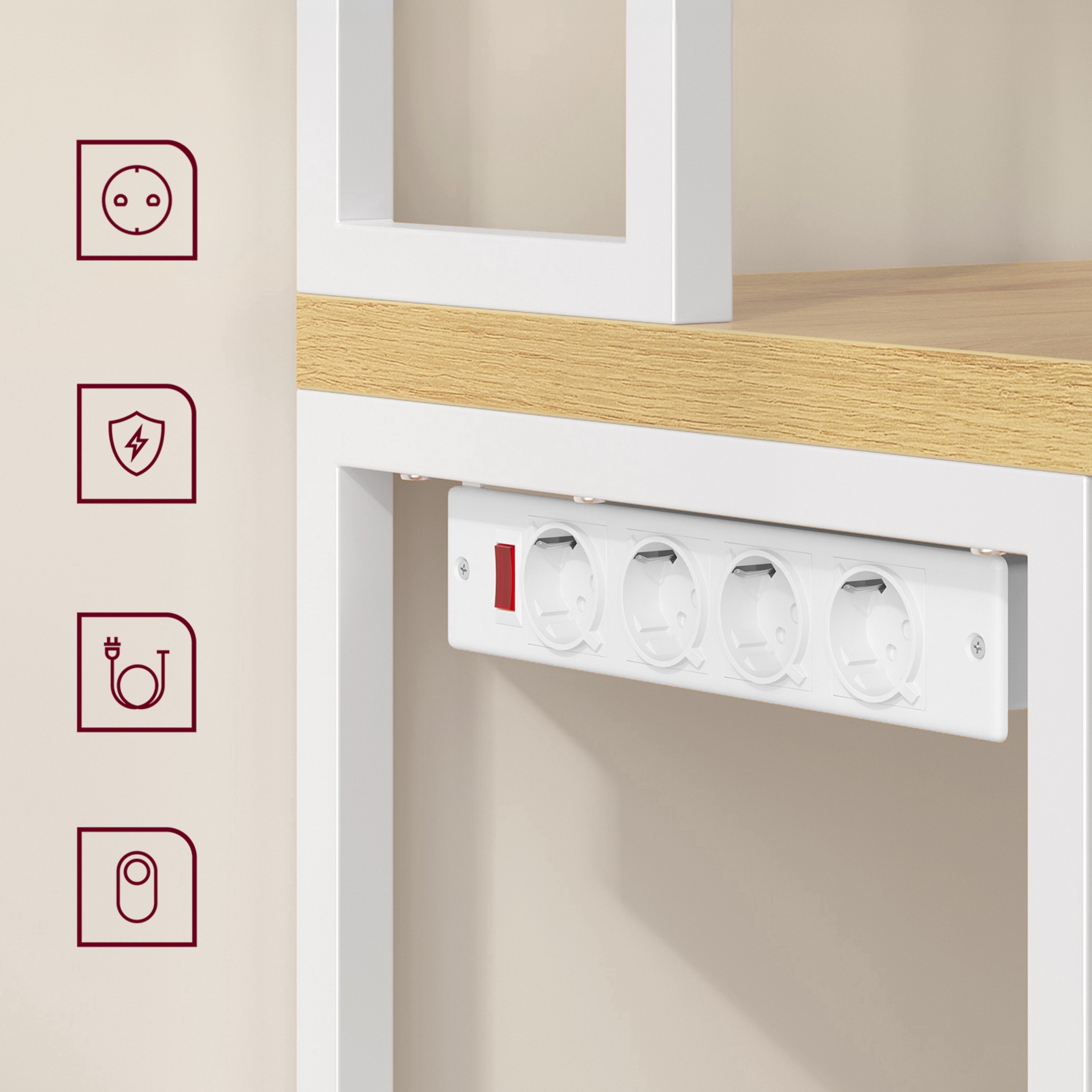 Disponuje 2 menšími policemi ideálními na koření, nádobí či dózy s potravinami. Má pracovní plochu, kterou lze využít pro umístění kávovaru, toustovače a jiných spotřebičů. Dále je k dispozici skříňka s velkým úložným prostorem za 2 otočnými dvířky. Nad skříňkou se nachází ideální místo pro mikrovlnku či mini troubu. Regál je vybaven 6 elektrickými zásuvkami s vypínačem, které usnadňují připojení spotřebičů. Součástí balení je 8 závěsných S háčků pro utěrky, chňapky nebo kuchyňské náčiní.