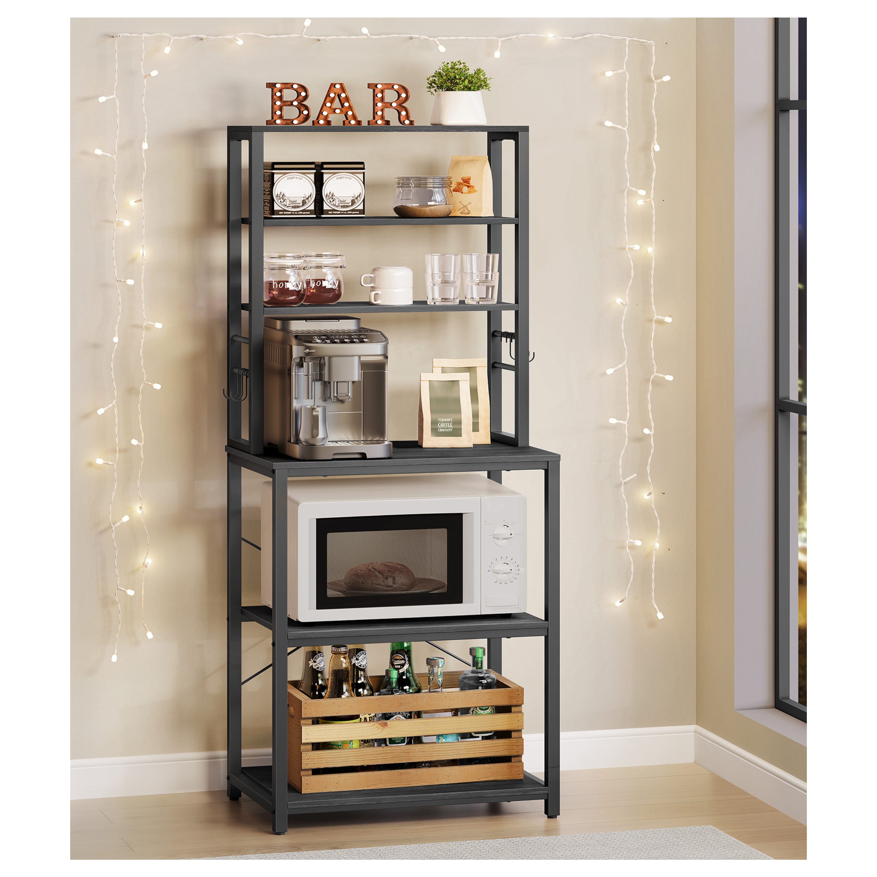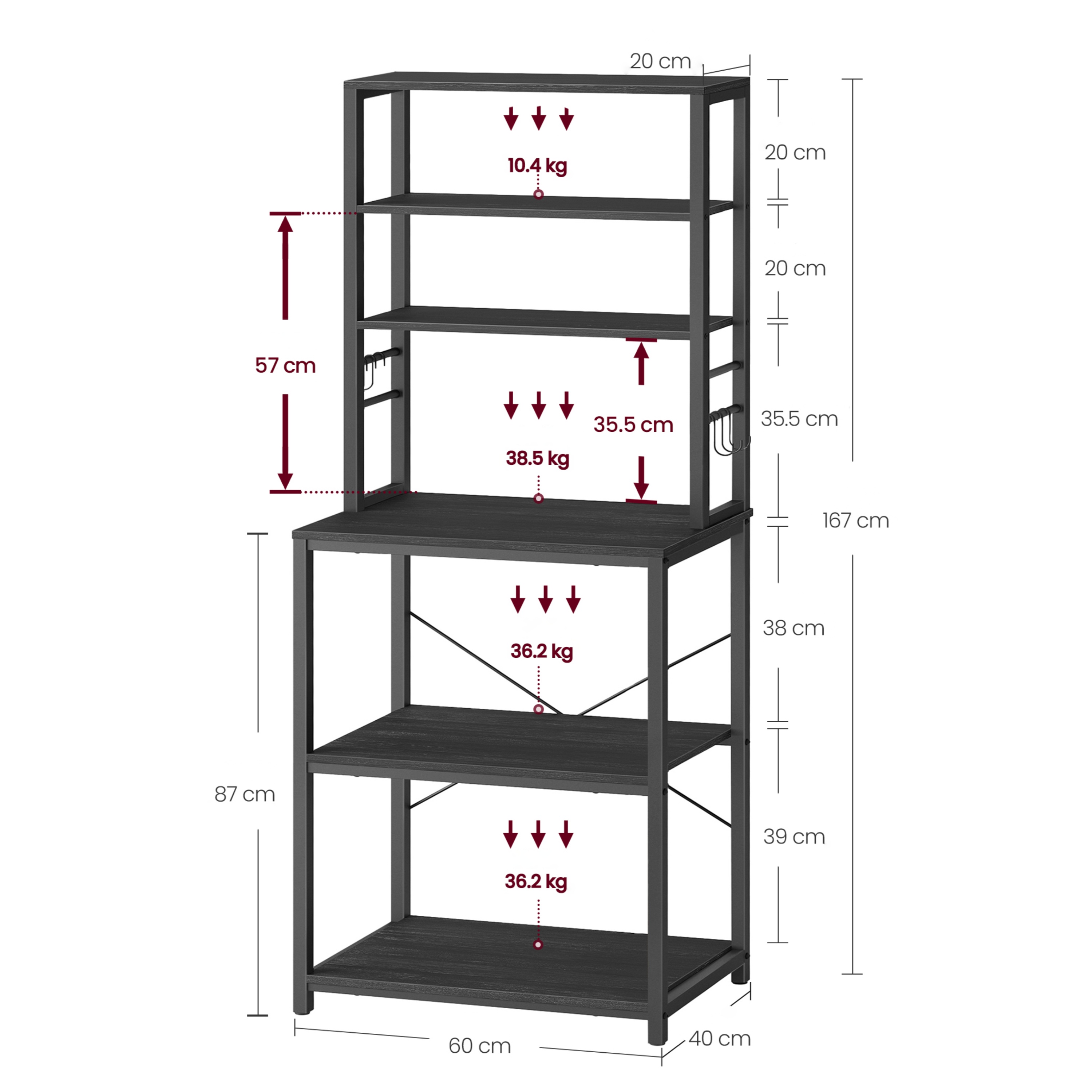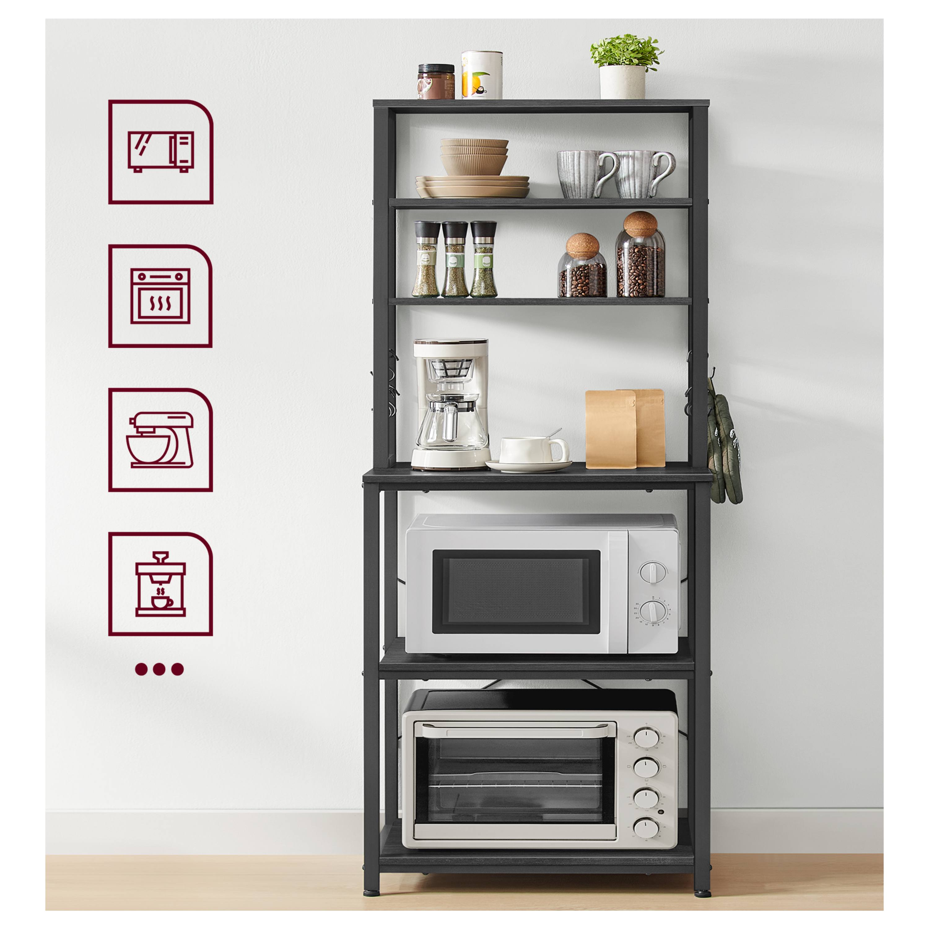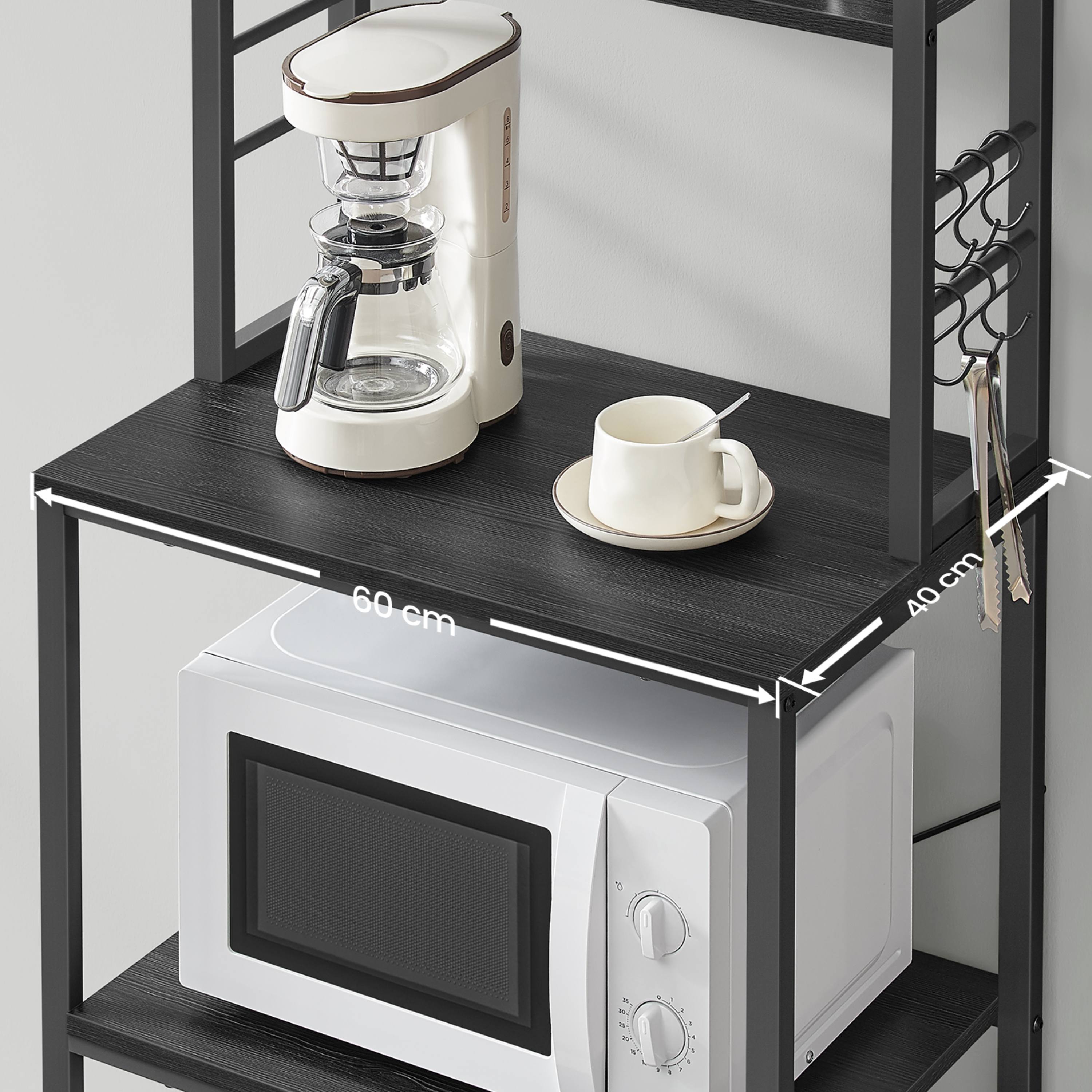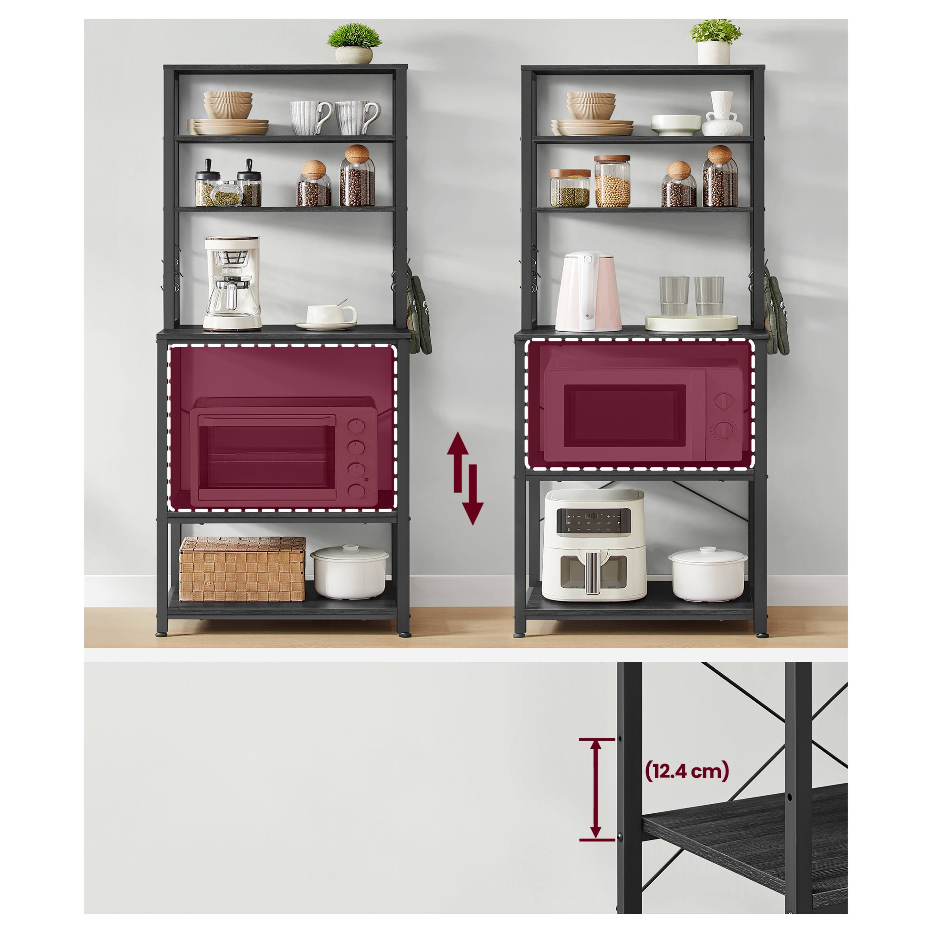 Disponuje 3 menšími policemi ideálními na koření, nádobí či dózy s potravinami. Má pracovní plochu, kterou lze využít pro umístění kávovaru, toustovače a jiných spotřebičů. Dále jsou k dispozici 2 velké police, z nichž jedna je nastavitelná. Ta je ideální pro umístění mikrovlnky či mini trouby. Díky nastavení do dvou výšek ji lze snadno přizpůsobit velikosti spotřebiče. Součástí balení je 6 závěsných S háčků pro utěrky, chňapky nebo kuchyňské náčiní.