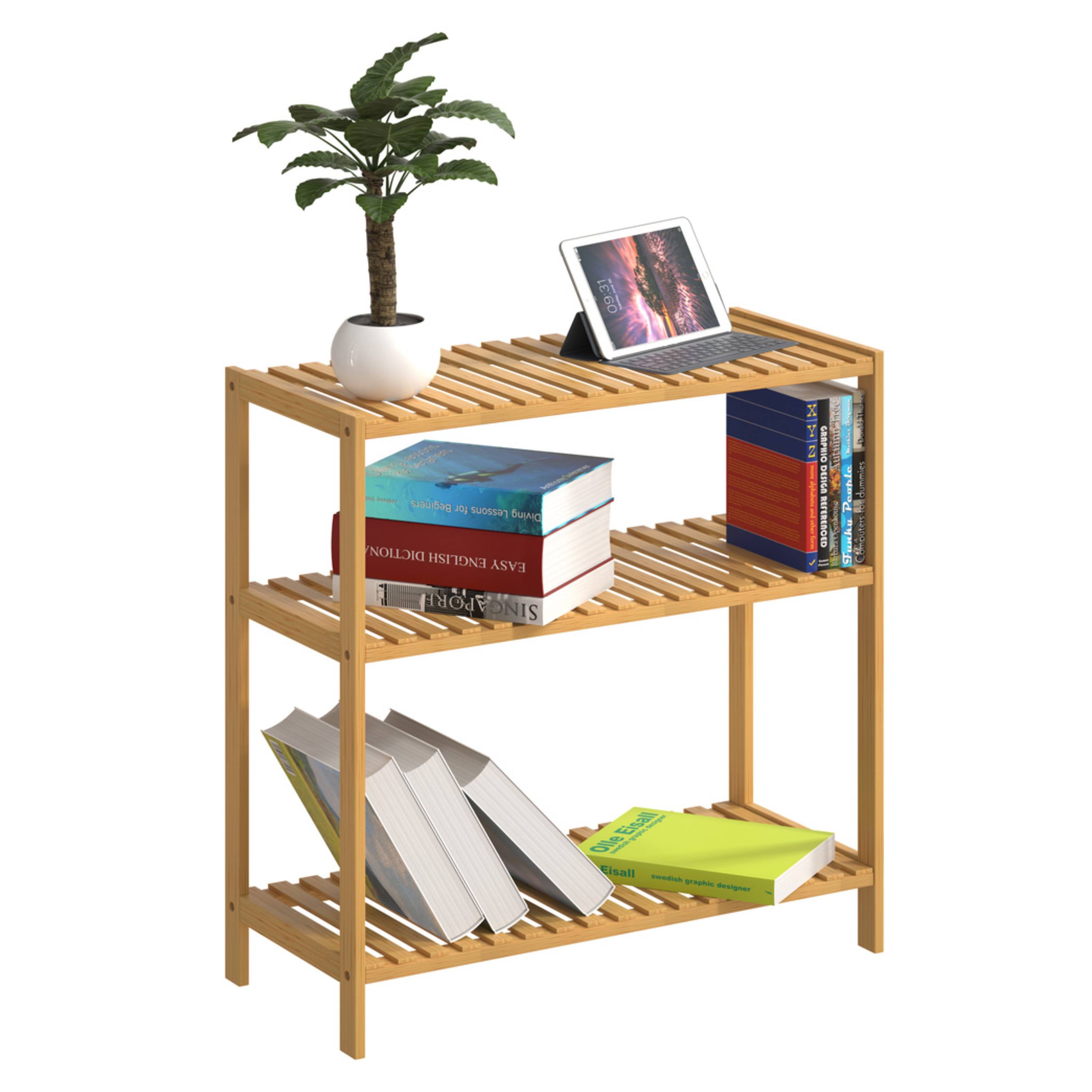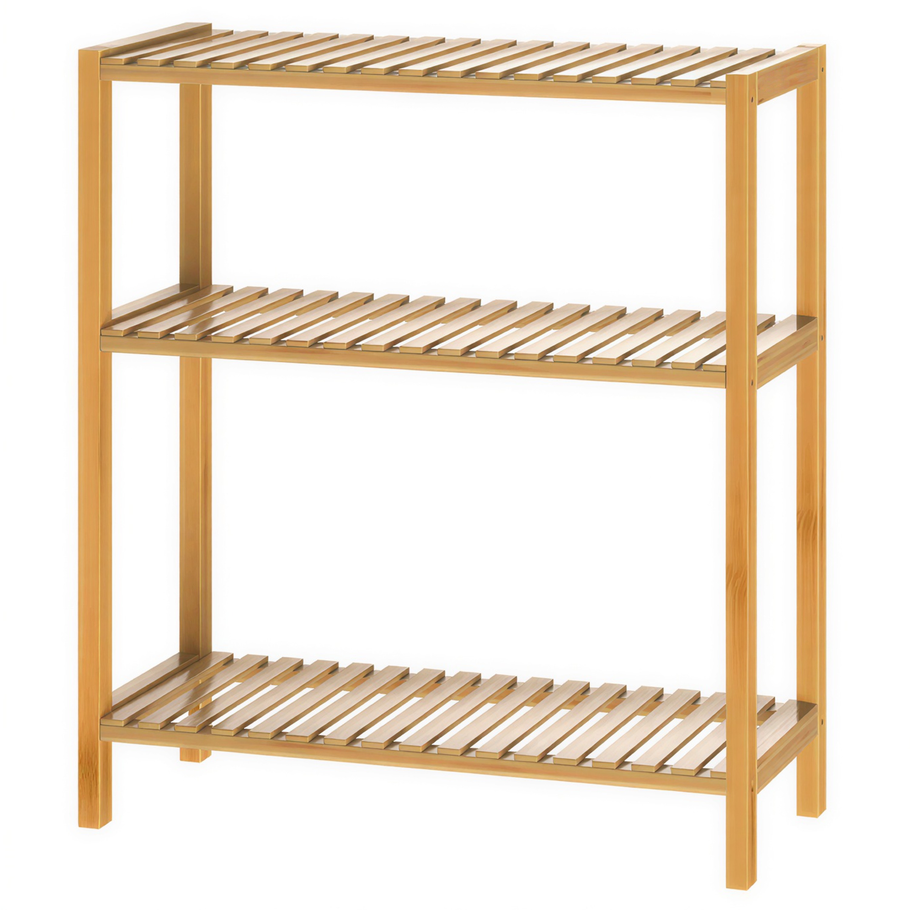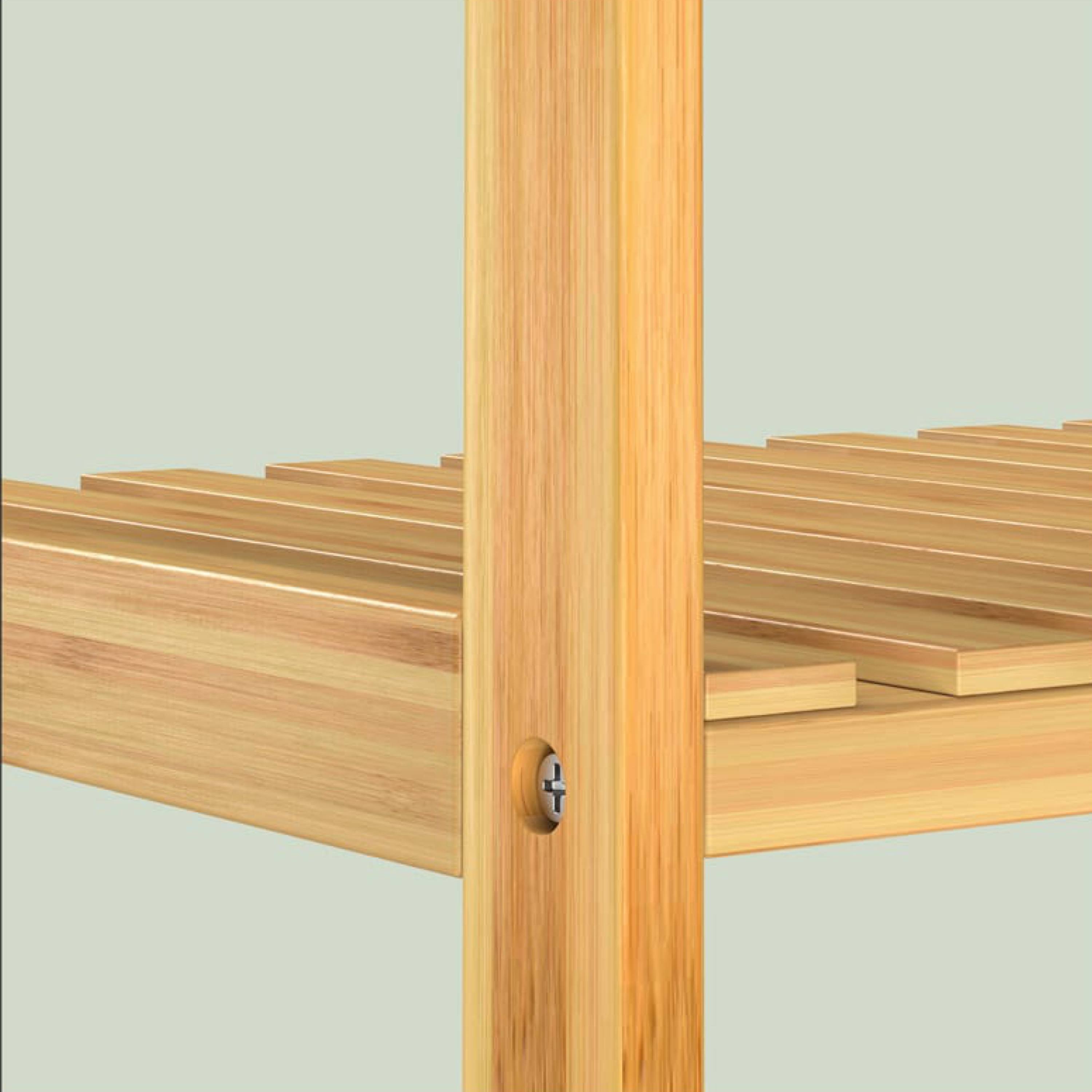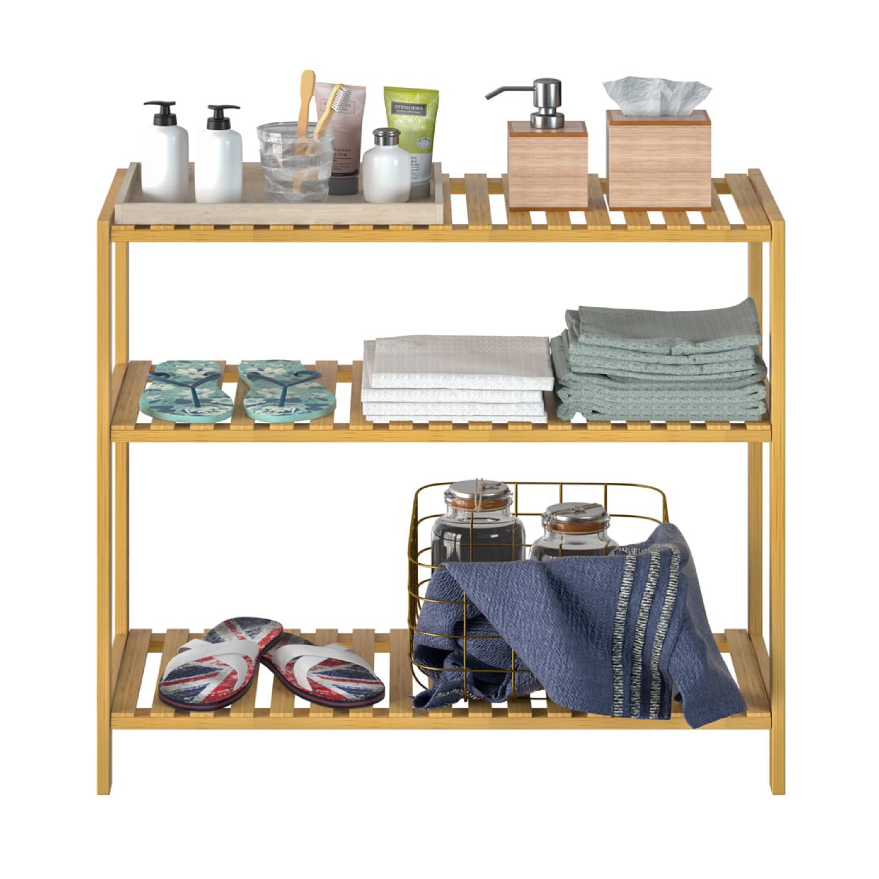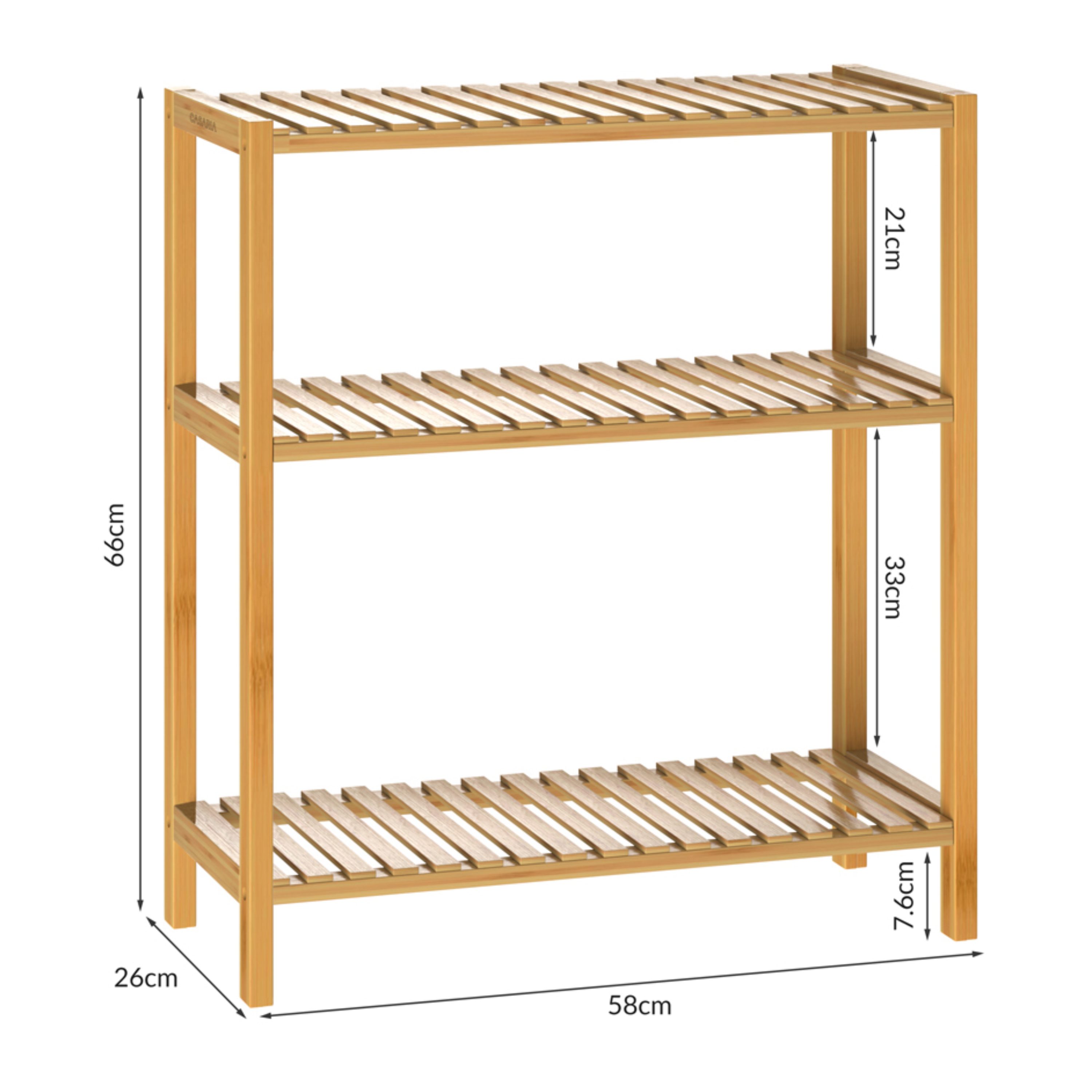 Vybaven je 3 otevřenými policemi, které nabízejí dostatek úložného prostoru se snadným přístupem a přehlednou organizaci, ať už jde o ručníky, kuchyňské potřeby, boty nebo úložné boxy. Regál je vyroben z udržitelného bambusu s bezbarvým lakem, který zvýrazňuje přirozenou kresbu materiálu, usnadňuje údržbu a chrání před vlhkostí. Konstrukce je robustní a stabilní, přičemž každá police má nosnost až 10 kg. Díky multifunkčnímu využití se regál hodí do různých místností.