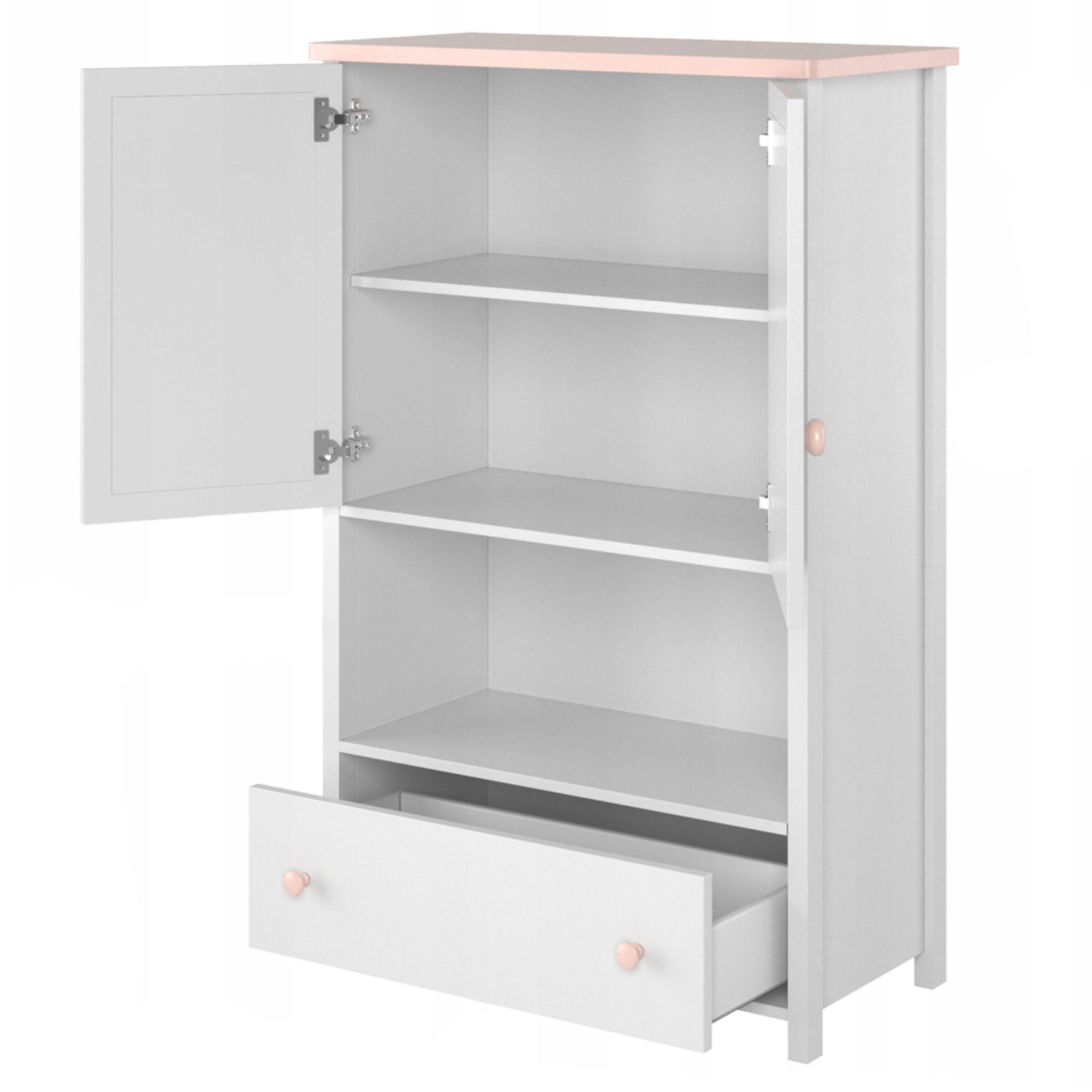 Regál má za otočnými dvířky 1 vloženou polici. Volné místo tak poskytuje dostatek odkládacího prostoru na nejrůznější dekorace, knihy či oblíbené hračky. Regál také disponuje praktickou zásuvkou. Regál je vyrobený z laminované dřevotřískové desky, materiál je nenáročný na údržbu. Chcete mít interiér sjednocený do jednoho stylu? Podívejte se na další nábytek ze stejnojmenného nábytkového programu LUNA.