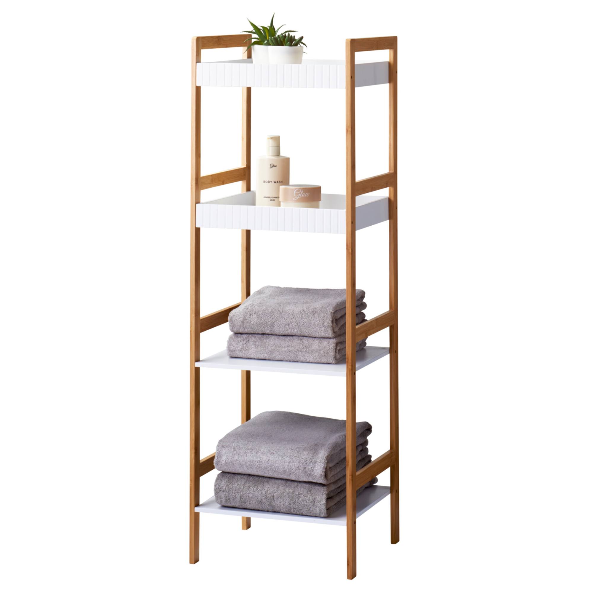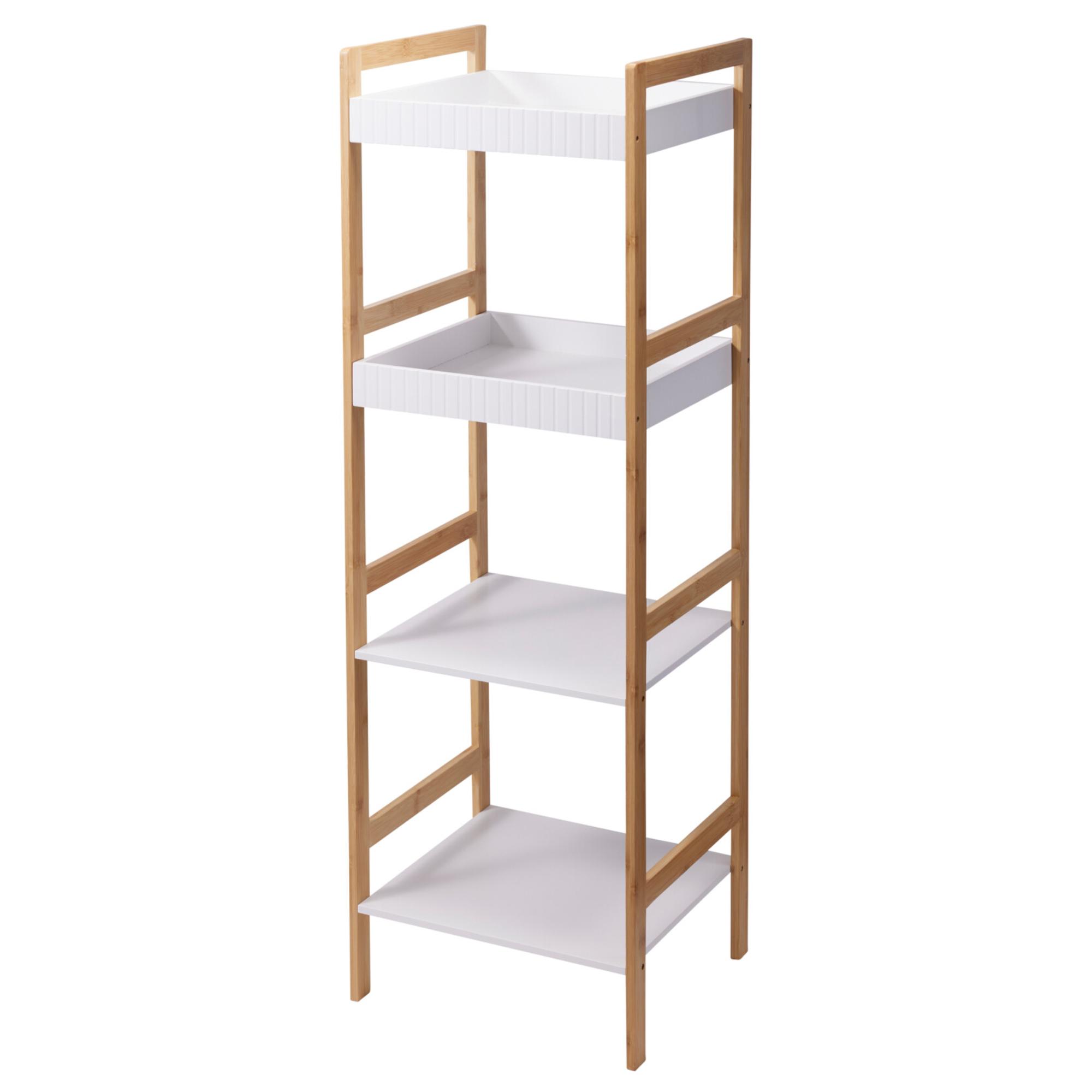 Nabízí dostatek úložného prostoru pro přehledné uspořádání všech nezbytností. Má konstrukci z bambusového dřeva, vybavenou 4 policemi z laminované dřevovláknité MDF desky. První 2 police jsou opatřeny okrajem, který pomáhá bezpečně udržet jejich obsah. Bambus je přírodní materiál, odolný vůči vlhkosti, je proto ideální do koupelny pro uložení ručníků, ale poslouží i v ložnici či předsíni na oblečení a další doplňky.