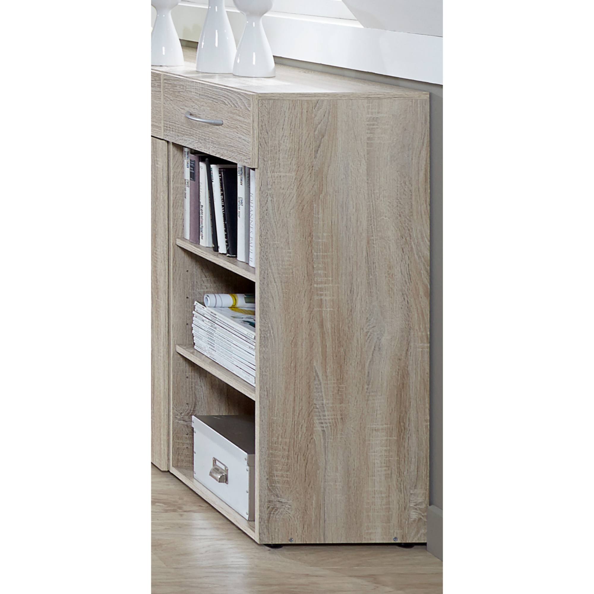 Regál obsahuje 2 vložené police, které poskytují dostatečný odkládací prostor a 1 zásuvku, která nabízí praktický úložný prostor. Regál má korpus vyrobený z laminovaného dřevěného materiálu a zásuvku z fóliovaného dřevěného materiálu. Tyto materiály jsou nenáročné na údržbu. Chcete mít interiér sjednocený do jednoho stylu? Podívejte se na další nábytek ze stejnojmenného nábytkového programu MULTIRAUMKONZEPT.