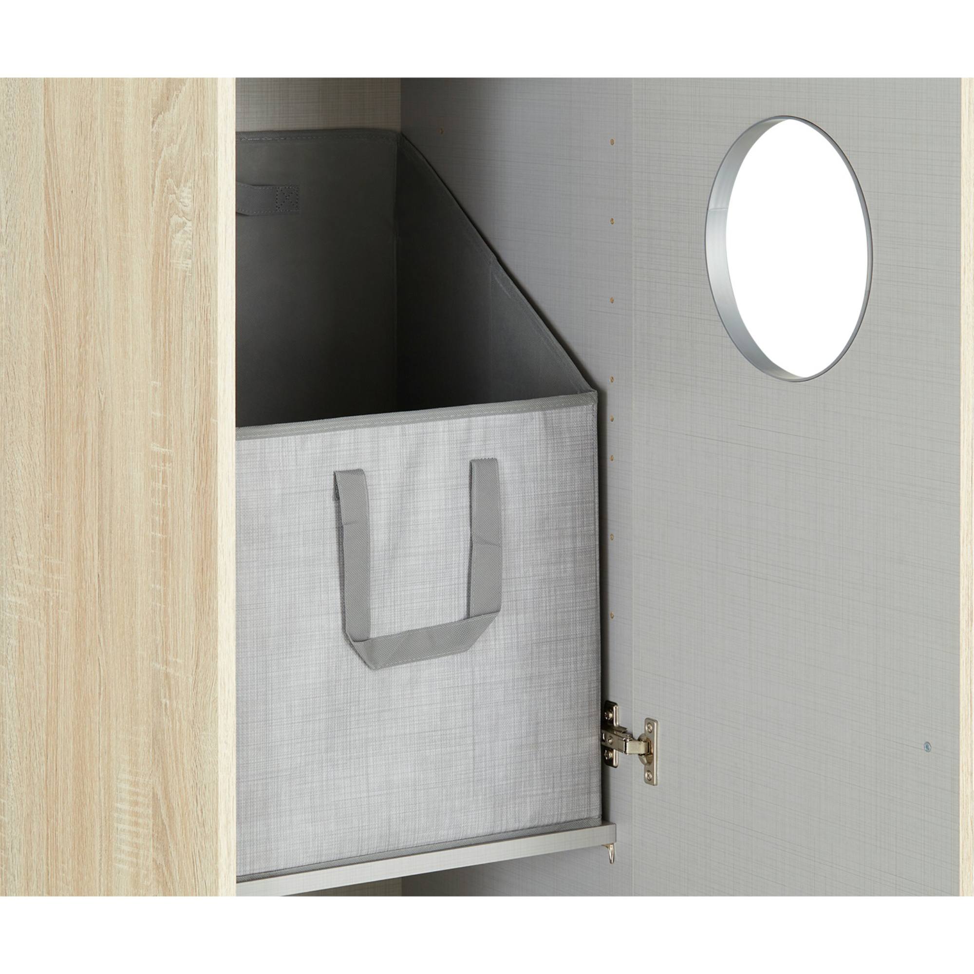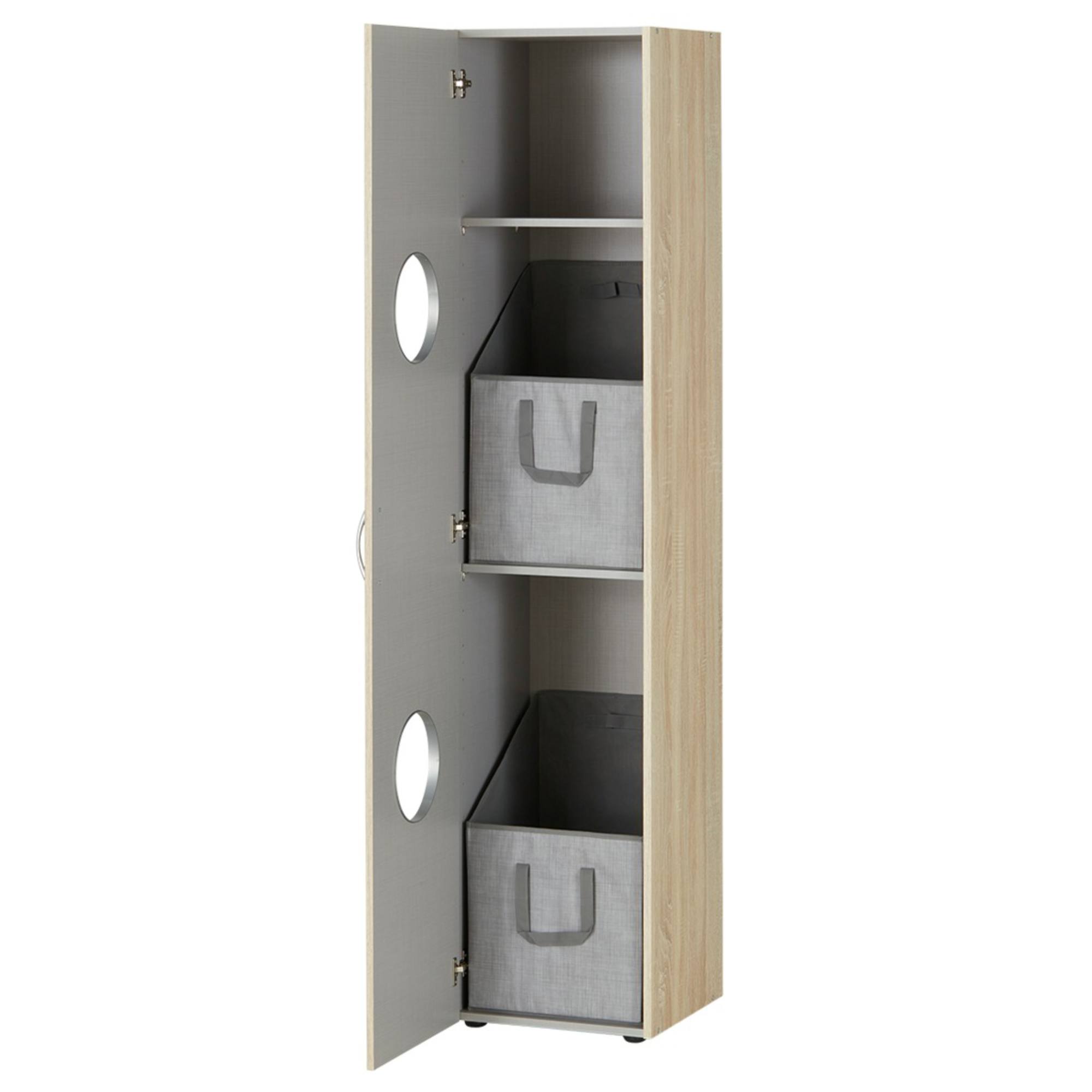 Disponuje 1 otočnými dveřmi s otvory, které usnadňují otevírání. Vnitřní vybavení regálu je sestaveno ze 2 vložených polic. Regál obsahuje také 2 praktické boxy pro uskladnění oblečení či jiných předmětů. Regál je vyrobený z laminovaného dřevěného materiálu, který vás přesvědčí svojí nenáročností na údržbu. Chcete mít interiér sjednocený do jednoho stylu? Podívejte se na další nábytek ze stejnojmenného programu MULTIRAUMKONZEPT.