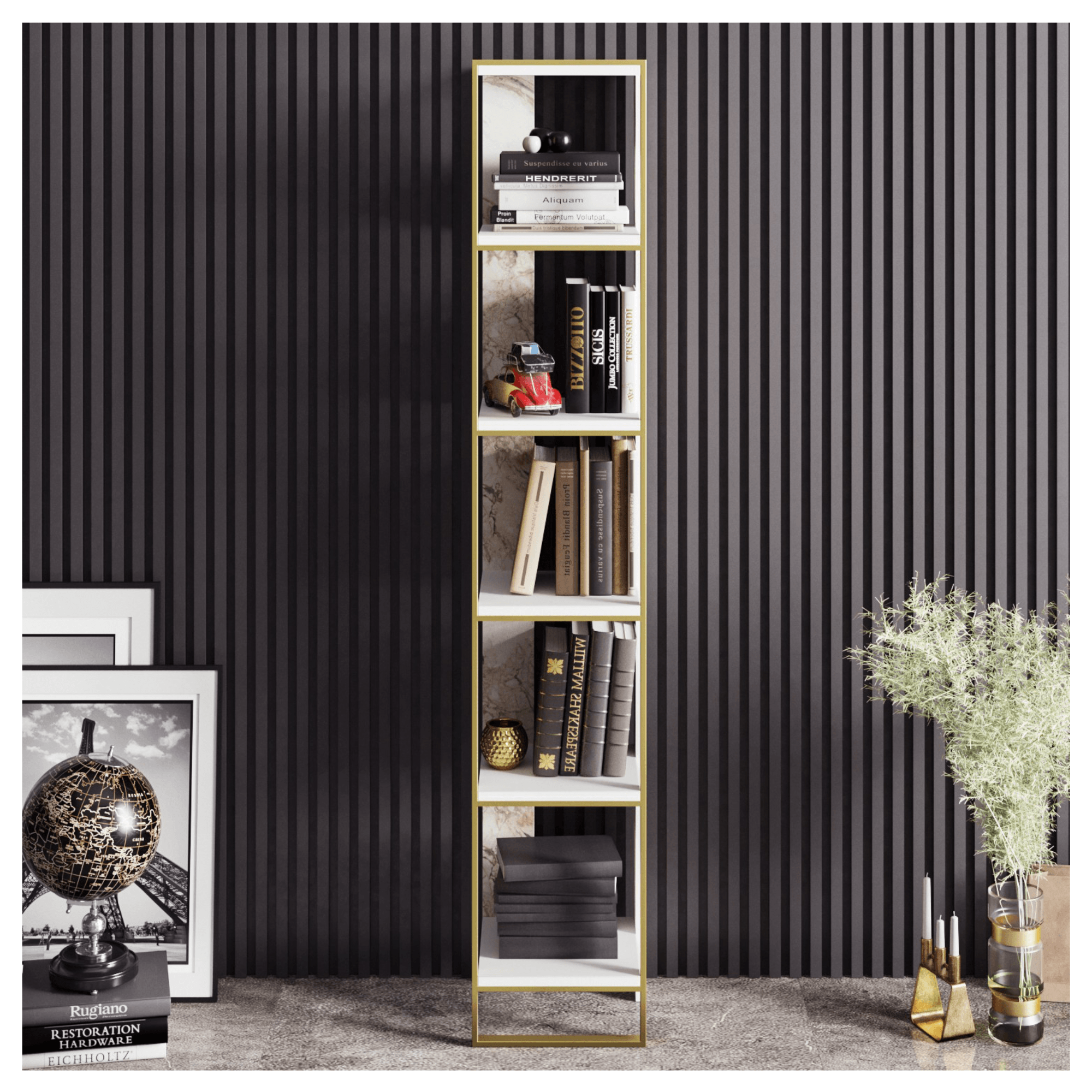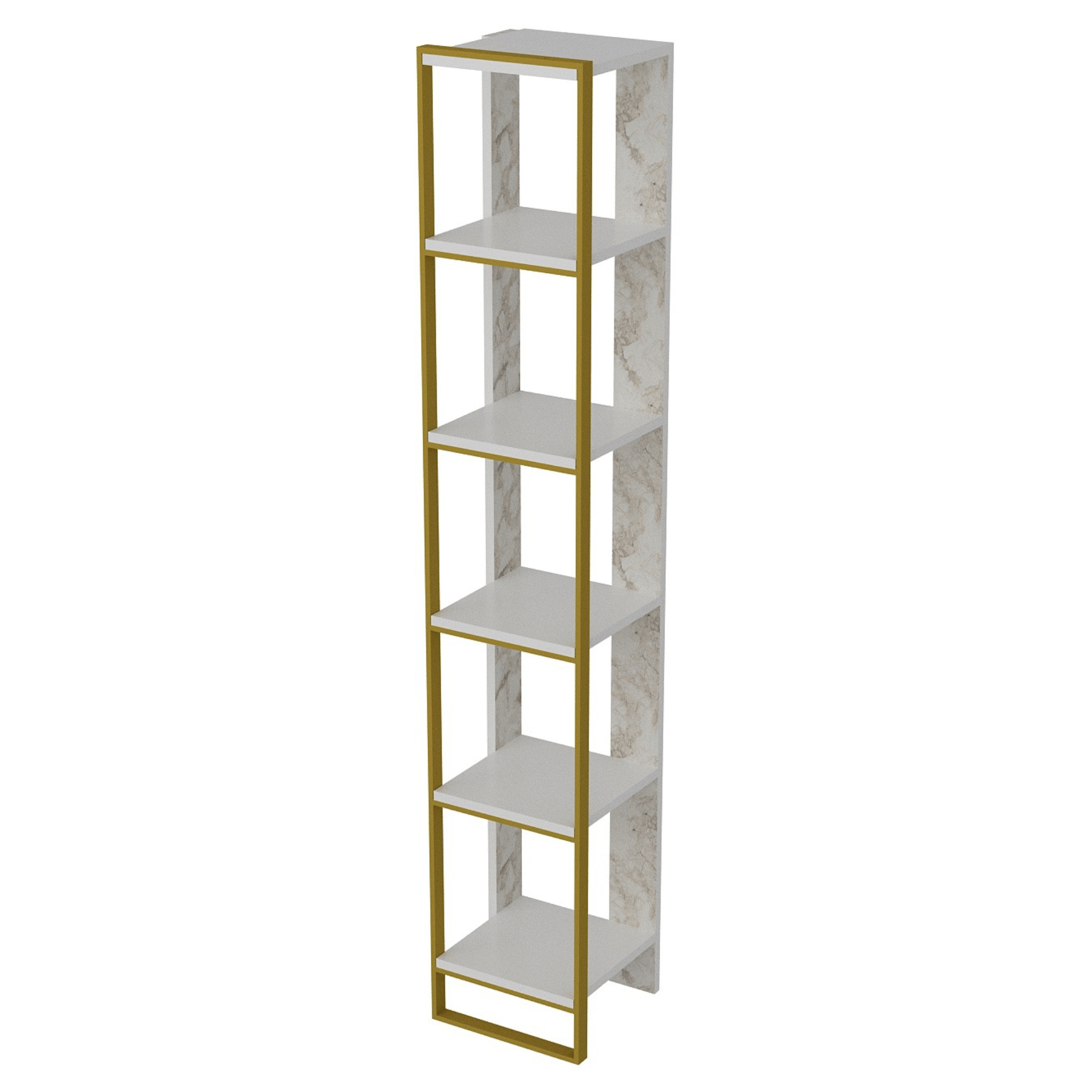 Moderní provedení ve velice atraktivní kombinaci bílého mramoru a zlaté barvy působí luxusně a interiéru dodá potřebný šmrnc. Nabízí ze všech stran otevřený úložný prostor, který umožňuje různorodé využití. Vybaven je 5 vloženými policemi poskytujícími dostatek místa nejen pro knihy, ale i pro rostliny, fotografie a další nejrůznější dekorace. Díky svému praktickému provedení do výšky perfektně využívá vertikální prostor a je tak ideálním kusem nábytku i do menších místností, kde nezabere tolik cenného místa. Vyroben je z laminovaného dřevěného materiálu, který není náročný na údržbu.
