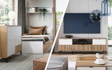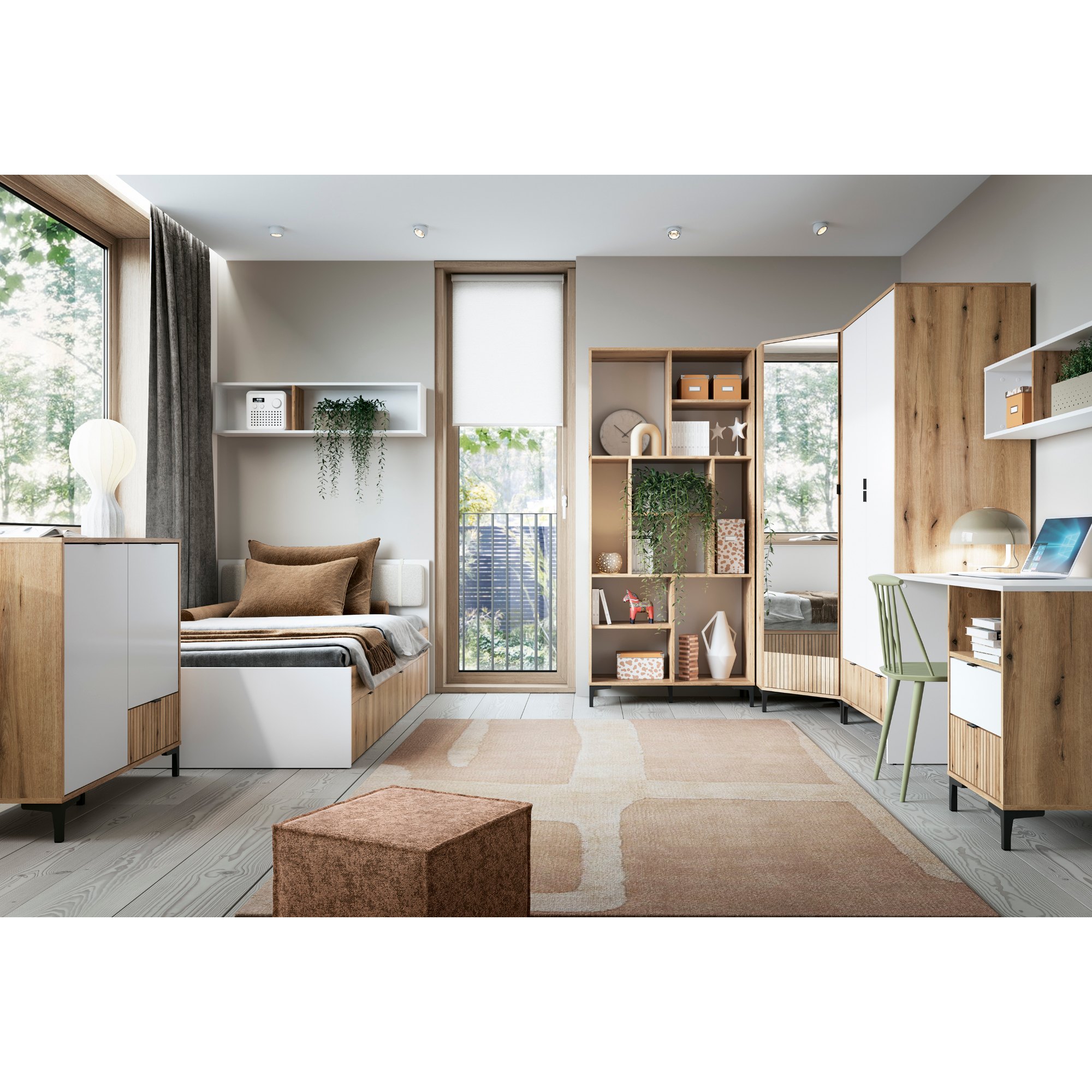 Regál RICKO zaujme svým moderním designem a praktickými prvky. Kombinuje přírodní dekor dubu evoke s alpskou bílou barvu, díky čemu zapadne téměř do jakéhokoliv stylu interiéru.