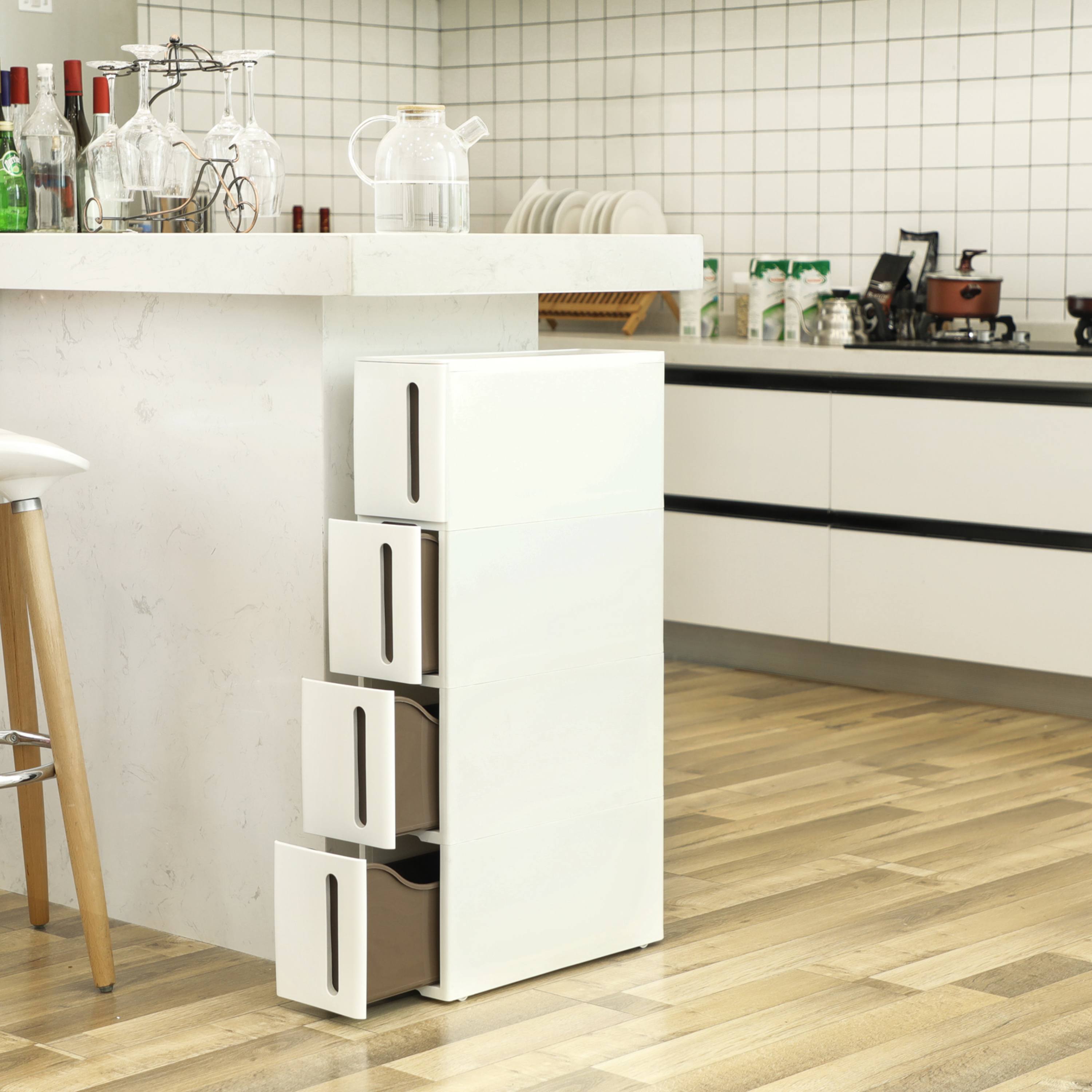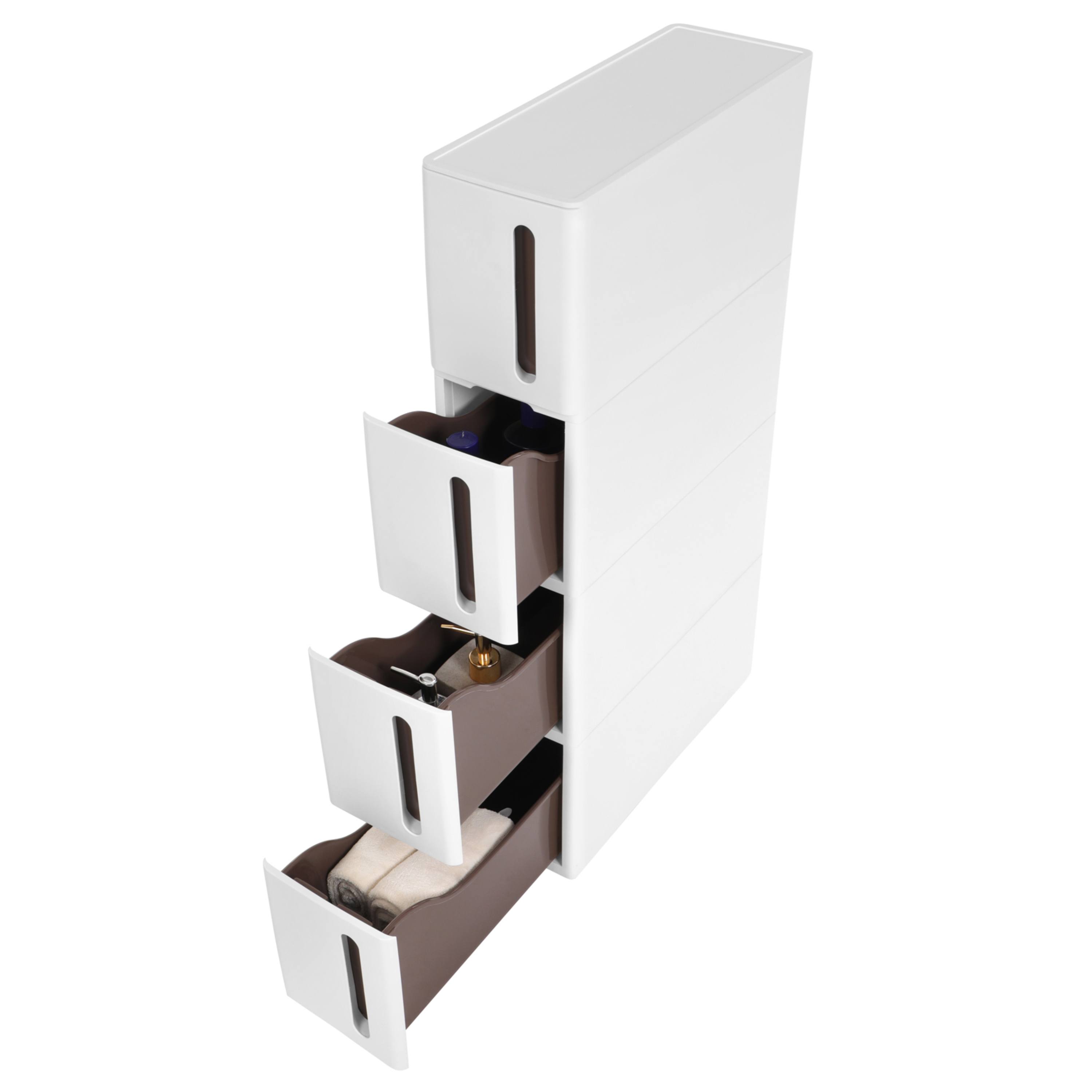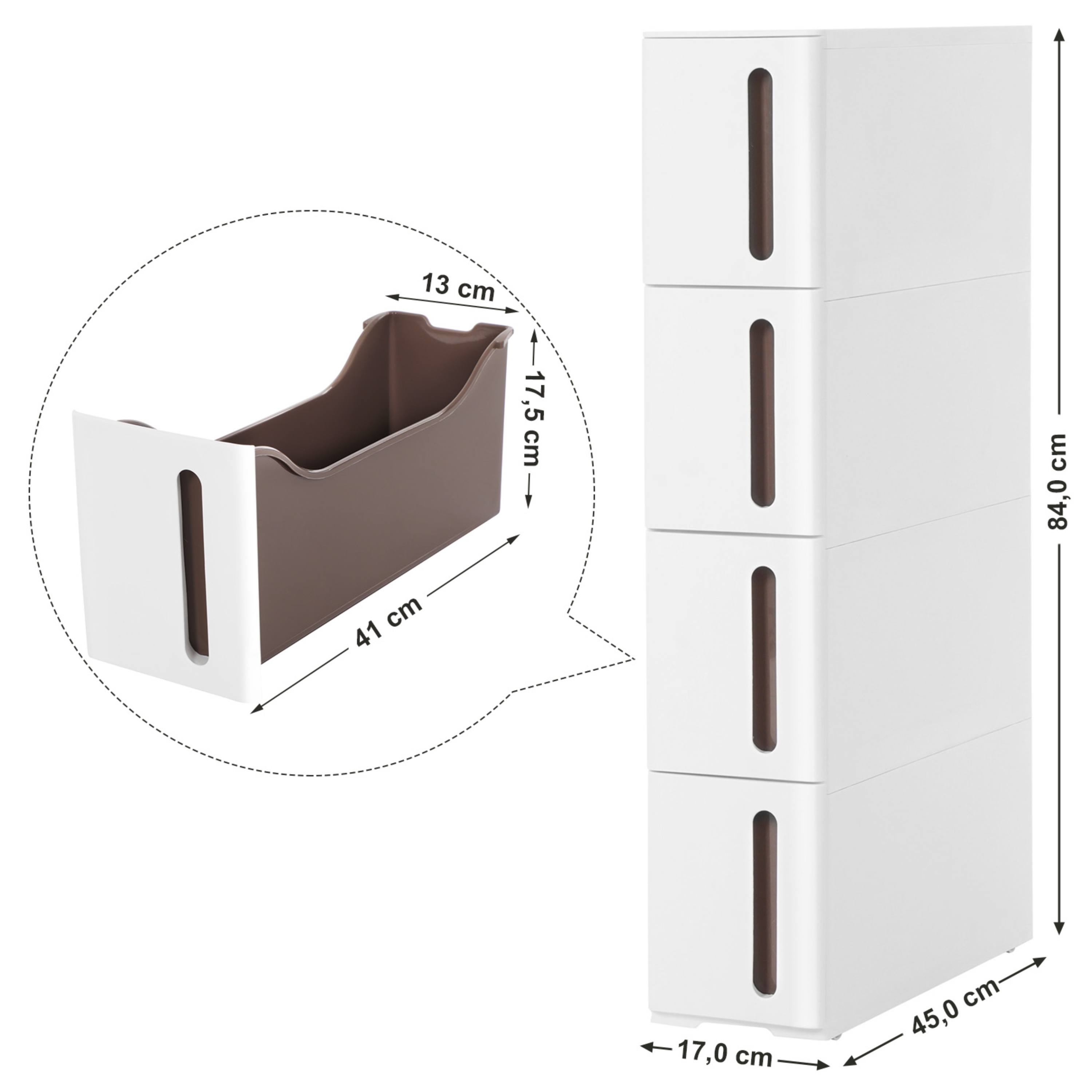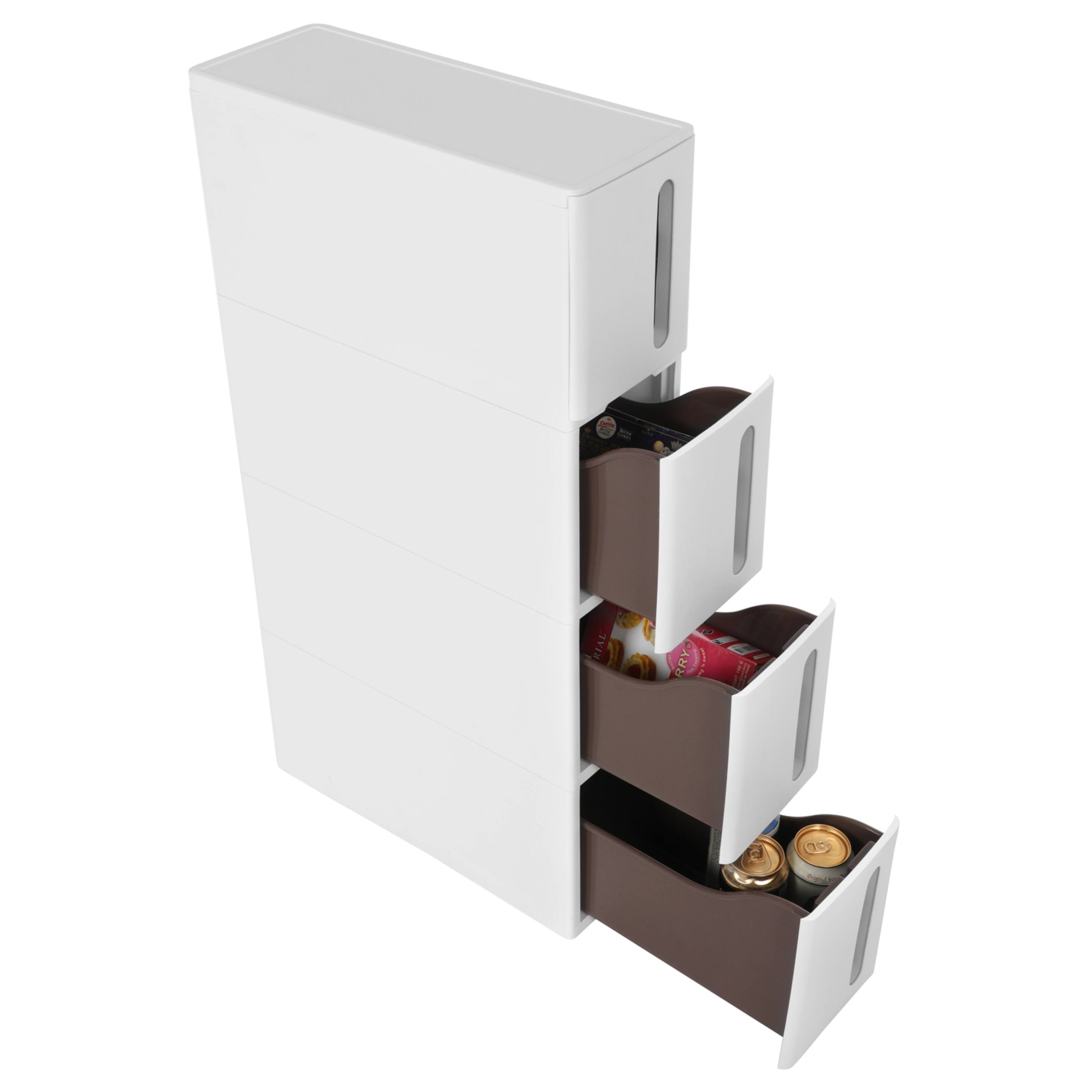 Do 4 výsuvných boxů můžete uložit například kancelářské pomůcky, kuchyňské potřeby nebo kosmetiku. Regál je vybaven kolečky, a tak jej snadno přemístíte, kamkoliv budete chtít.