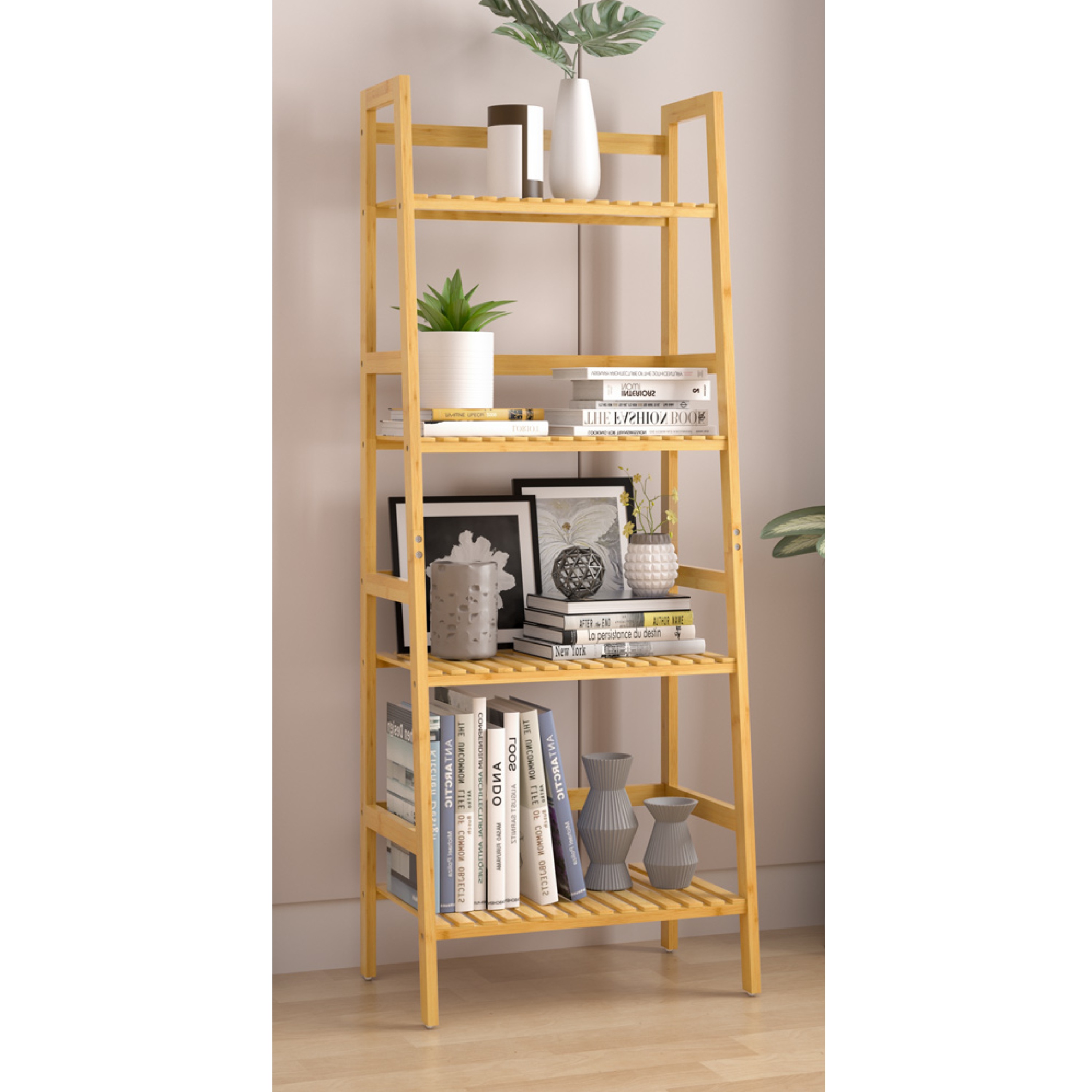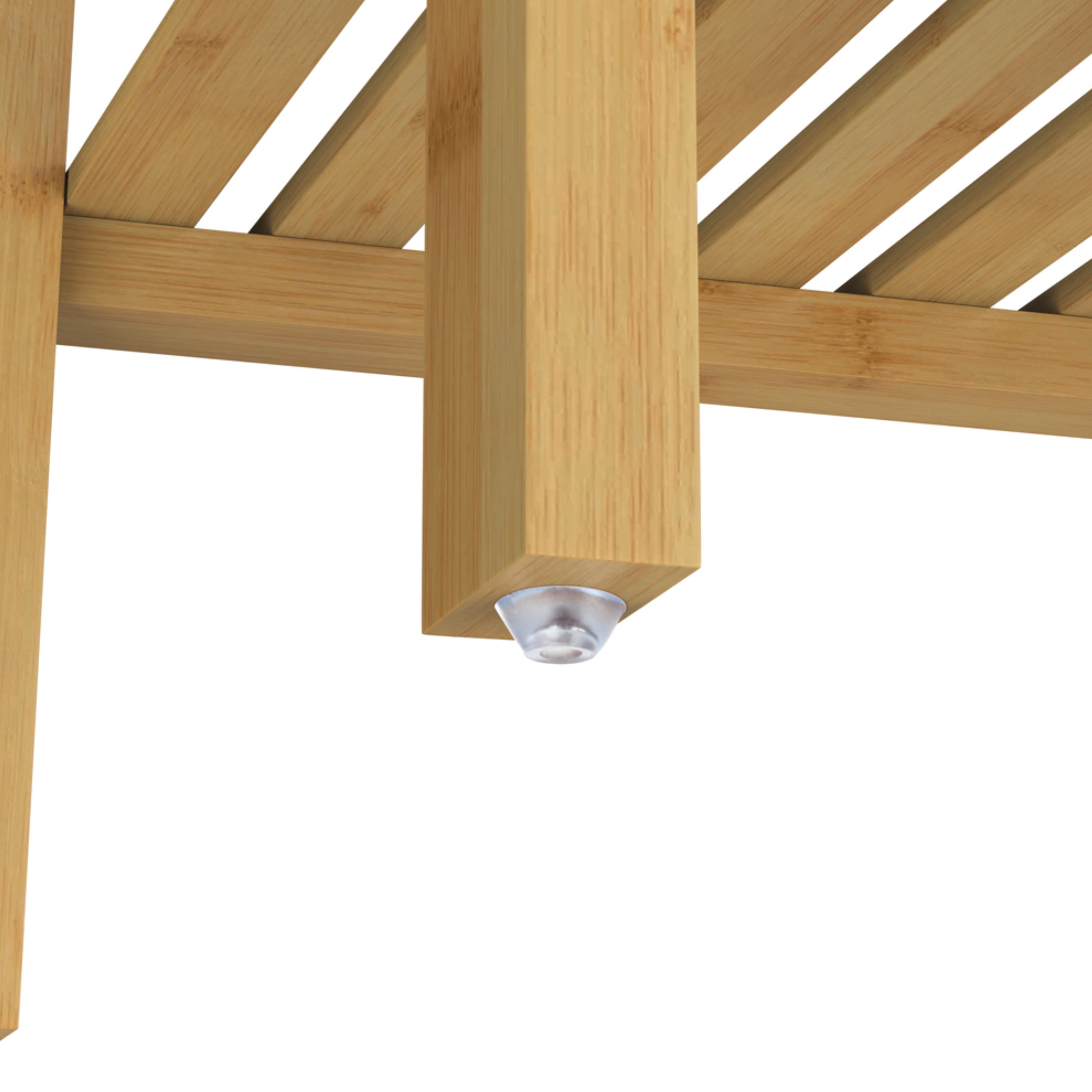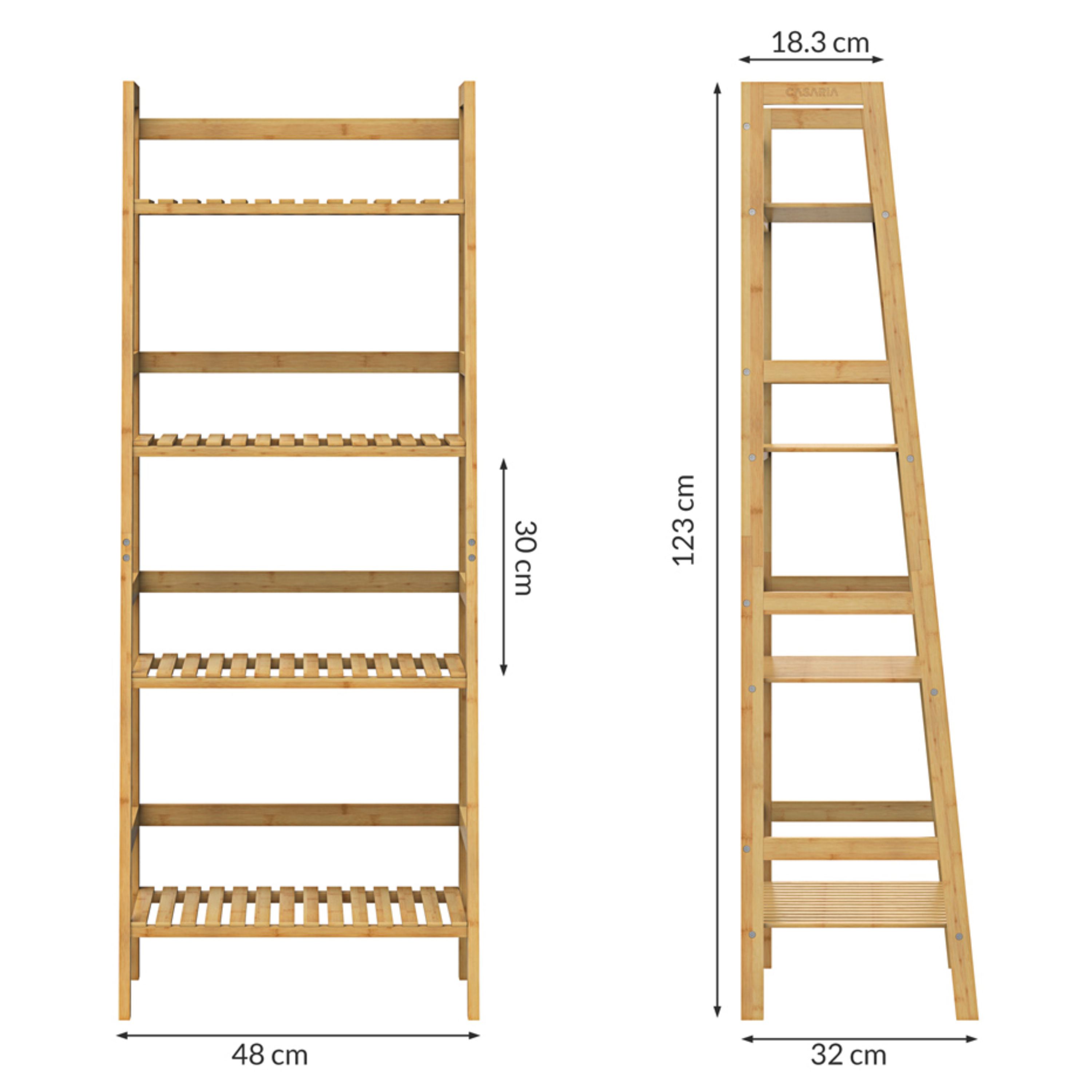 Vybaven je 4 policemi, které lze namontovat do různých výšek, takže si vnitřní prostor snadno přizpůsobíte podle aktuálních potřeb. Regál tak umožňuje pohodlné uložení menších i větších předmětů od ručníků a kosmetiky přes boty až po kuchyňské potřeby nebo úložné boxy. Konstrukce je vyrobena z bambusu, který je známý svou pevností, stabilitou a přirozenou odolností vůči vlhkosti. Regál má maximální nosnost 40 kg, přičemž každá police unese až 10 kg.
