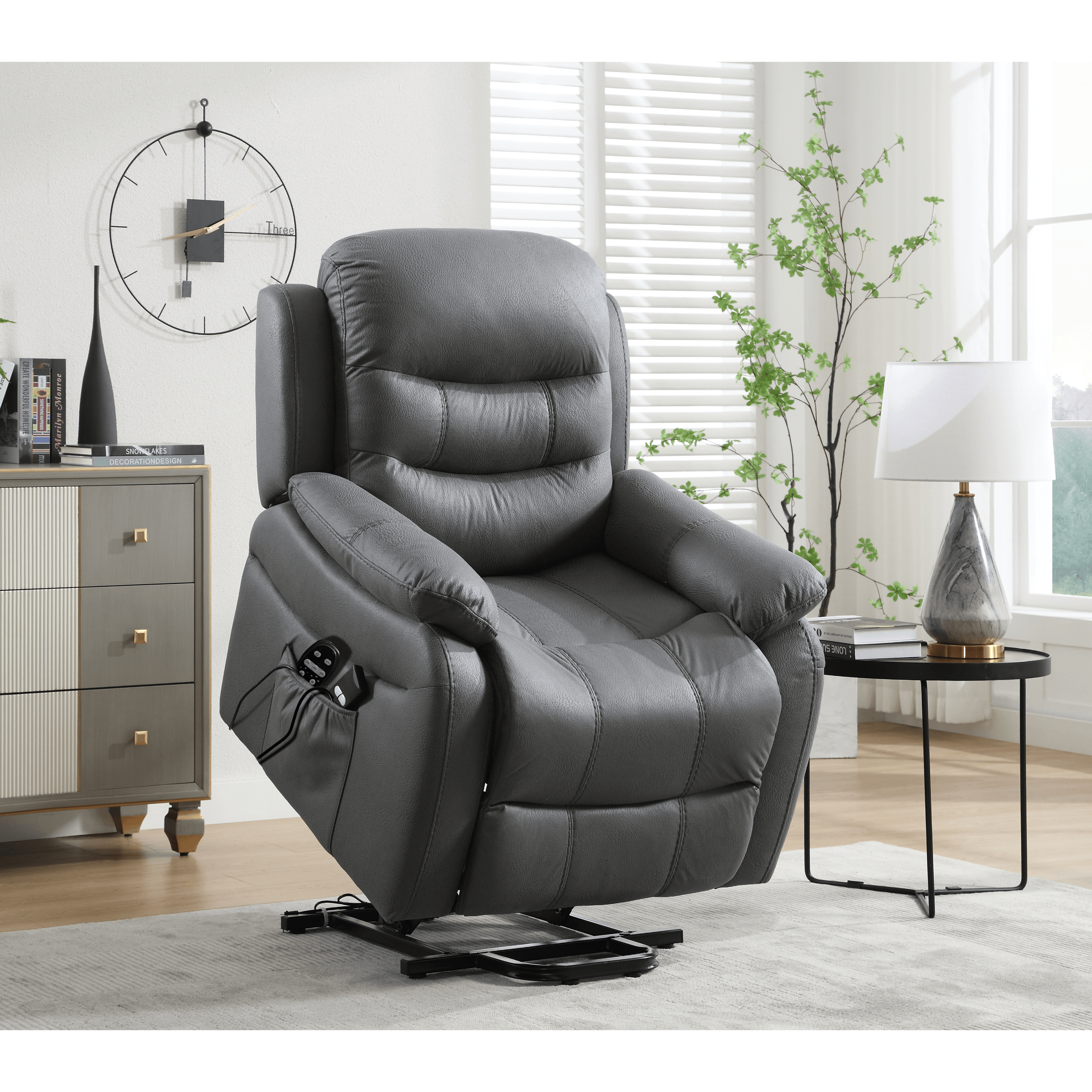 Mohutné křeslo je čalouněné příjemnou vintage látkou v jednobarevném provedení. Komfortní sezení umožňuje pěnová výplň spolu se zádovým opěrákem a područkami pro unavené ruce. Díky pomocí jednoduchého elektrického ovládání si můžete nastavit relaxační polohu a vibrační masáž dle svých potřeb. Praktická funkce umožňuje také snadnější vstávání.
