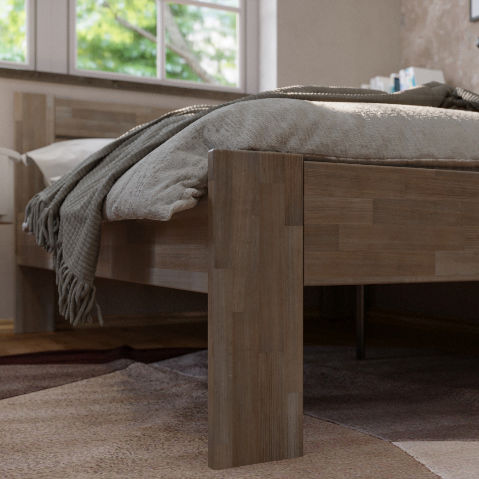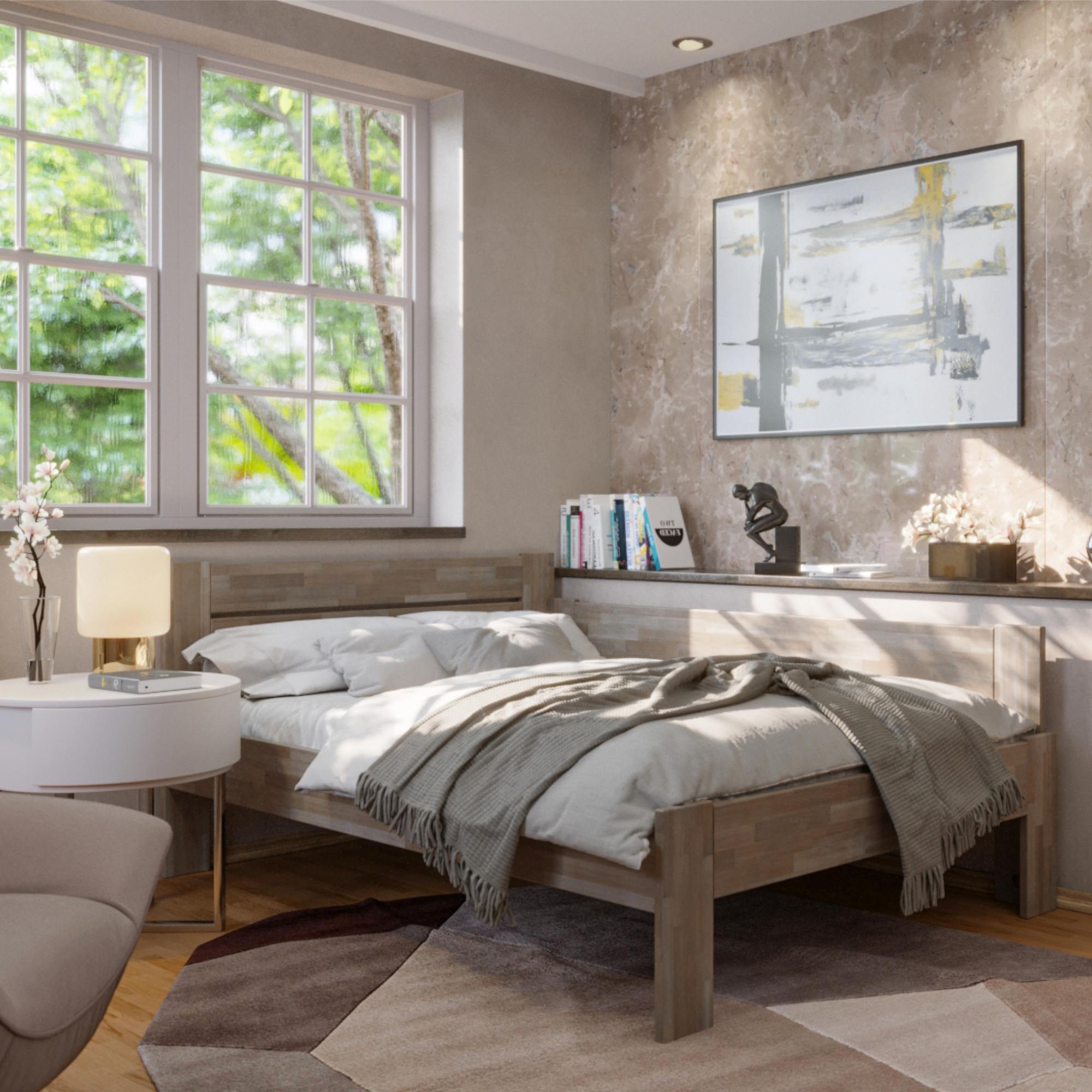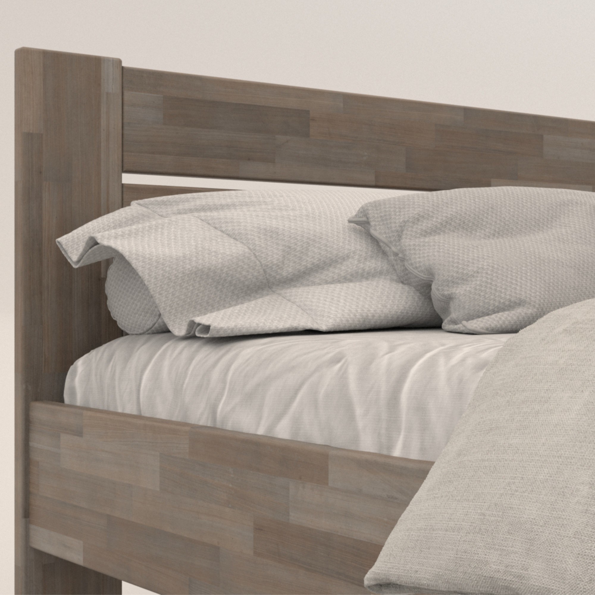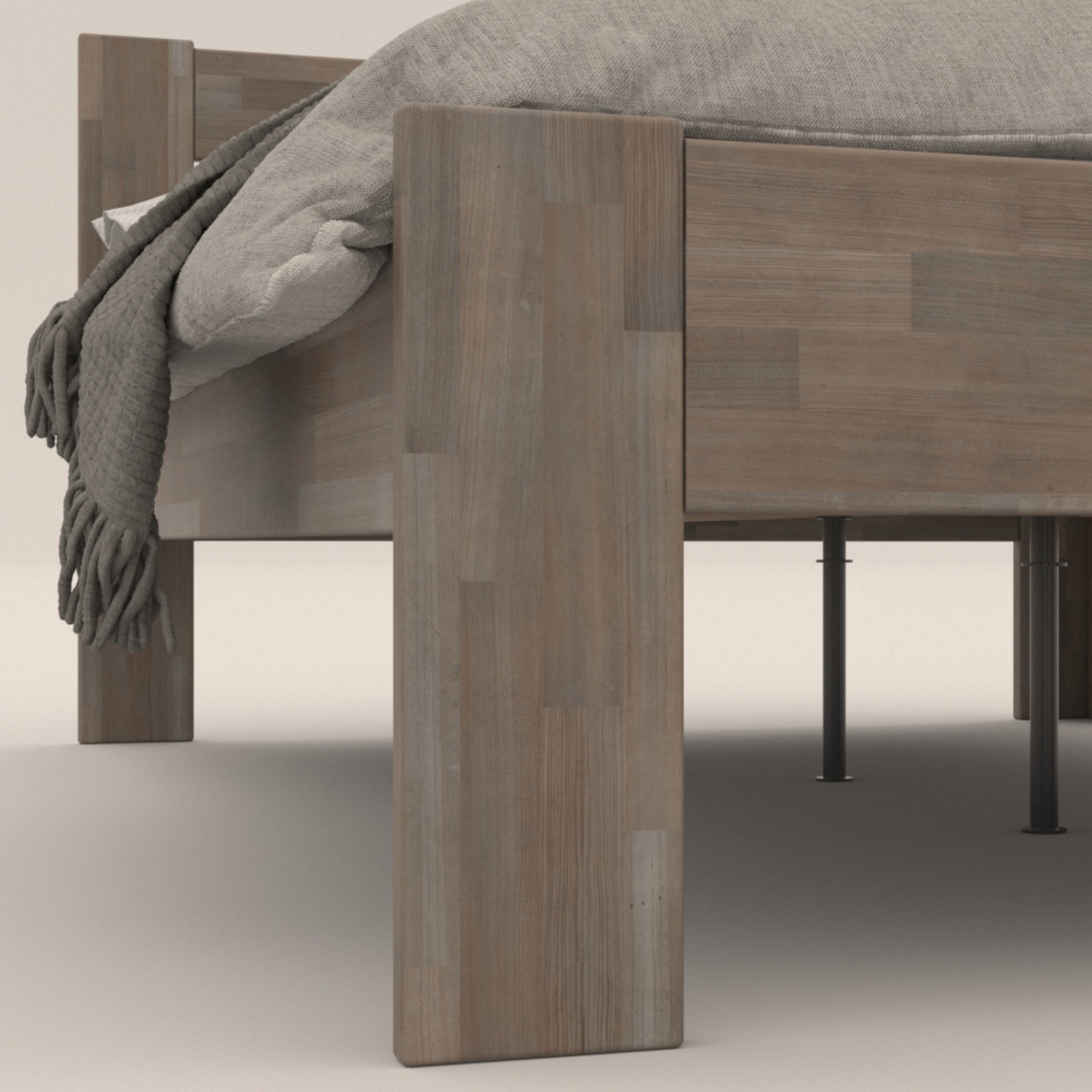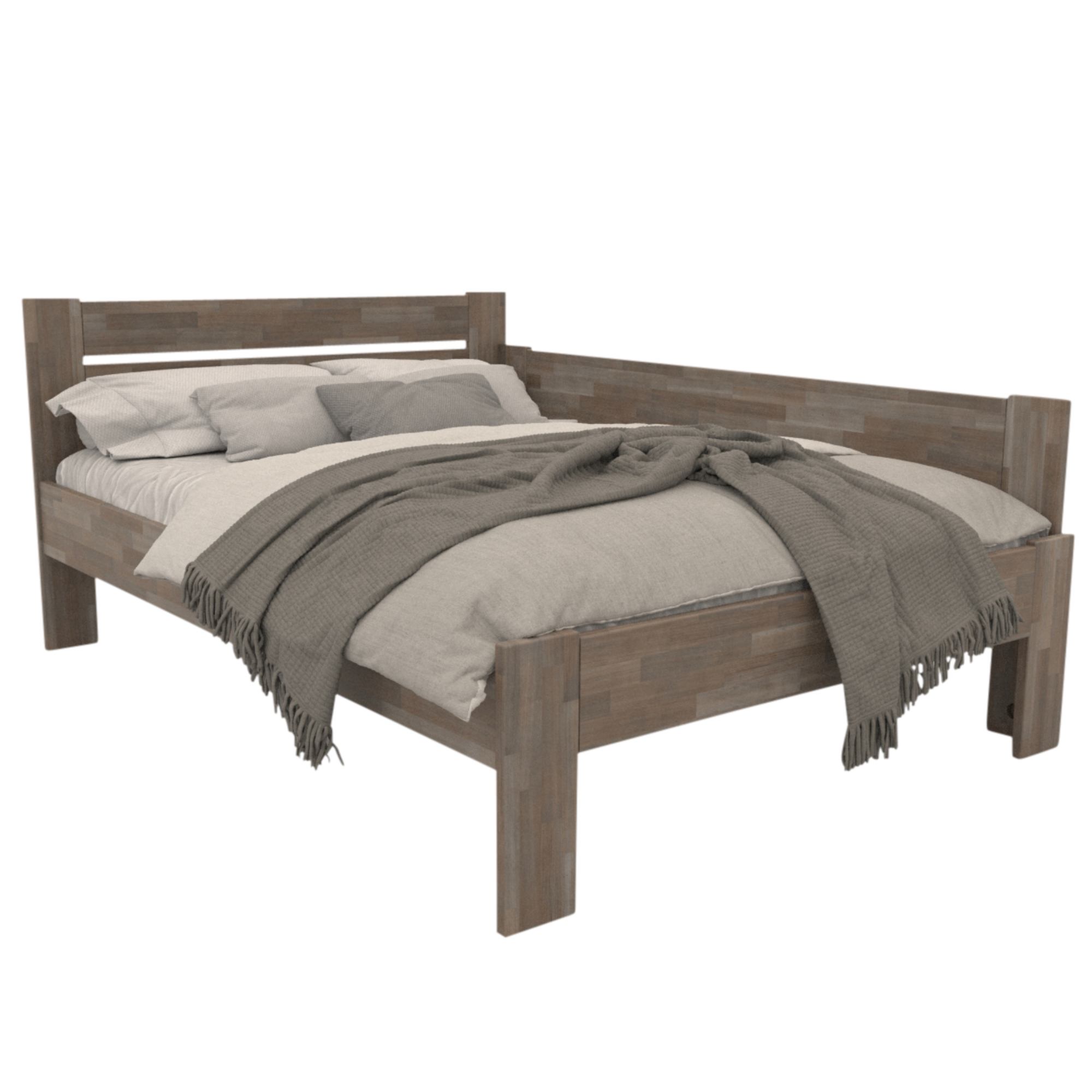 - Doplňující poznámka: Postel z bukového masivního dřeva je mořená do šedého odstínu. Maximální nosnost celé postele je 195 kg.