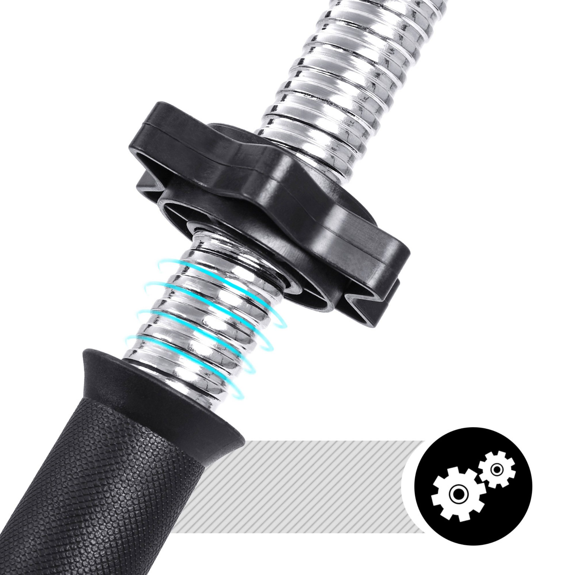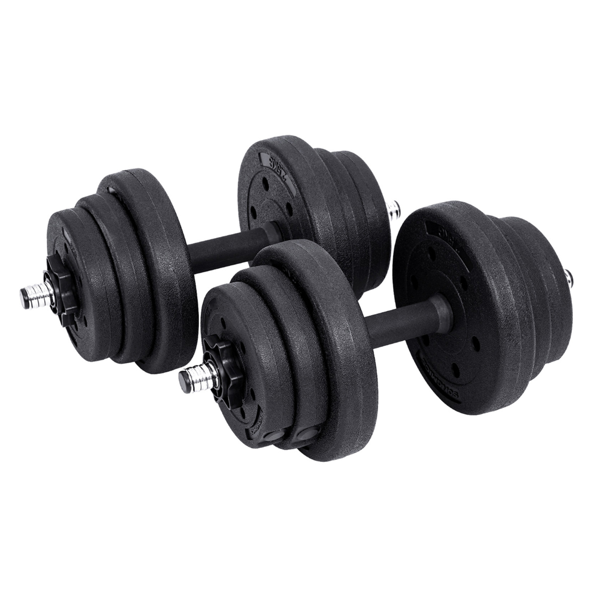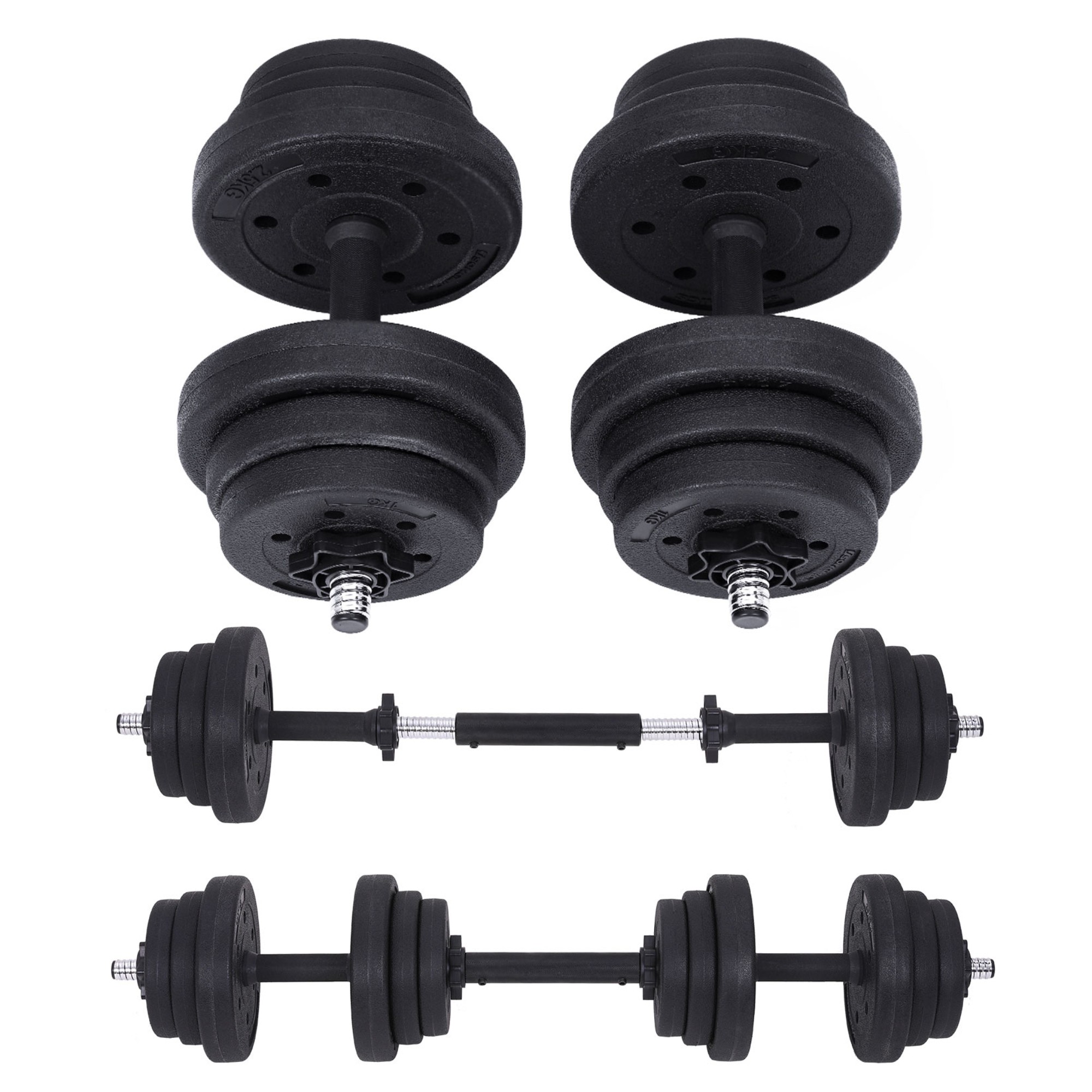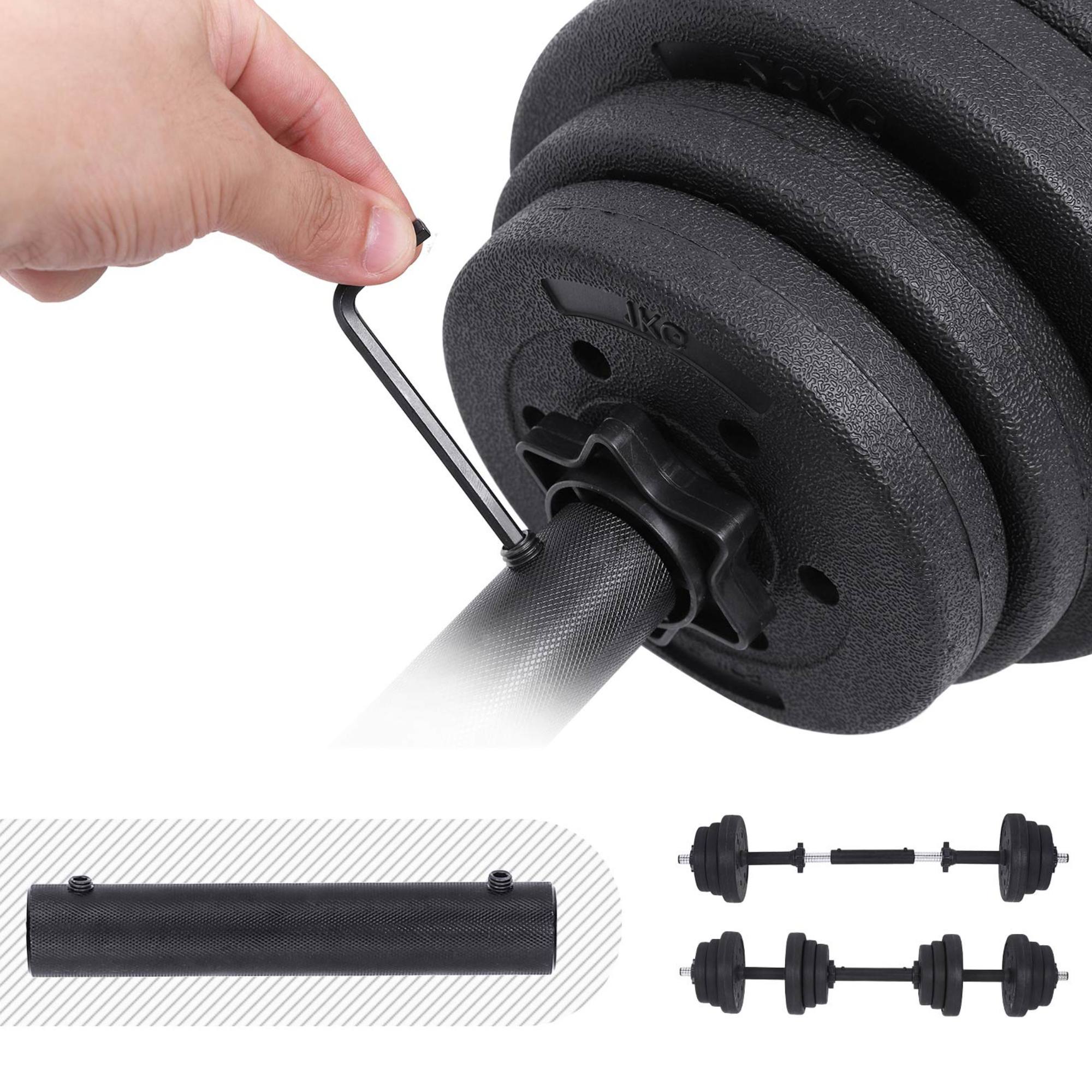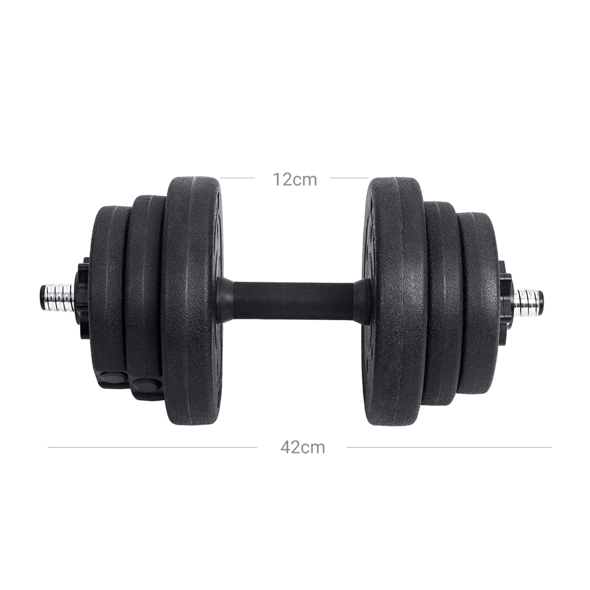 Díky možnosti nastavení hmotnosti můžete zátěž činek přesně přizpůsobit vaší aktuální kondici i cílům. Sada nabízí celkem 12 kotoučů různých vah: 4x2,5 kg, 4x1,25 kg a 4x1 kg. Ty lze snadno měnit podle potřeby, díky čemuž můžete přesně regulovat zátěž. Kotouče drží pevně na svém místě díky ocelovým zámkům. Součástí balení je i prodlužovací ocelová tyč, díky níž lze dvě činky spojit v jednu delší.