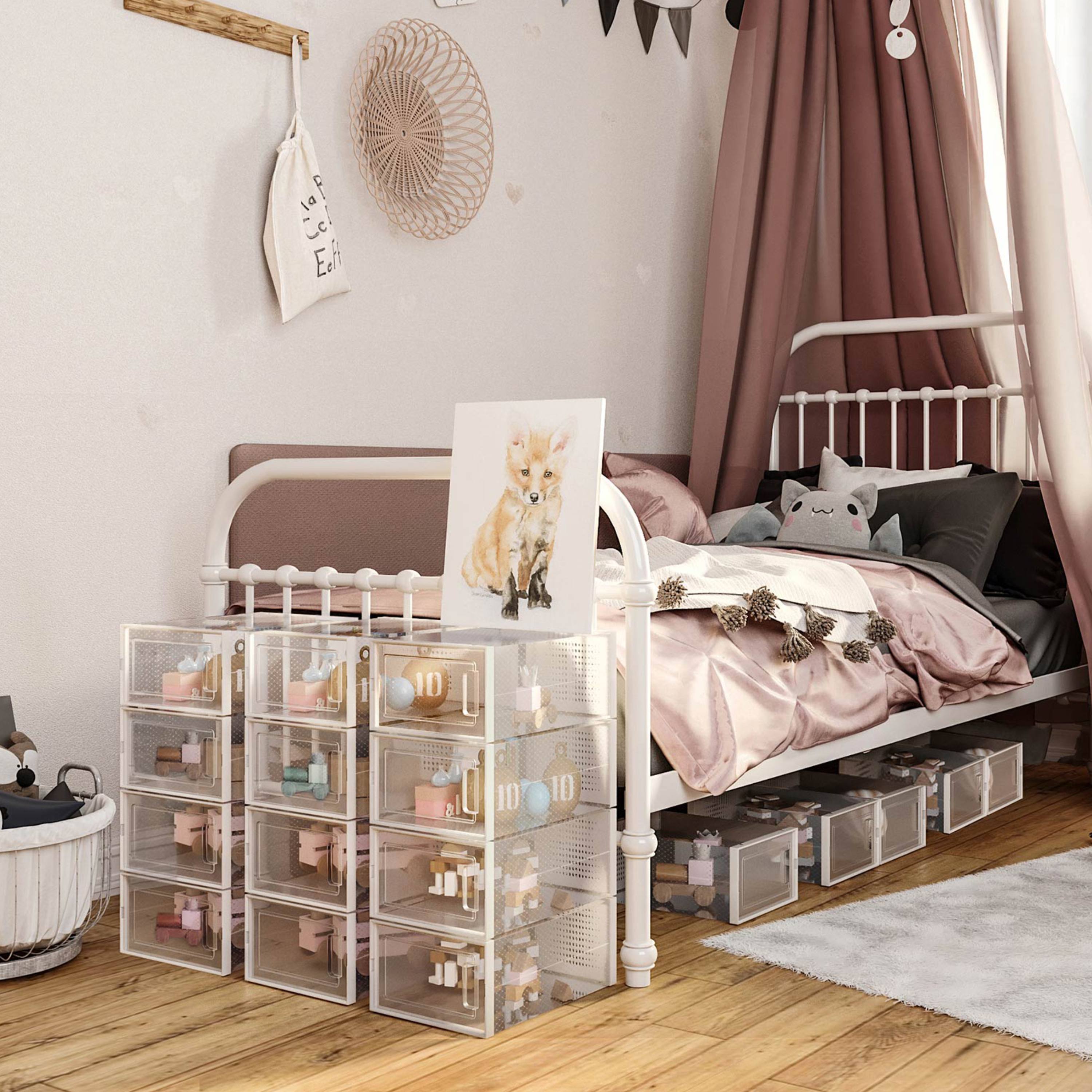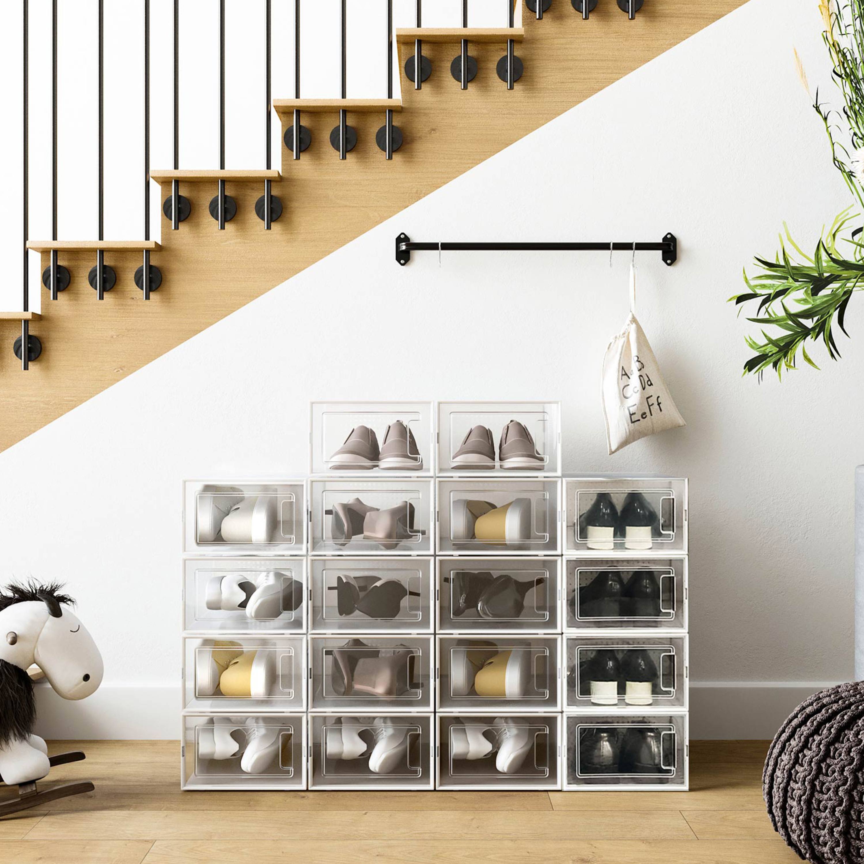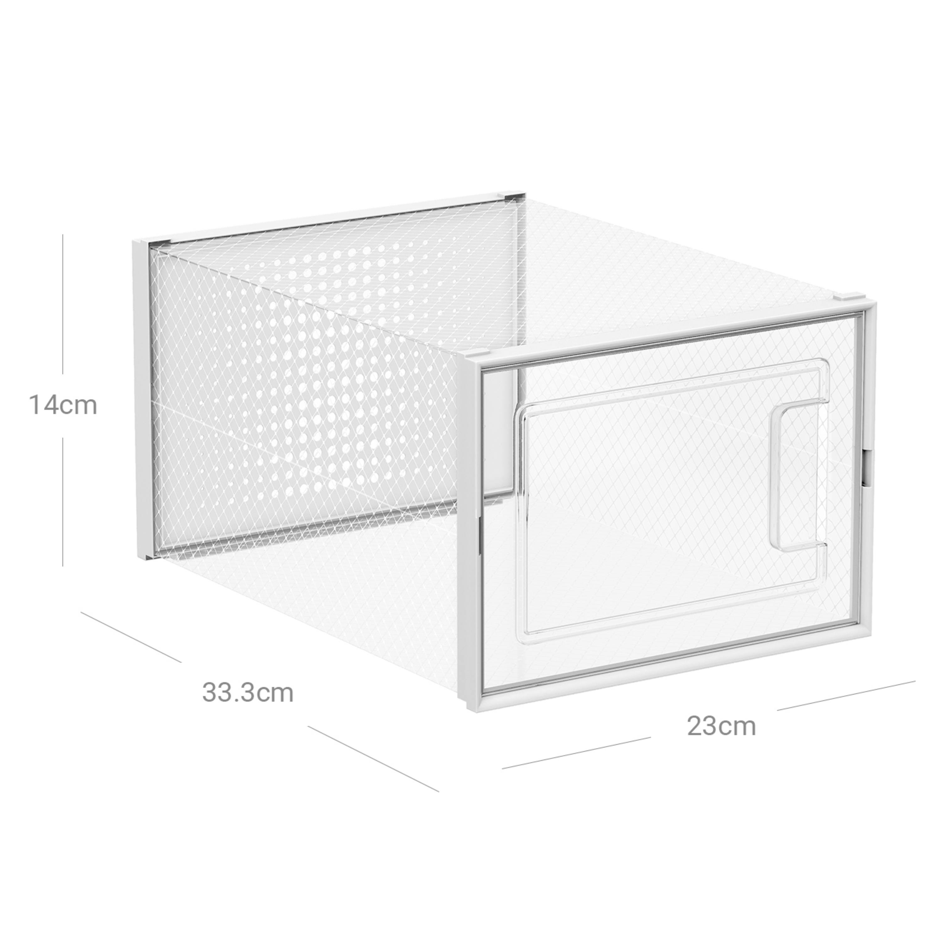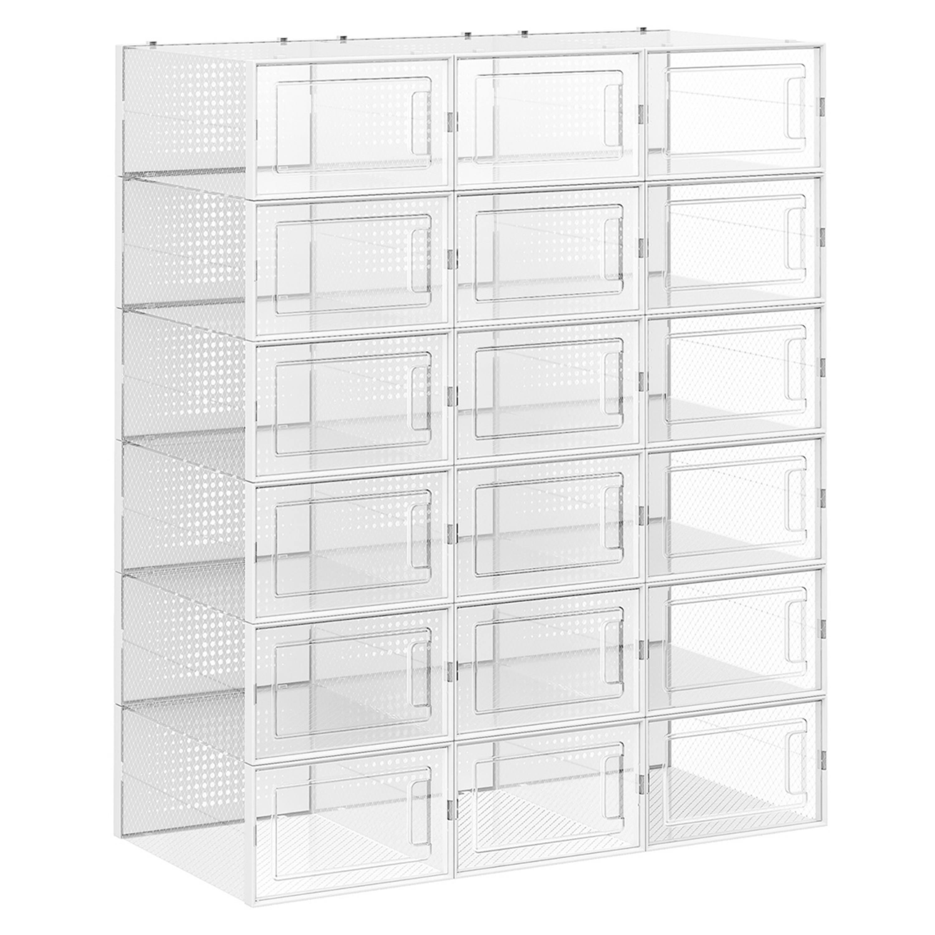 Sada se skládá z 18 kusů úložných boxů, které lze na sebe stohovat. Zasouvací drážky na každém boxu zajišťují stabilitu sestavy. Jsou vybaveny otočnými dvířky pro rychlý přístup. Lze je také snadno rozložit, když nejsou využívány. Praktickým doplňkem jsou větrací otvory, díky nimž jsou boxy skvělou volbou na uložení obuvi. Díky jejich průhlednému provedení máte přehled nad každým párem.