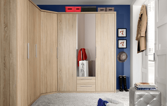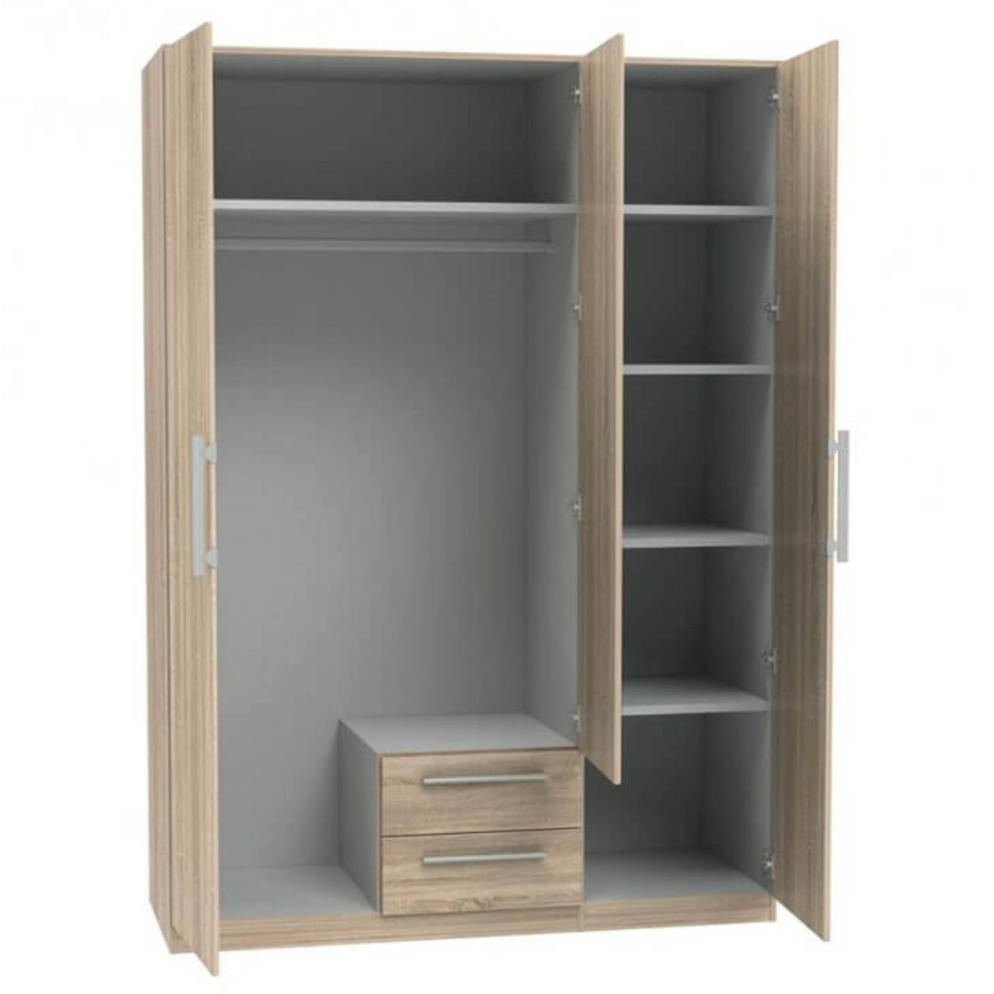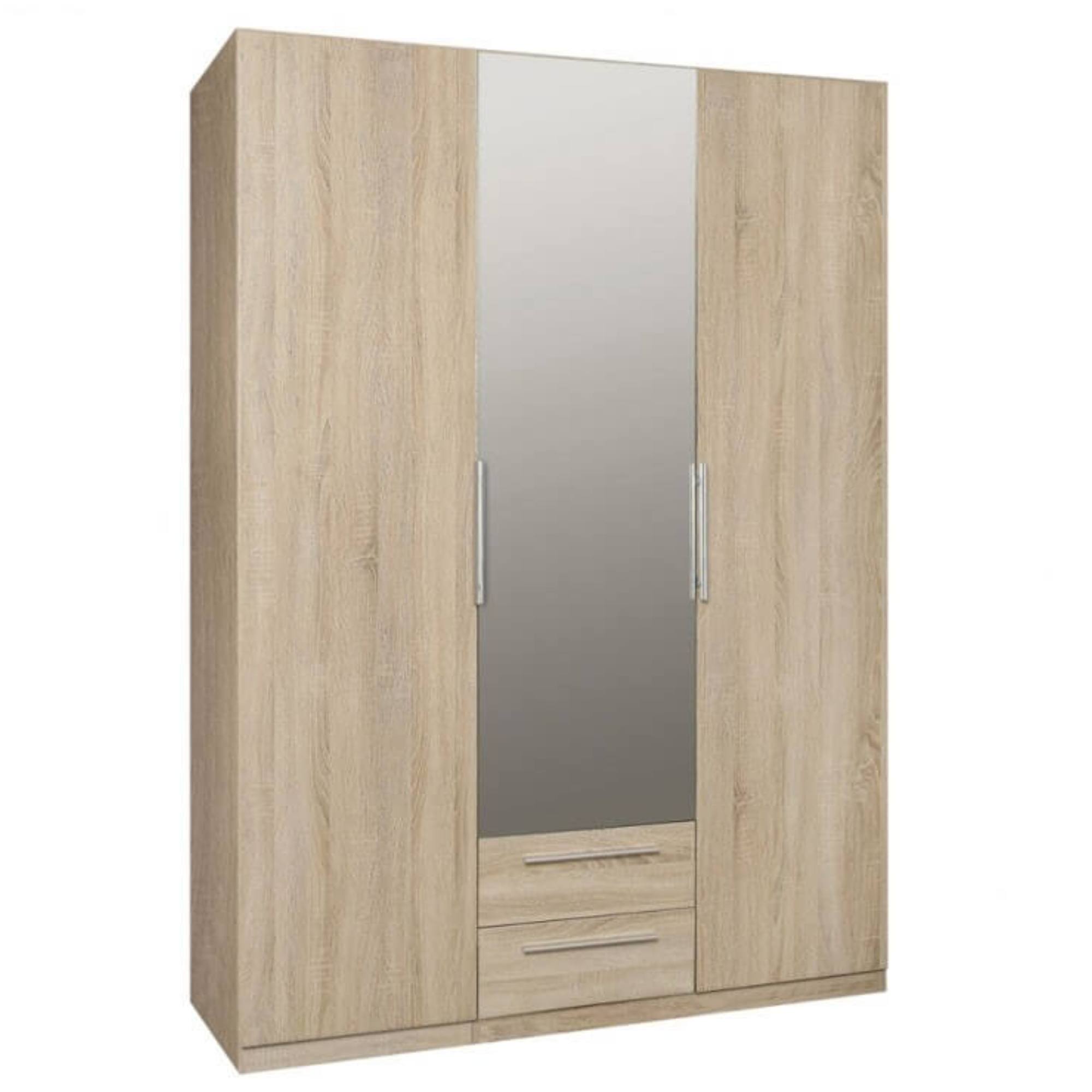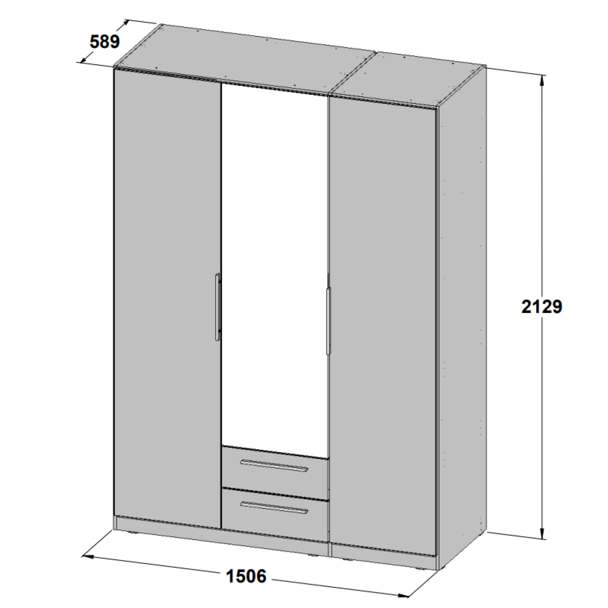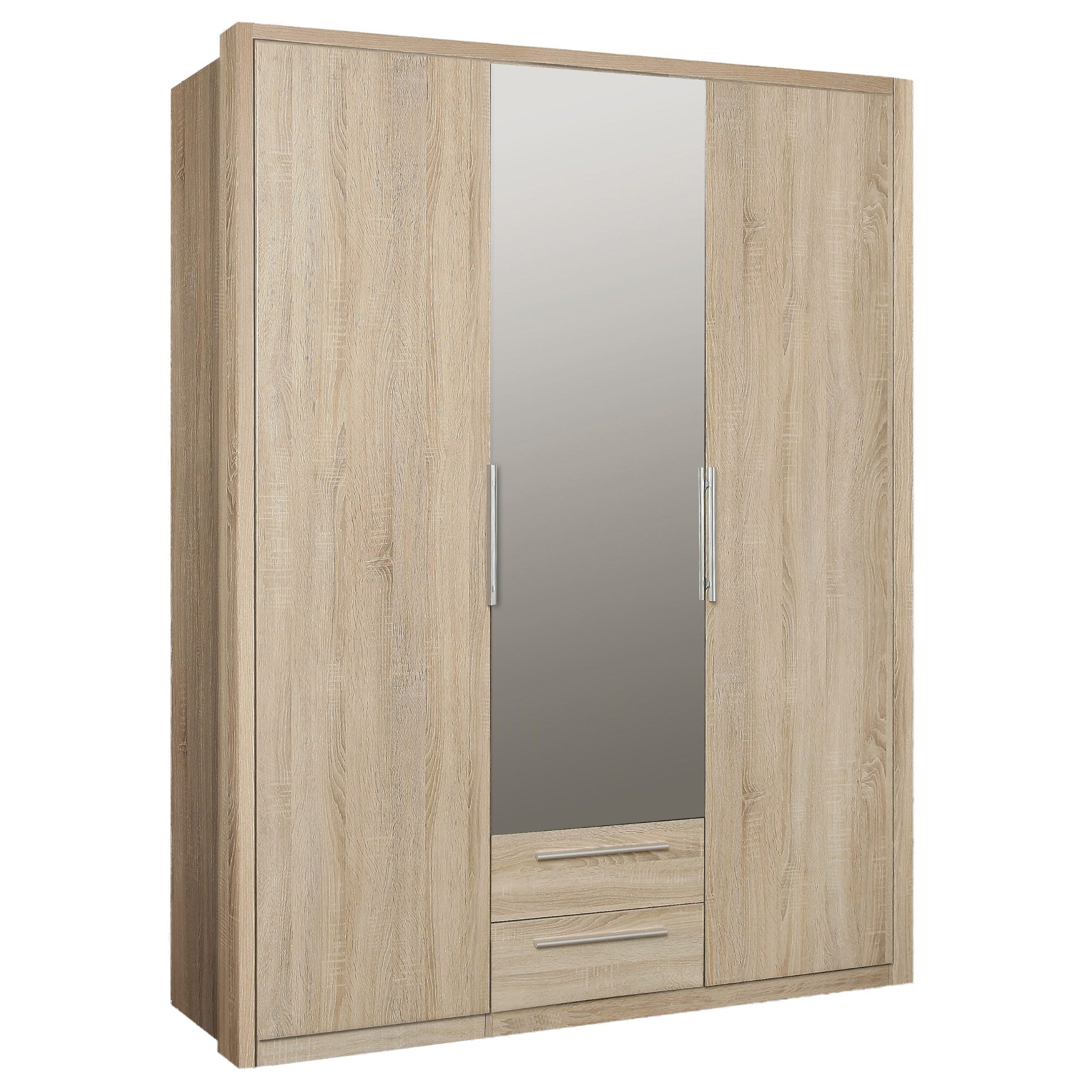 Skříň má 3 otočné dveře, z nichž 1 jsou vybaveny praktickým zrcadlem. Vnitřní vybavení je sestaveno z 5 vložených polic a 1 šatní tyče. Decentní úchytky usnadňují otevírání jednotlivých částí skříně. Na spodní straně skříně se nacházejí šikovné zásuvky. Skříň je vyrobena z laminovaného dřevěného materiálu, který je nenáročný na údržbu. Horní rámová lišta je součástí balení. Boční rámovou lištu lze dokoupit zvlášť.