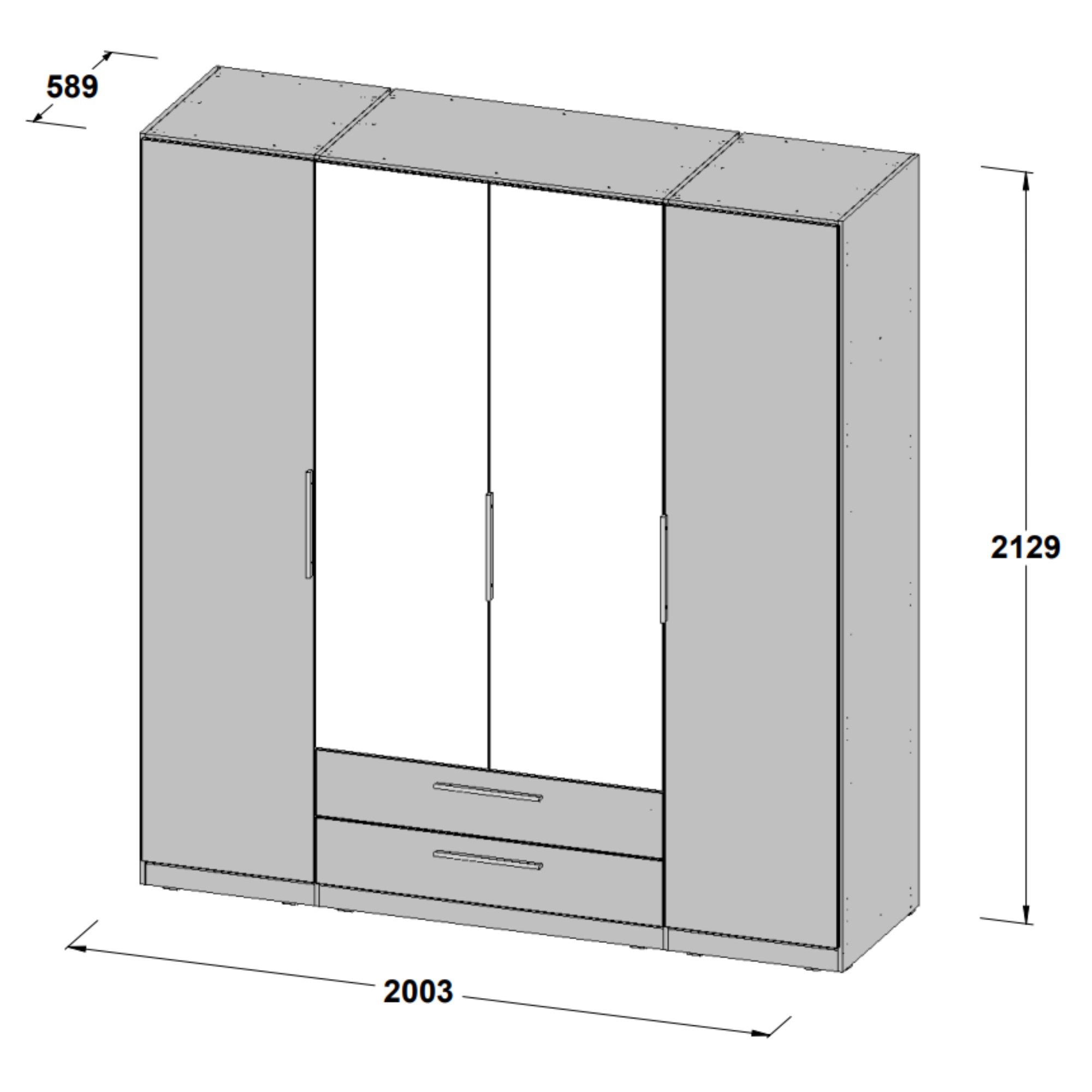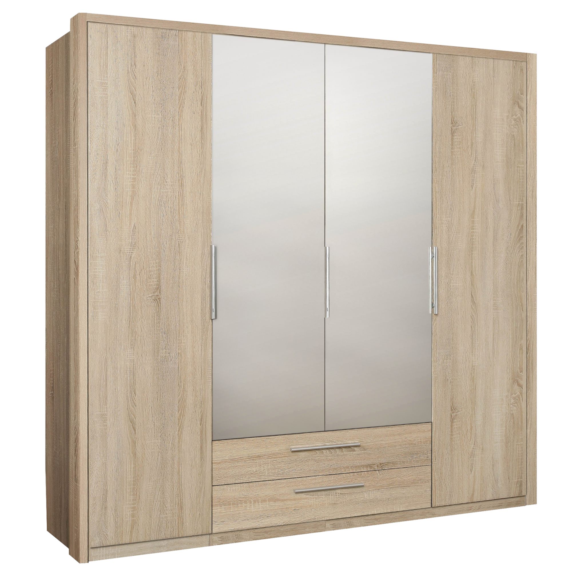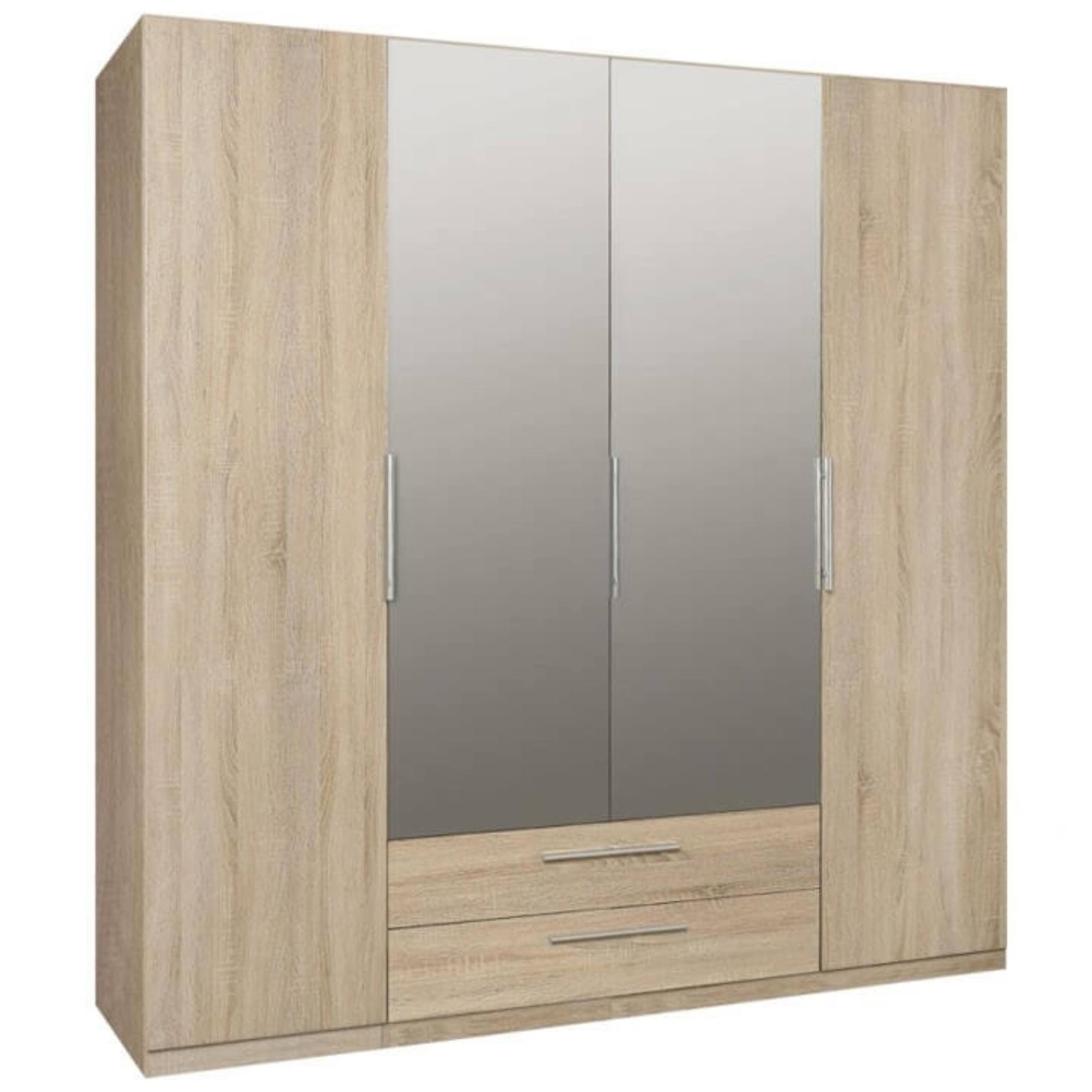 Skříň má 4 otočné dveře, z nichž 2 jsou vybaveny praktickým zrcadlem. Vnitřní vybavení je sestaveno z 6 vložených polic a 2 šatních tyčí. Decentní úchytky usnadňují otevírání jednotlivých částí skříně. Na spodní straně skříně se nacházejí podlouhlé zásuvky. Skříň je vyrobena z laminovaného dřevěného materiálu, který je nenáročný na údržbu. Horní rámová lišta je součástí balení. Boční rámovou lištu lze dokoupit zvlášť.