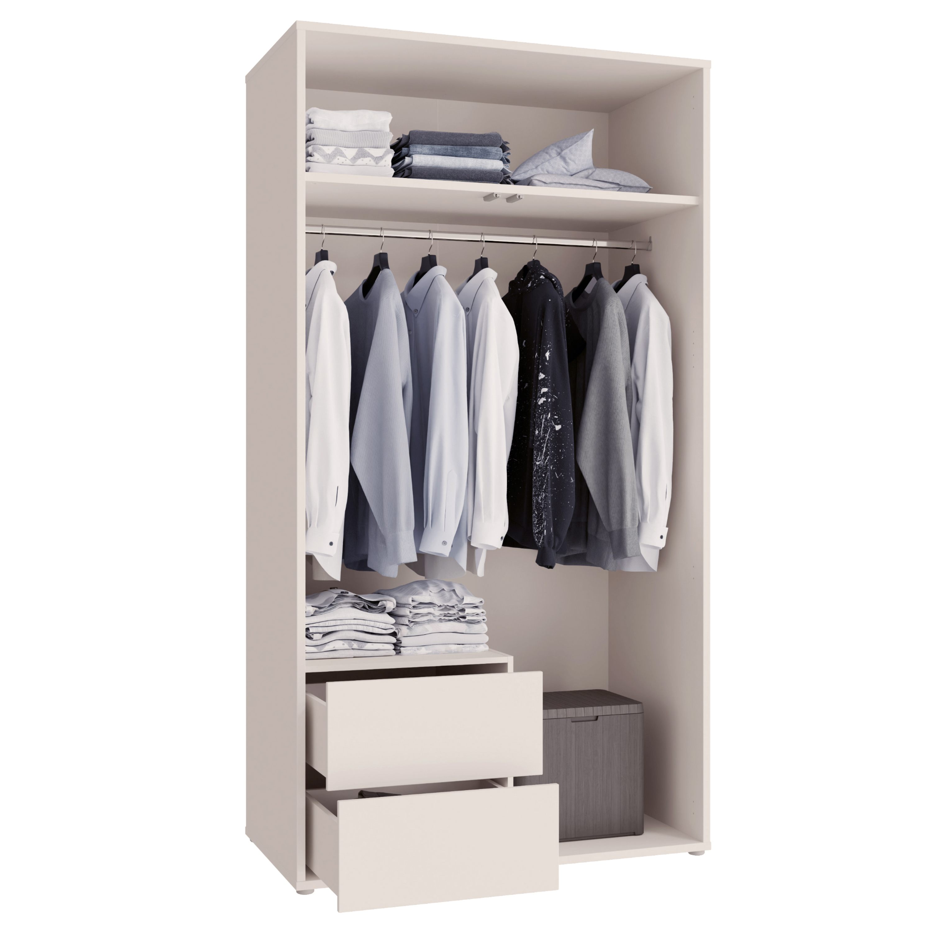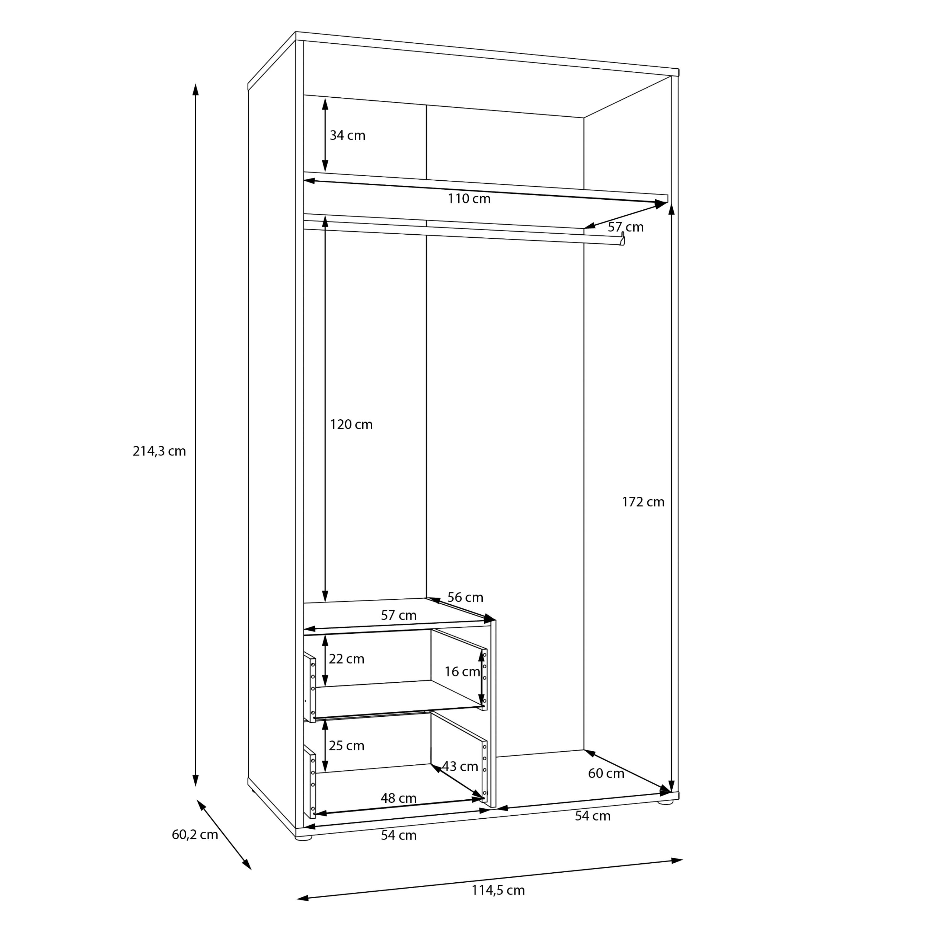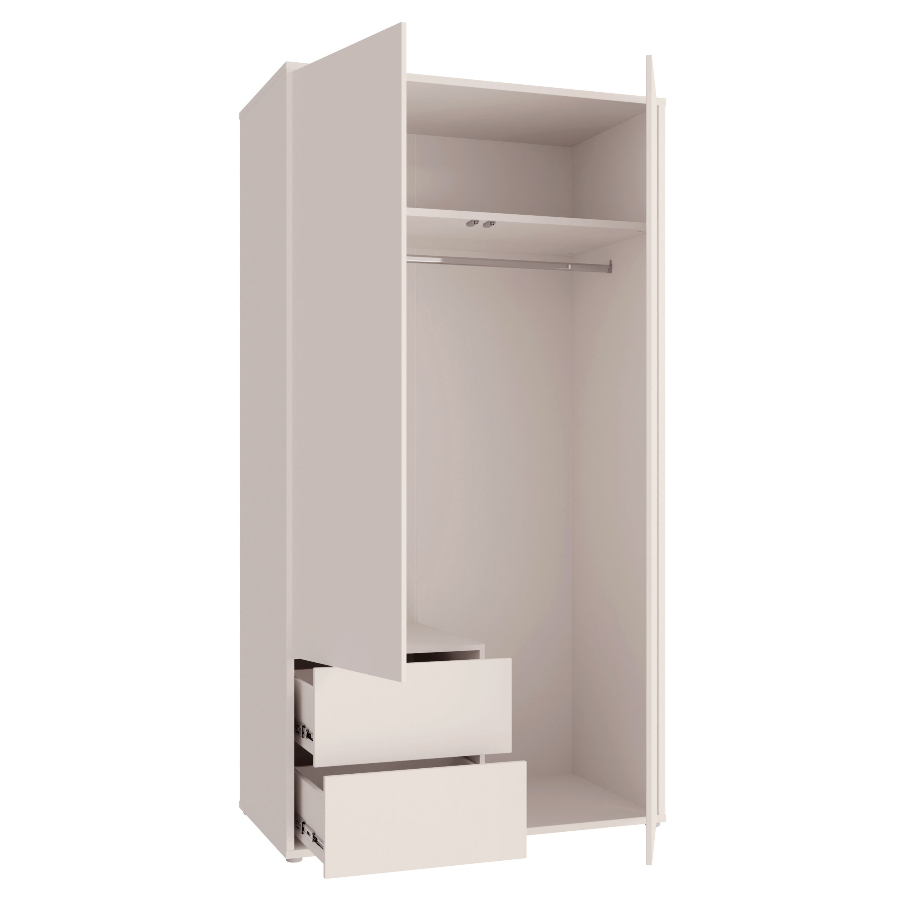 Skříň uzavírají klasické otočné dveře, za kterými se nachází široká šatní tyč doplněná o prostornou vloženou polici nad ní. Toto uspořádání umožňuje přehledné uložení jak zavěšeného oblečení, tak složených věcí a doplňků. Na levé straně se navíc nachází 2 zásuvky, které poskytují ideální místo pro uložení drobnějších kousků oblečení nebo doplňků. Dveře a zásuvky jsou vybaveny systémem push to open, který umožňuje snadné otevírání bez použití úchytek a podtrhuje čistý minimalistický vzhled.