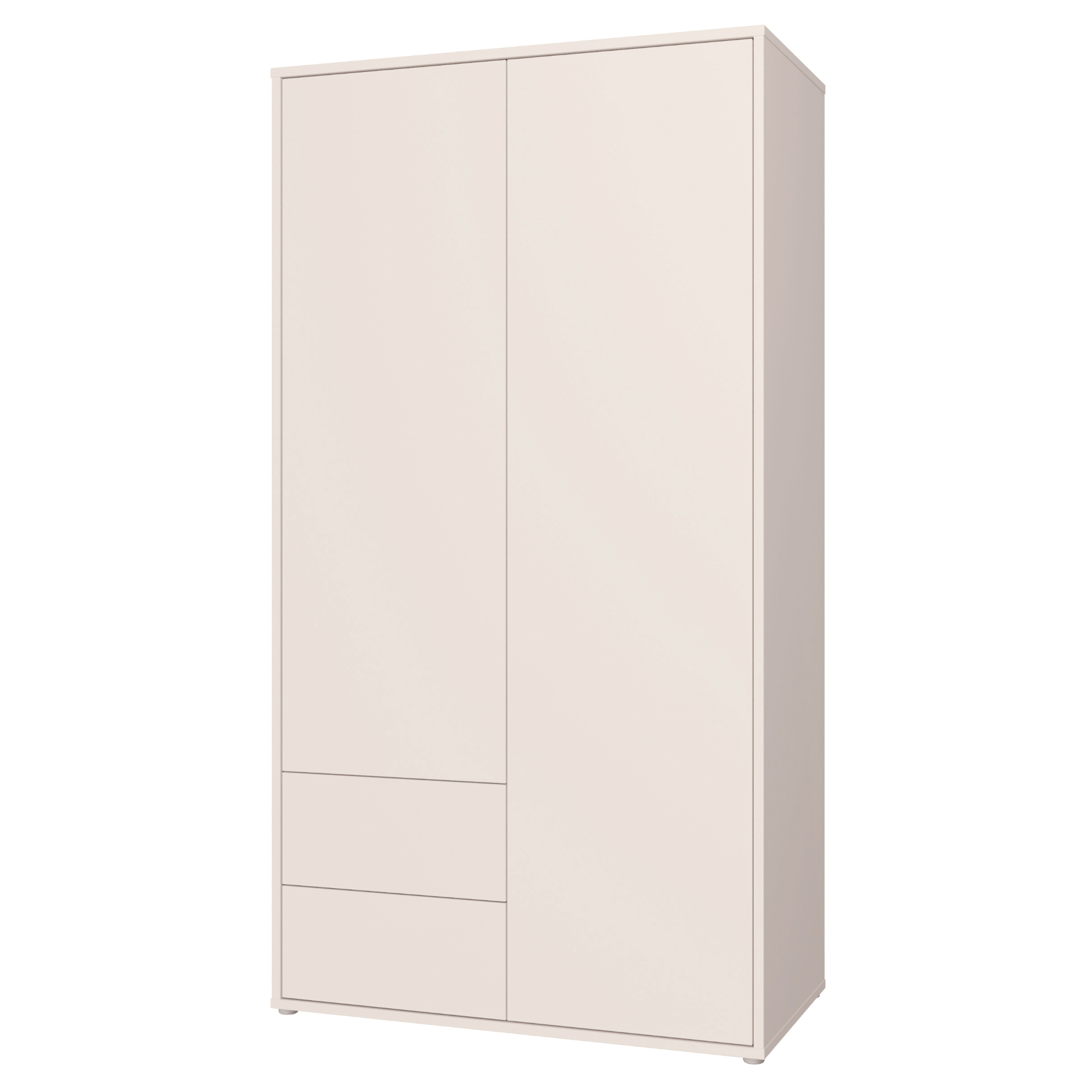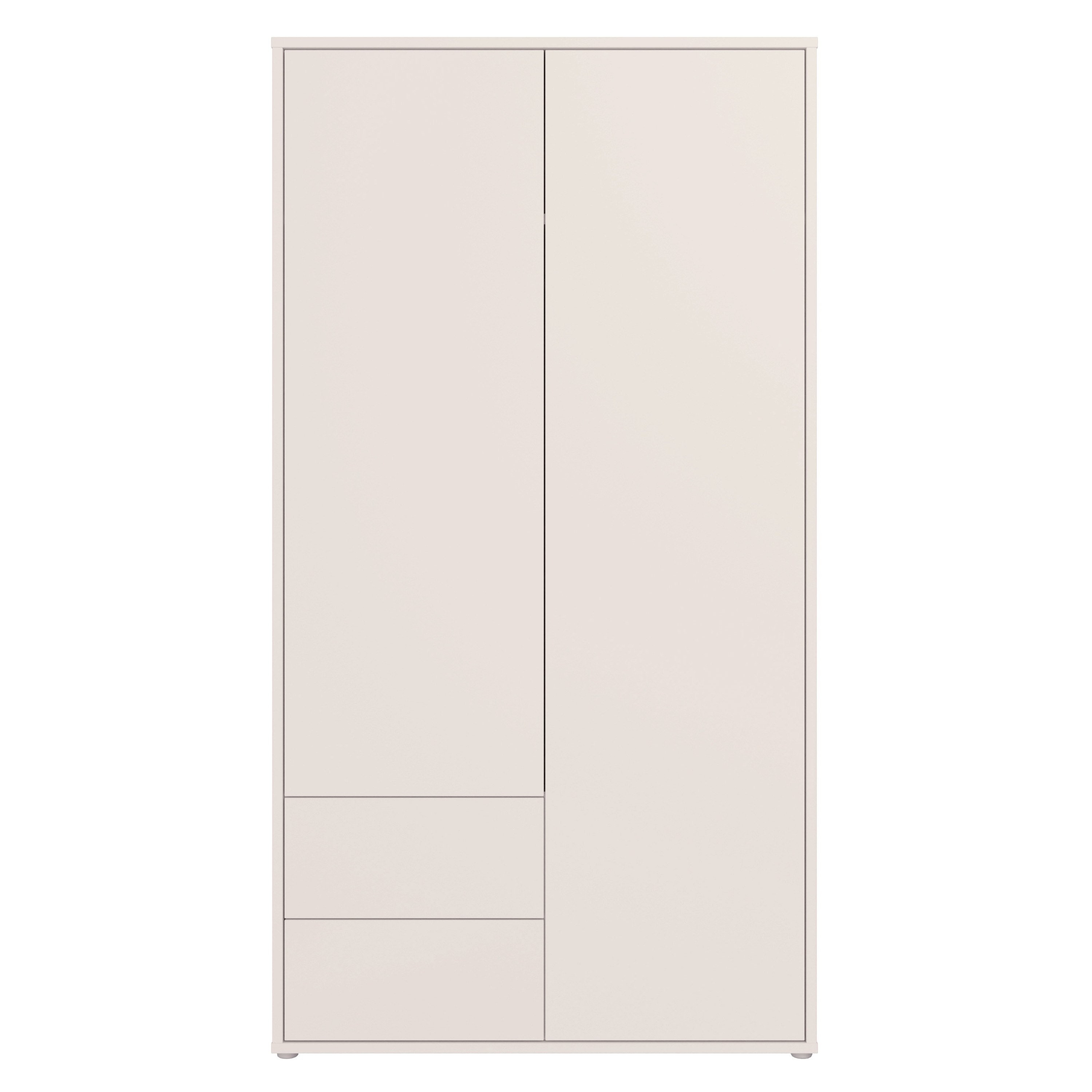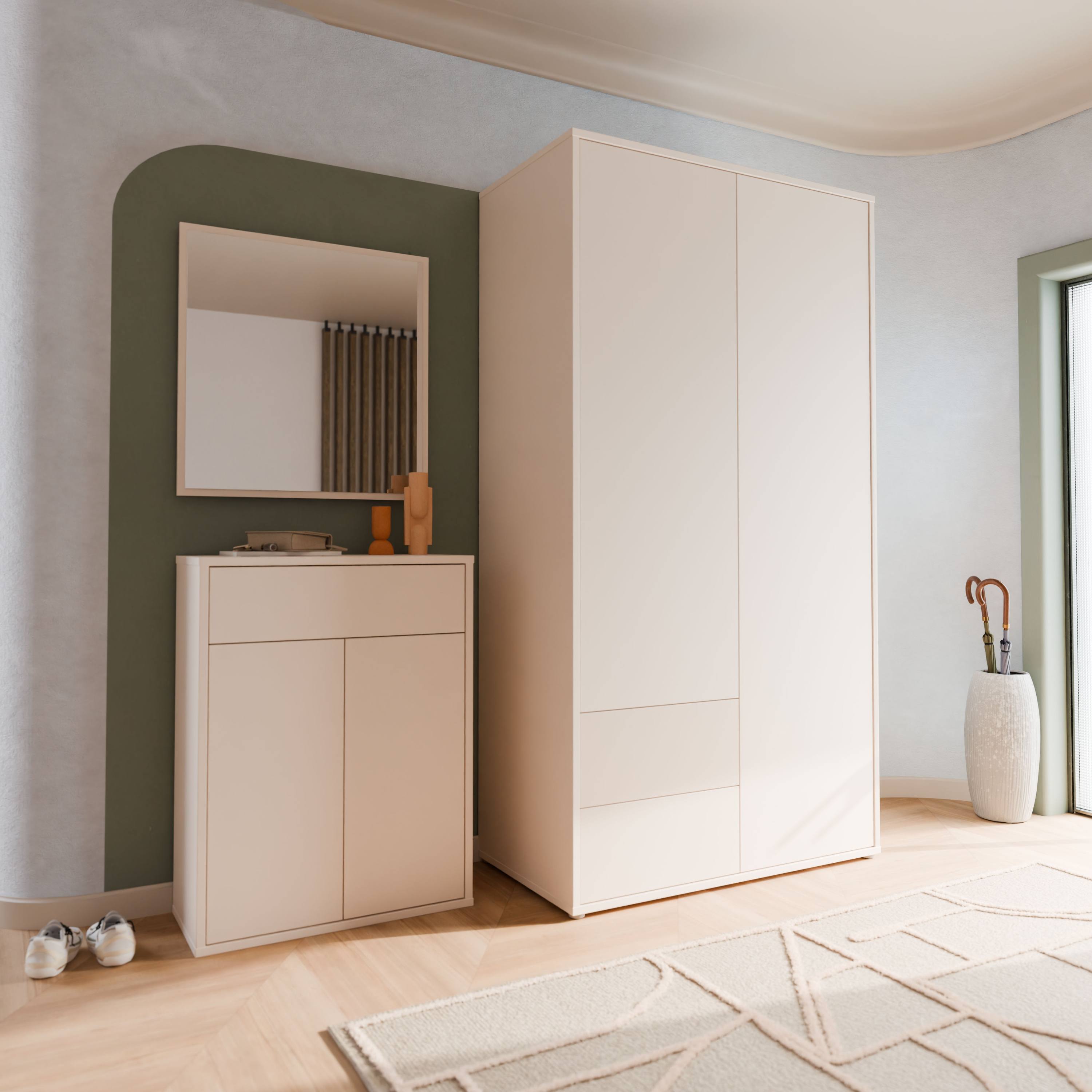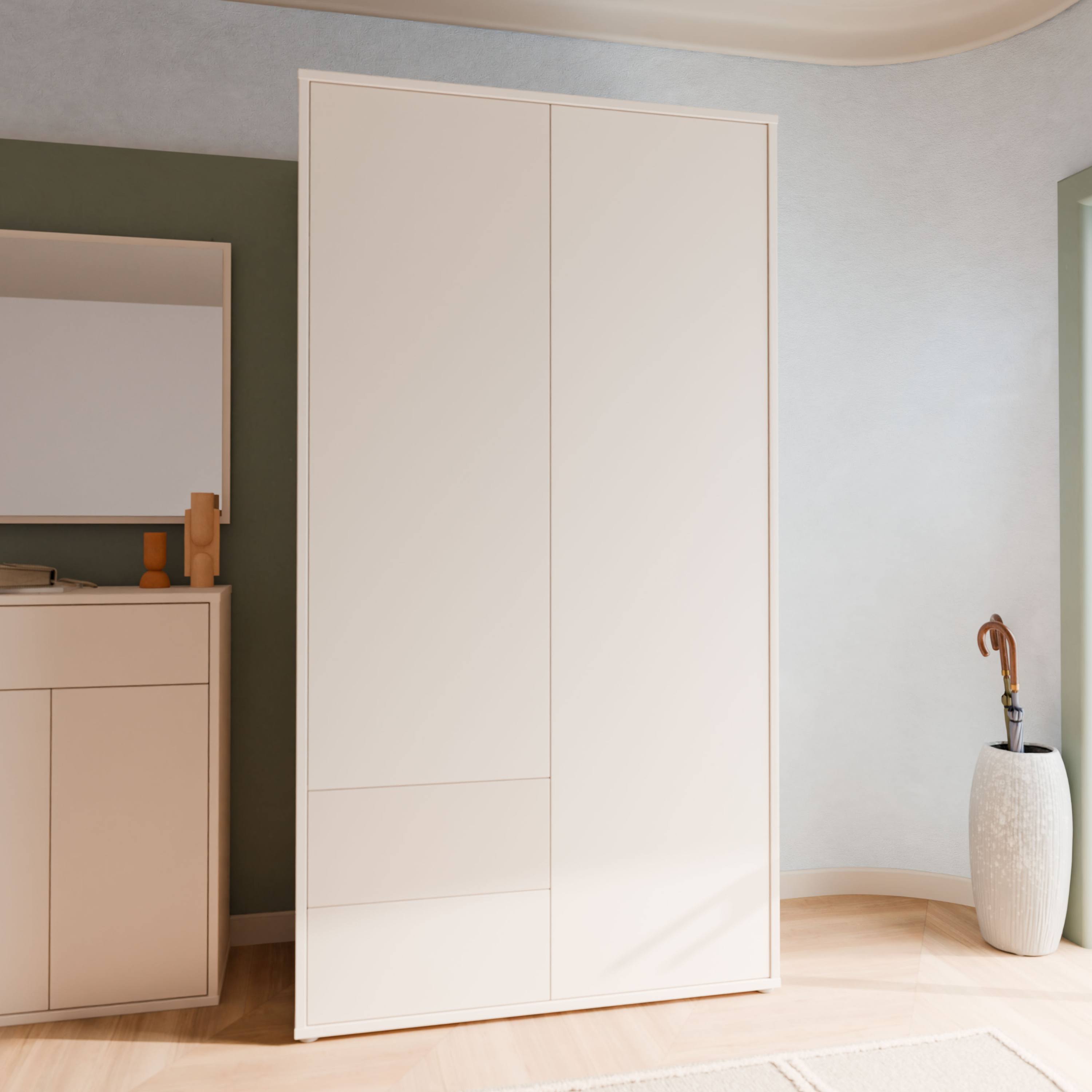 Skříň uzavírají klasické otočné dveře, za kterými se nachází široká šatní tyč doplněná o prostornou vloženou polici nad ní. Toto uspořádání umožňuje přehledné uložení jak zavěšeného oblečení, tak složených věcí a doplňků. Na levé straně se navíc nachází 2 zásuvky, které poskytují ideální místo pro uložení drobnějších kousků oblečení nebo doplňků. Dveře a zásuvky jsou vybaveny systémem push to open, který umožňuje snadné otevírání bez použití úchytek a podtrhuje čistý minimalistický vzhled.