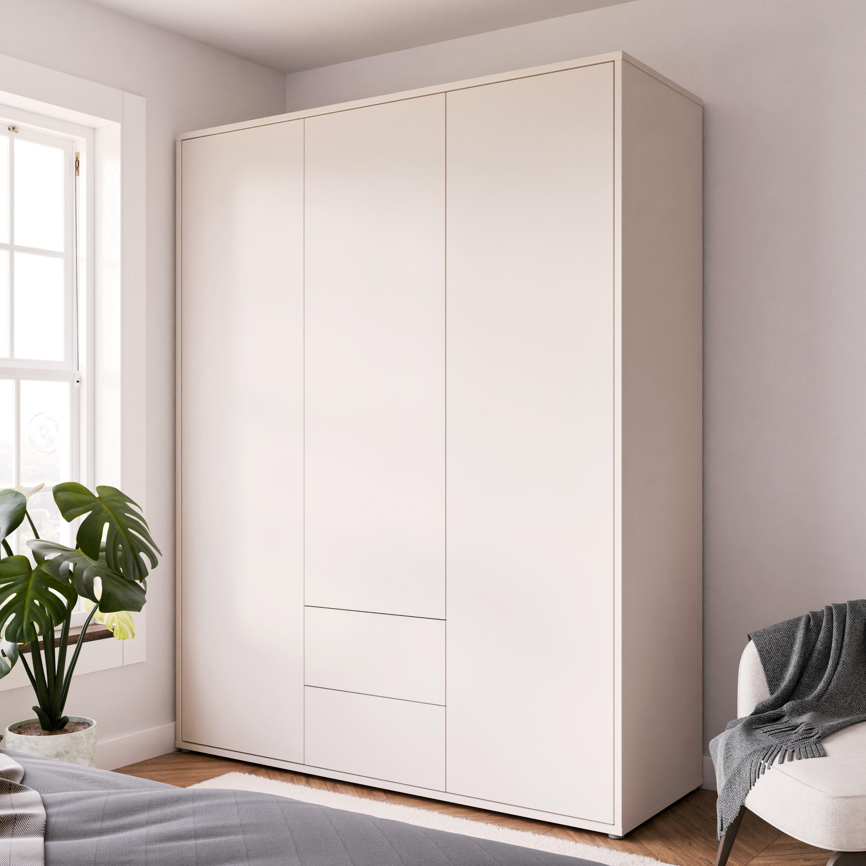 Šatní skříň ALICE 2 v moderním minimalistickém designu s čistými liniemi nabízí praktické vnitřní uspořádání, díky kterému snadno udržíte pořádek ve svém oblečení a doplňcích.