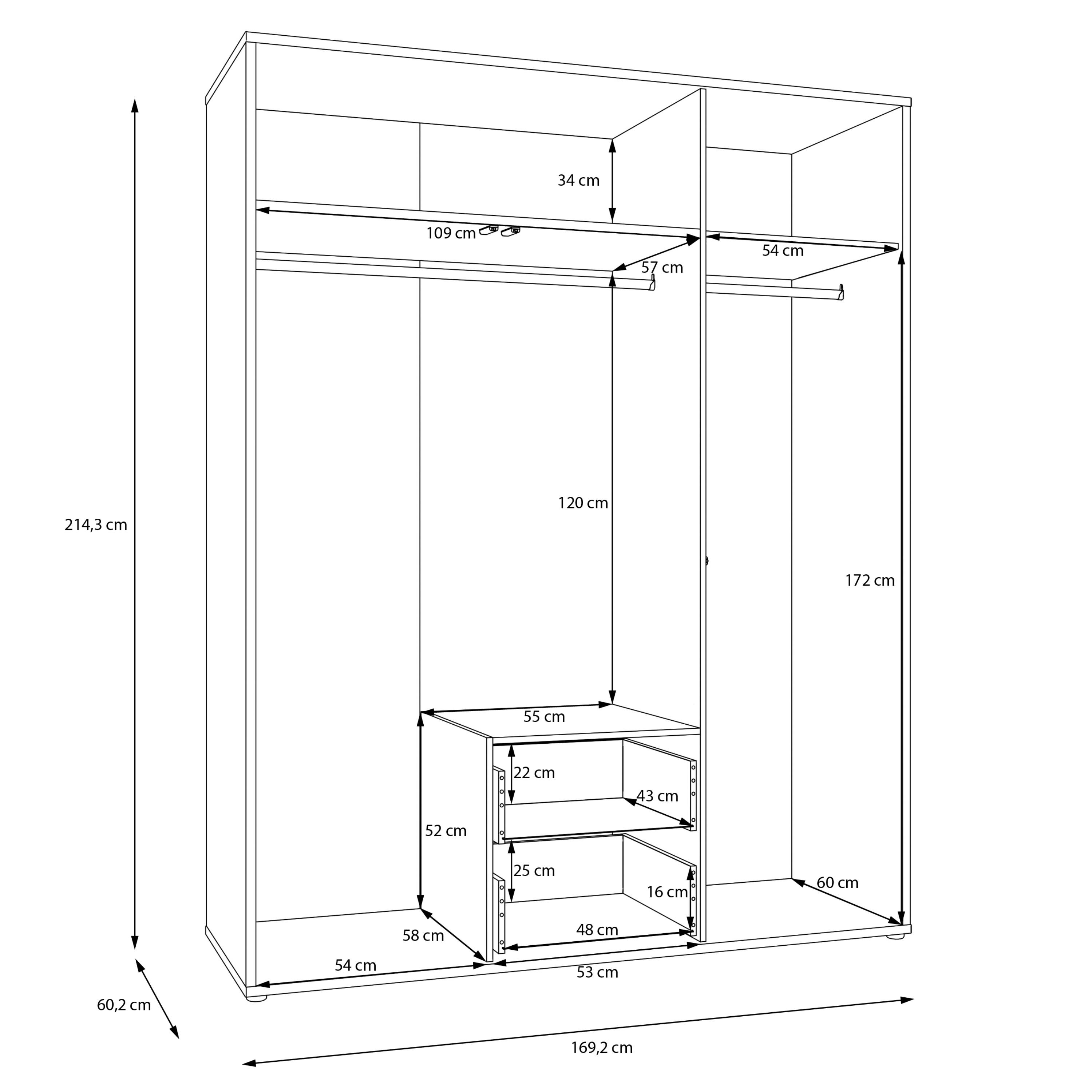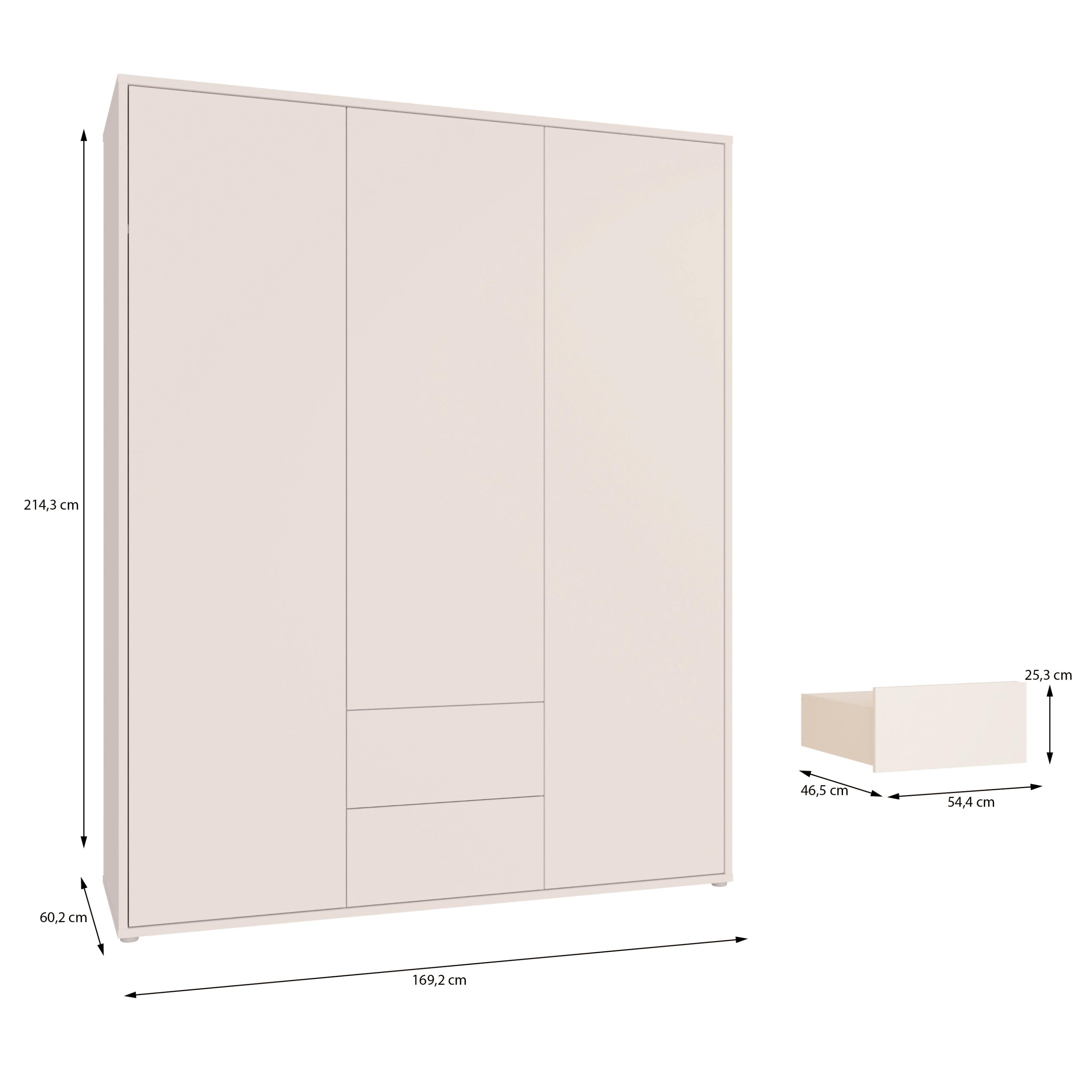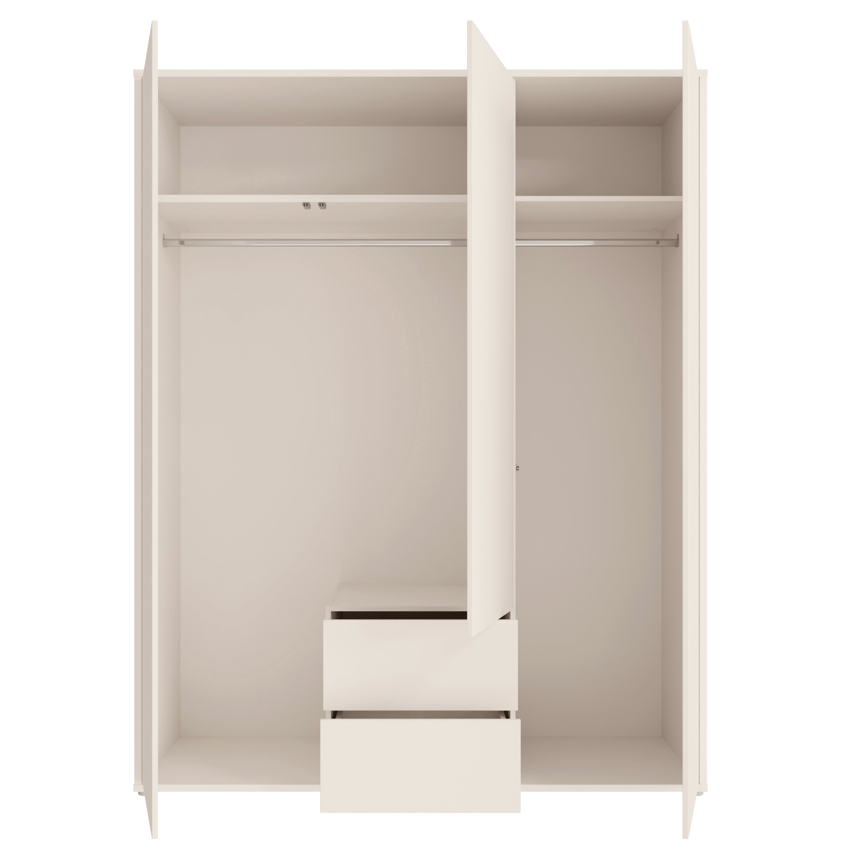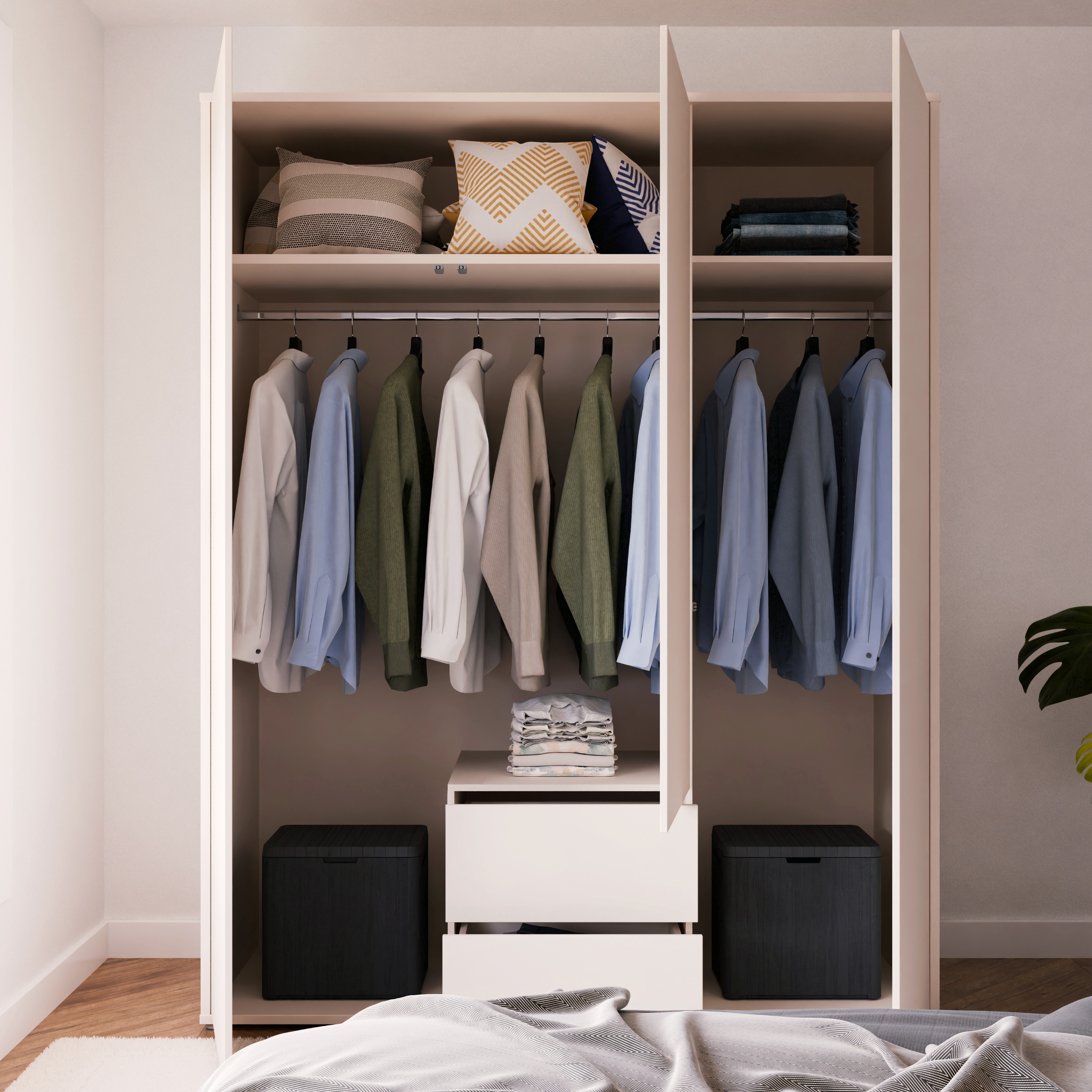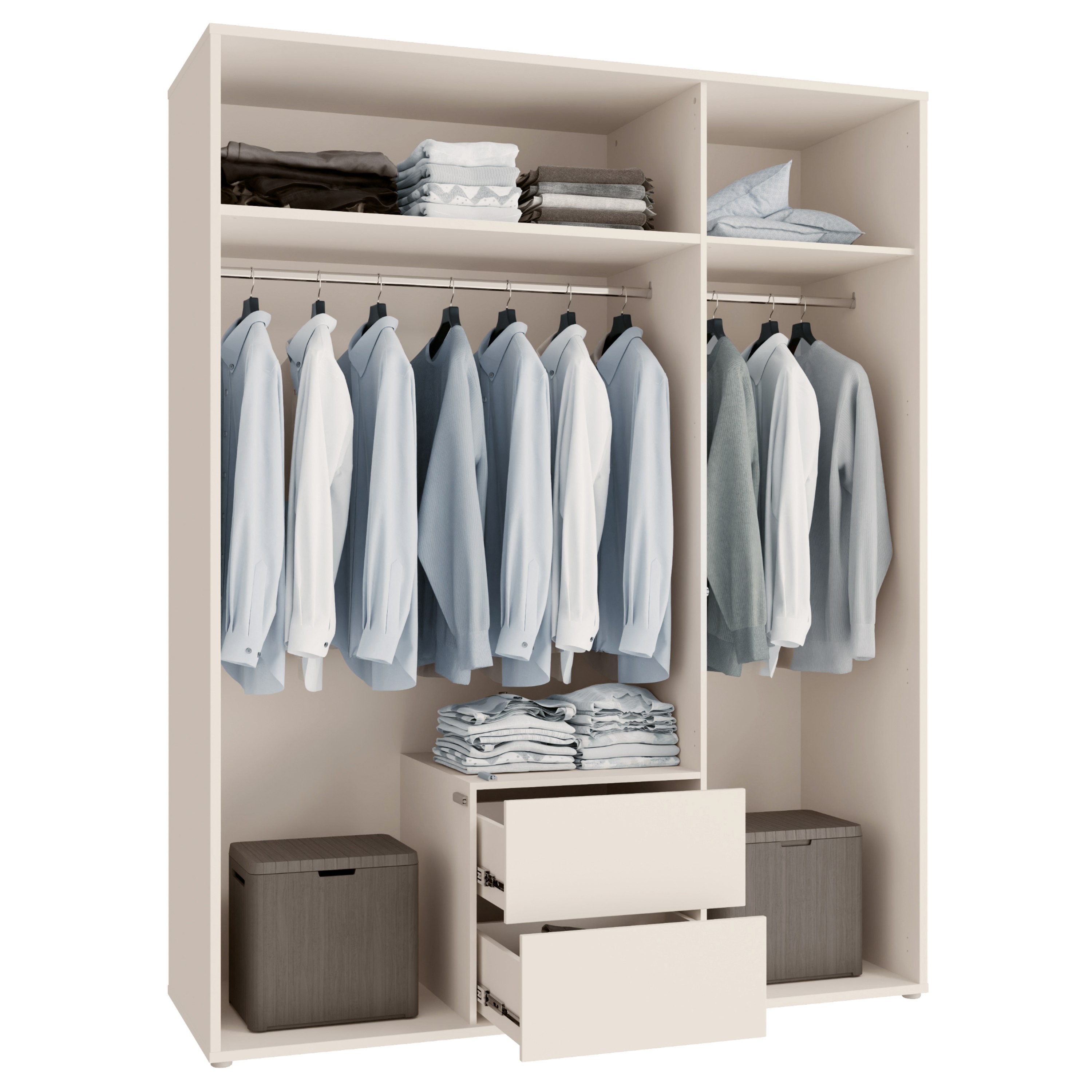 Vnitřní prostor je rozdělen na 2 části. Za párem dveří se nachází široká šatní tyč a prostorná police, zatímco za samostatnými dveřmi je k dispozici další šatní tyč doplněná o vloženou polici. Toto uspořádání umožňuje přehledné uložení jak zavěšeného oblečení, tak složených věcí a doplňků. Ve spodní části se navíc nachází 2 zásuvky, které poskytují ideální místo pro uložení drobnějších kousků oblečení nebo doplňků. Dveře a zásuvky jsou vybaveny systémem push to open, který umožňuje snadné otevírání bez použití úchytek a podtrhuje čistý minimalistický vzhled.