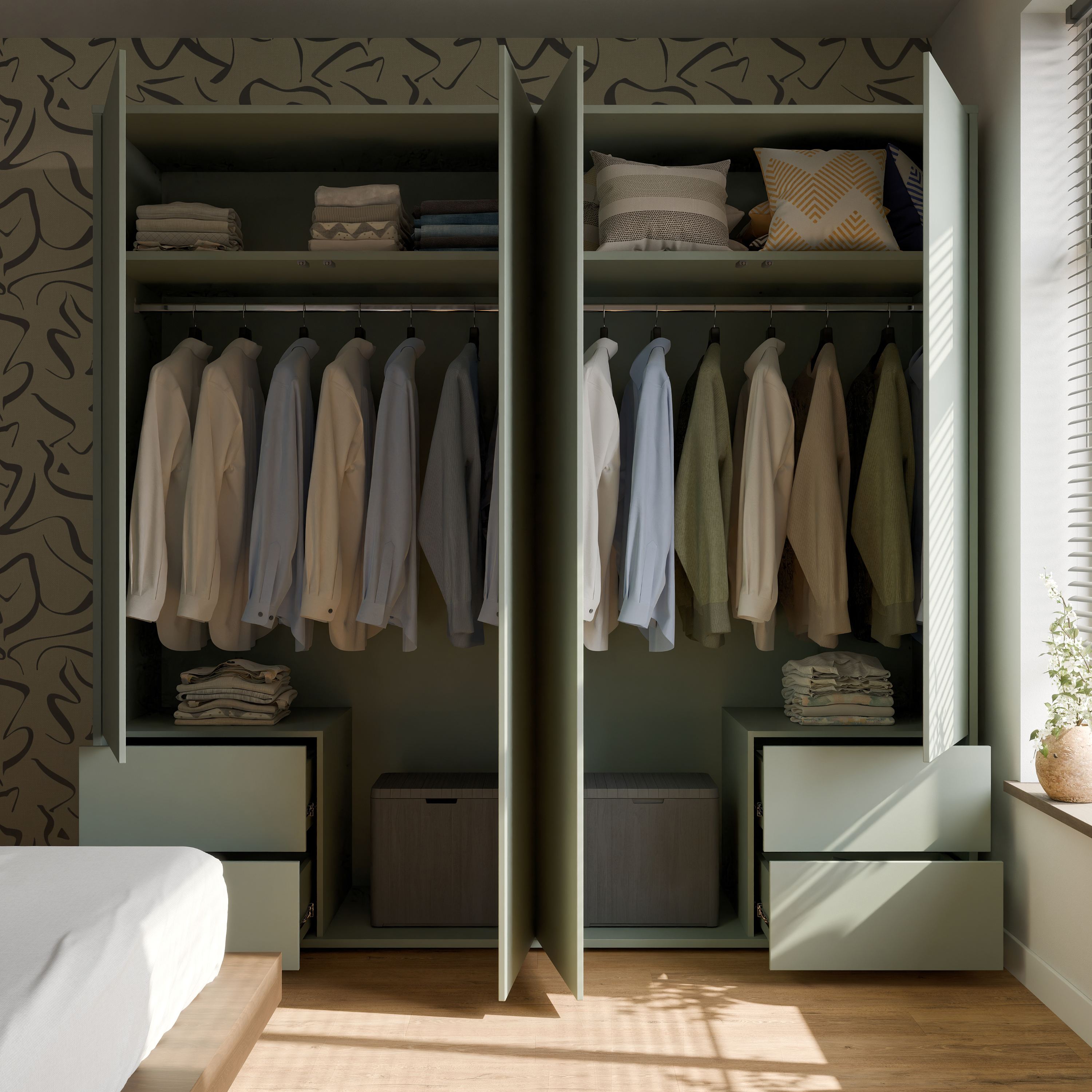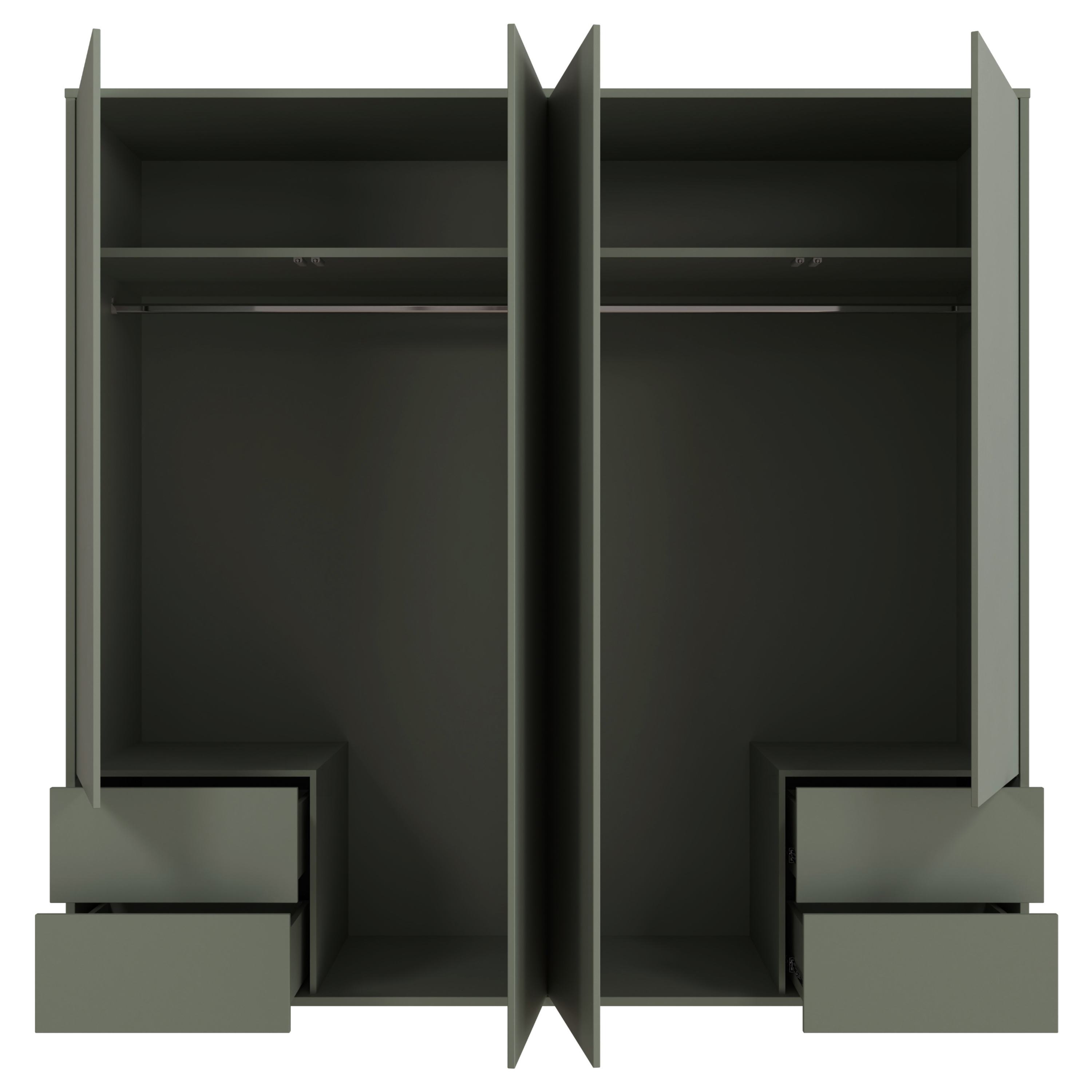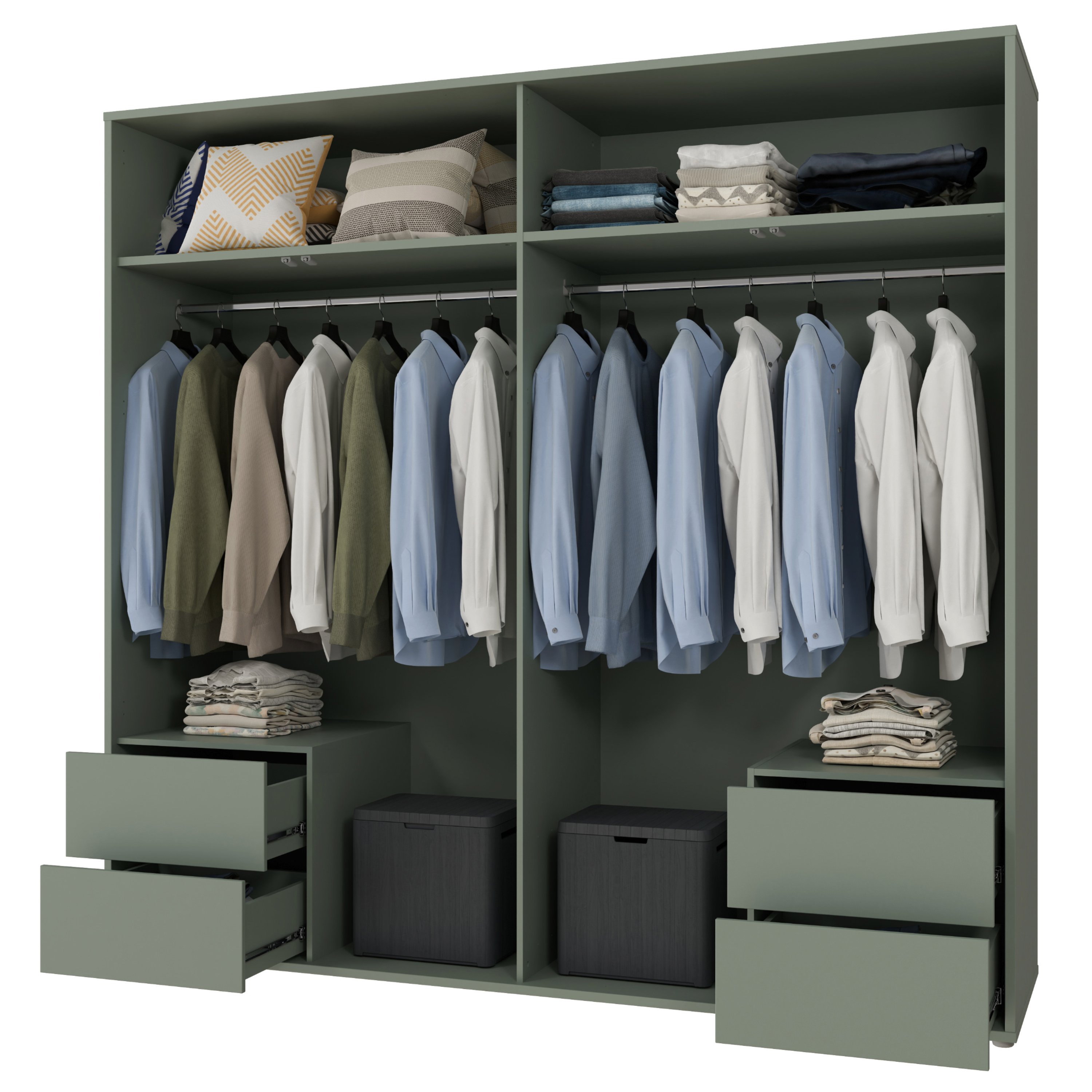 Vnitřní prostor je rozdělen na 2 části, kdy za každým párem otočných dveří se nachází široká šatní tyč doplněná o prostornou vloženou polici nad ní. Toto uspořádání umožňuje přehledné uložení jak zavěšeného oblečení, tak složených věcí a doplňků. Ve spodní části se navíc nachází 2 zásuvky na každé straně, které poskytují ideální místo pro uložení drobnějších kousků oblečení nebo doplňků. Dveře a zásuvky jsou vybaveny systémem push to open, který umožňuje snadné otevírání bez použití úchytek a podtrhuje čistý minimalistický vzhled.