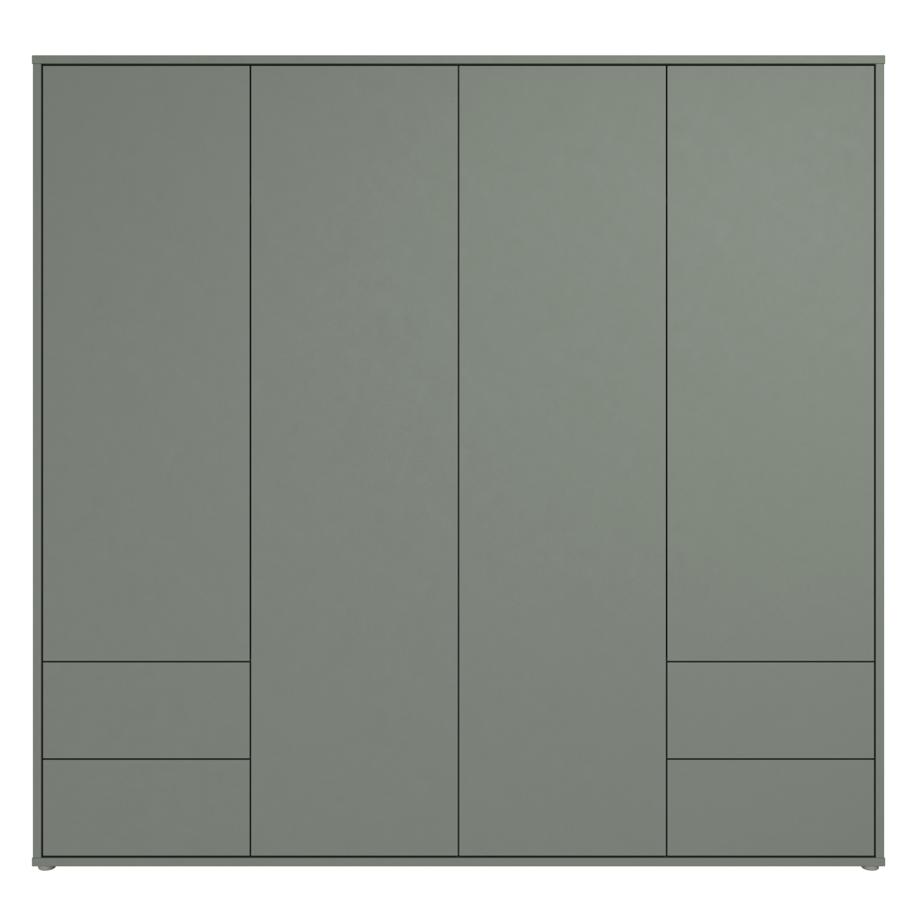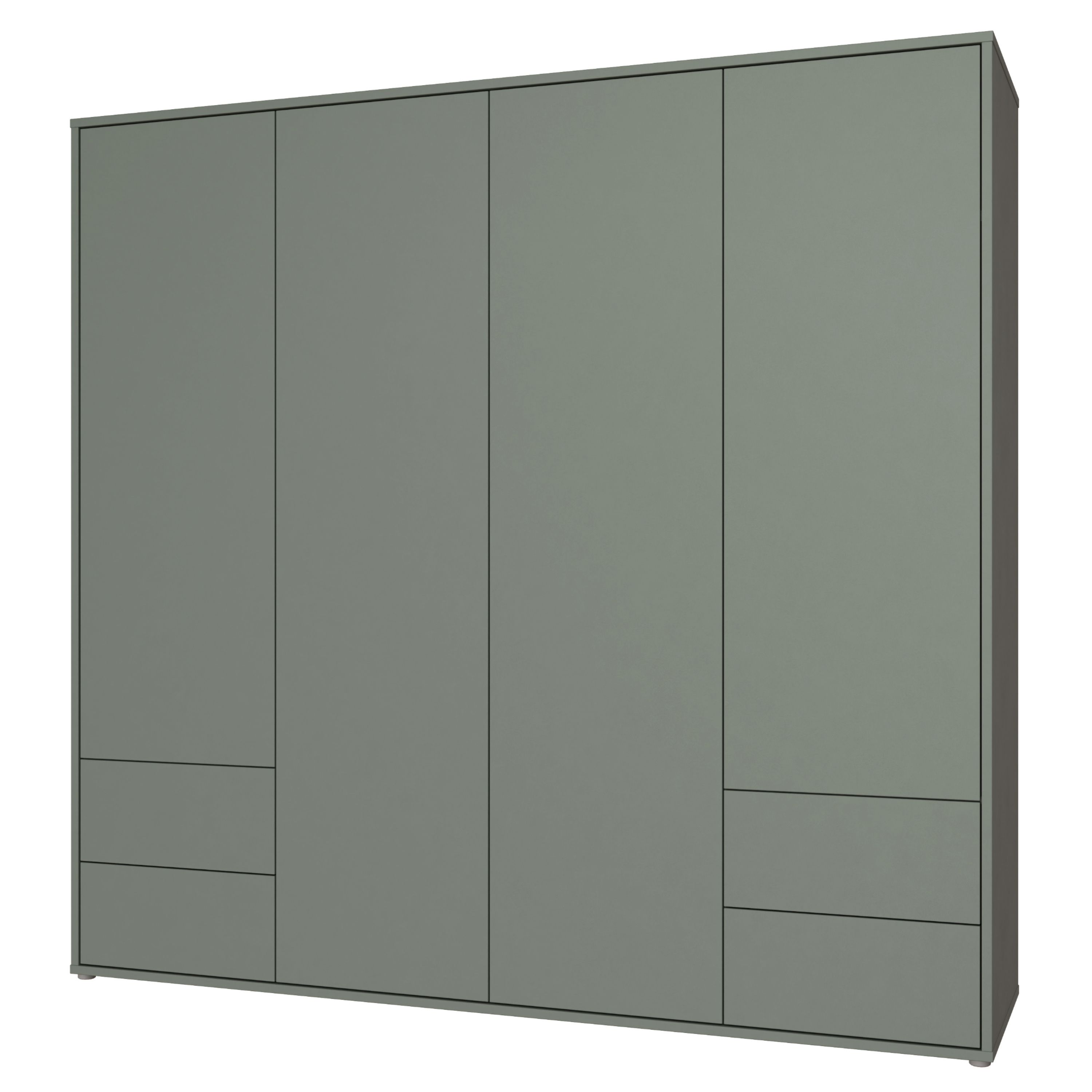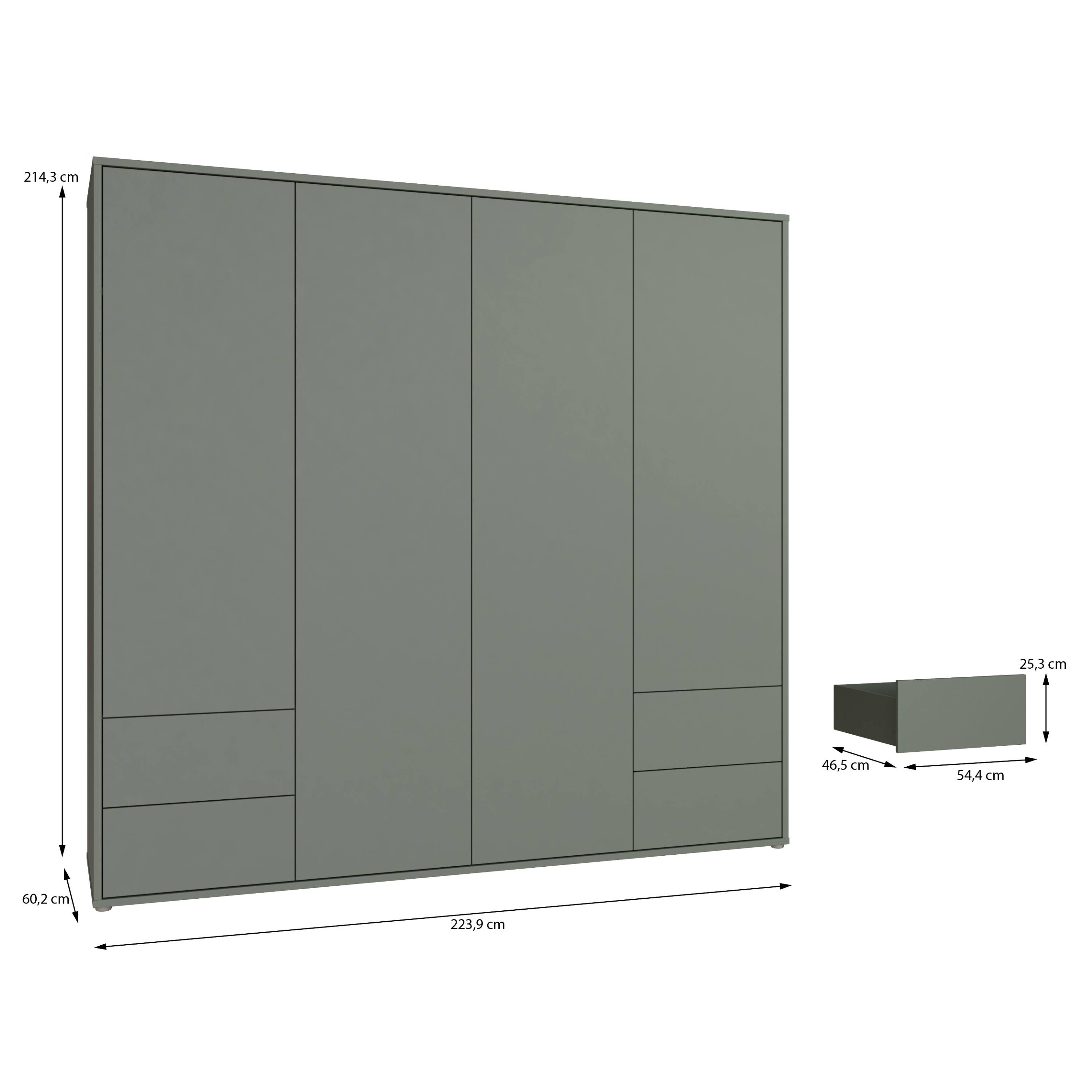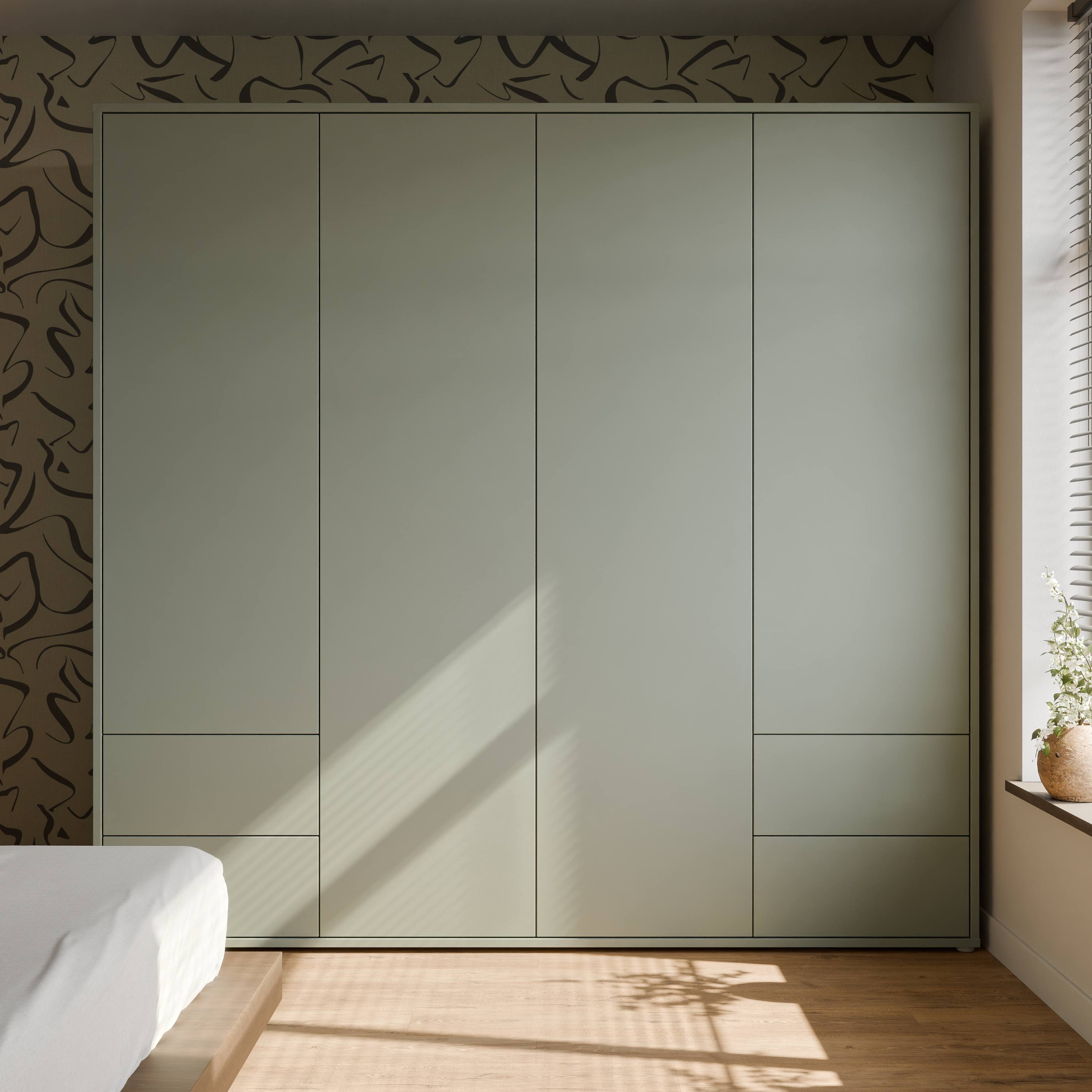 Vnitřní prostor je rozdělen na 2 části, kdy za každým párem otočných dveří se nachází široká šatní tyč doplněná o prostornou vloženou polici nad ní. Toto uspořádání umožňuje přehledné uložení jak zavěšeného oblečení, tak složených věcí a doplňků. Ve spodní části se navíc nachází 2 zásuvky na každé straně, které poskytují ideální místo pro uložení drobnějších kousků oblečení nebo doplňků. Dveře a zásuvky jsou vybaveny systémem push to open, který umožňuje snadné otevírání bez použití úchytek a podtrhuje čistý minimalistický vzhled.