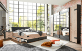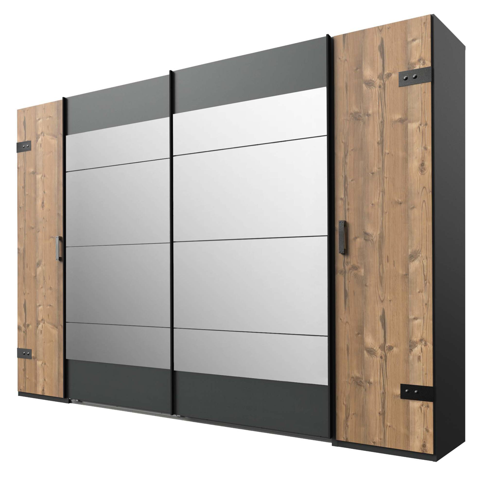 Šatní skříň ALYSSA vnese do vaší ložnice kouzlo starých továren. Kontrast dekoru stříbrné jedle a chladné grafitové barvy vytváří společně kovovými elementy industriální design, který bude zajímavým prvkem vaší ložnice. Zrcadlové dveře opticky zvětší interiér a dodají skříni na eleganci.