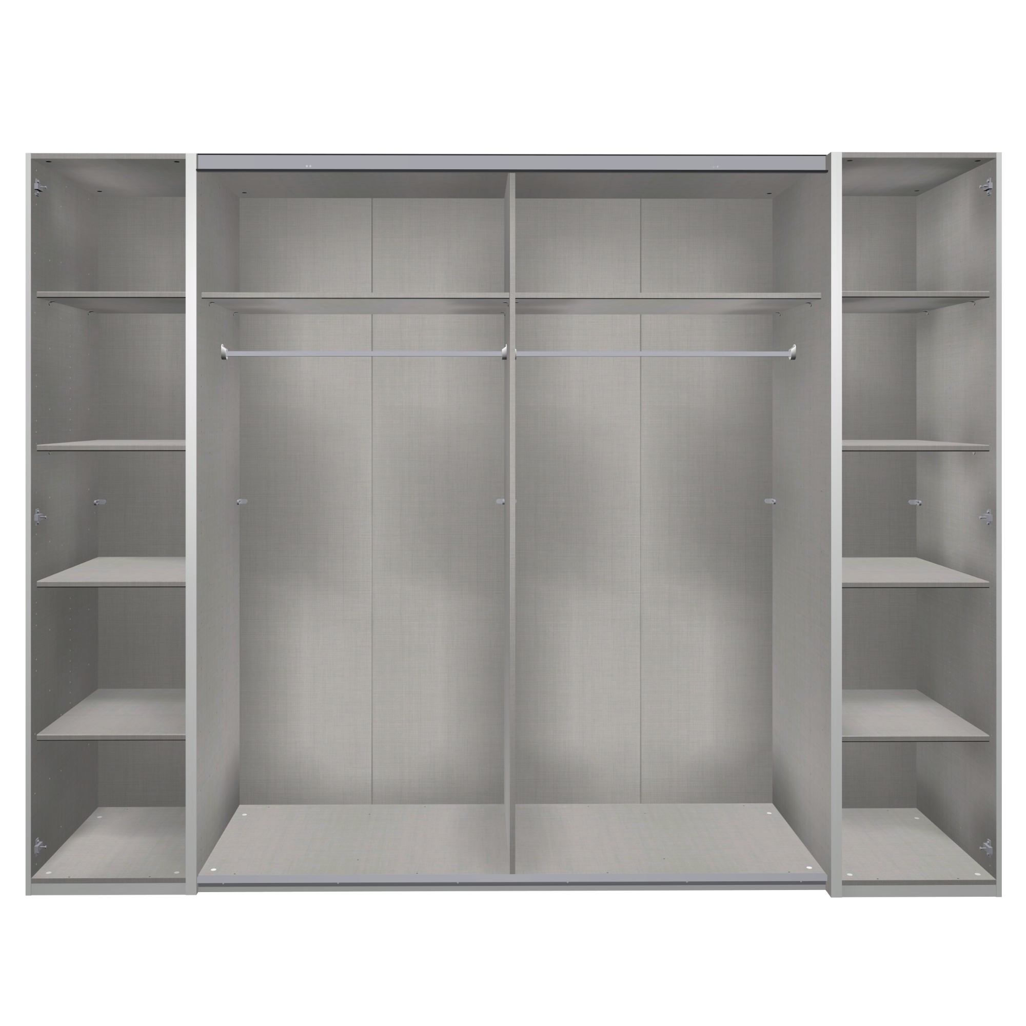 Vnitřní vybavení skříně je rozděleno na tři části. Největší část úložného prostoru je za posuvnými dveřmi v prostřední části skříně. Skládá ze 2 šatních tyčí a 2 vložených polic v horní části skříně. Boční části jsou užší a každá ukrývá za otočnými dveřmi 4 police. Skříň je vyrobena z laminovaného materiálu, který je nenáročný na údržbu.