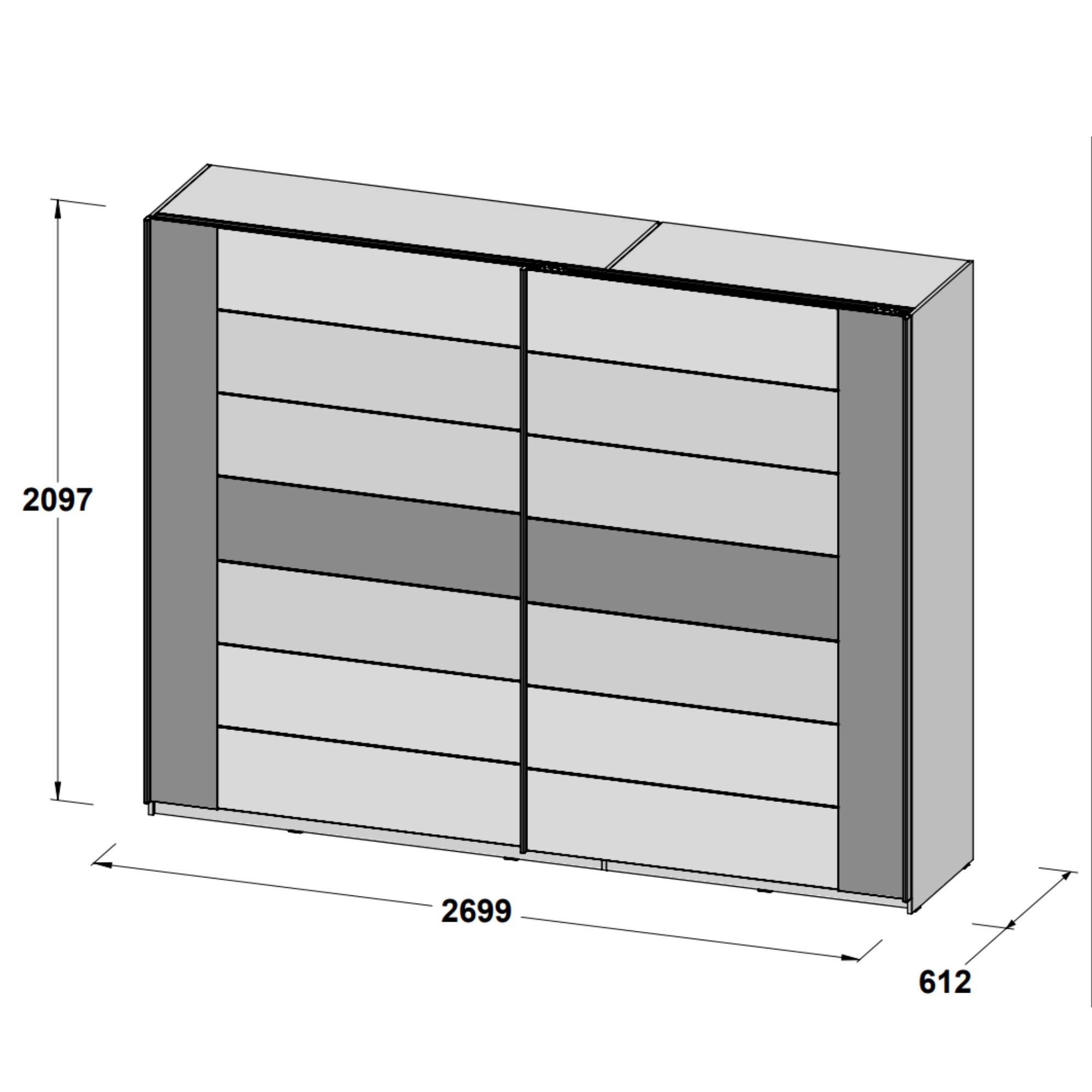 Šatní skříň BELLEVUE zaujme svým moderním designem a praktickými prvky. Hodí se do větších místností a díky svým rozměrům zastoupí v interiéru jednu z hlavních dominant.