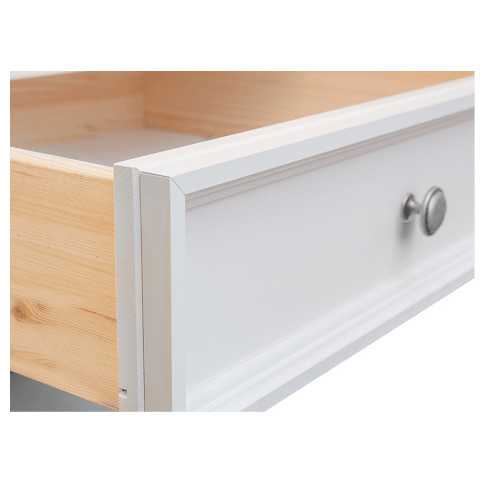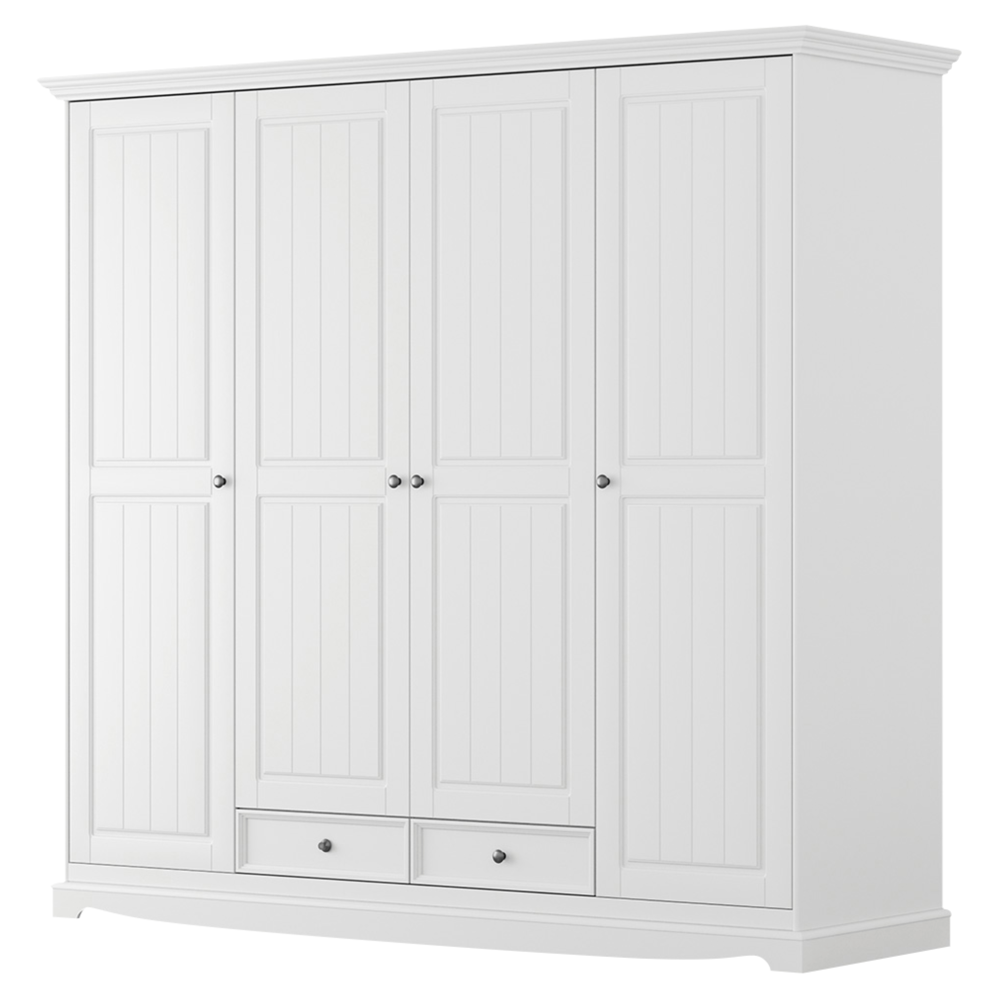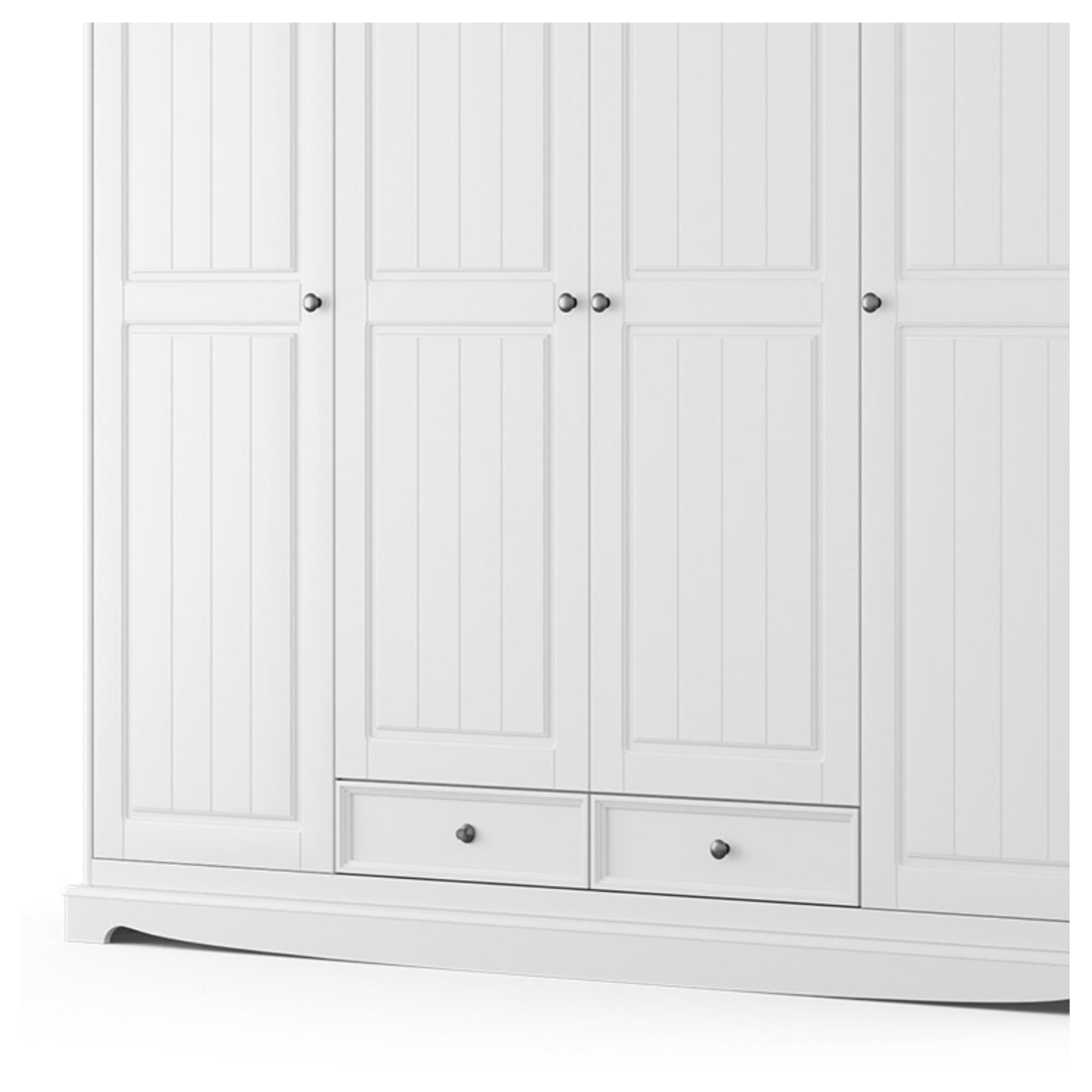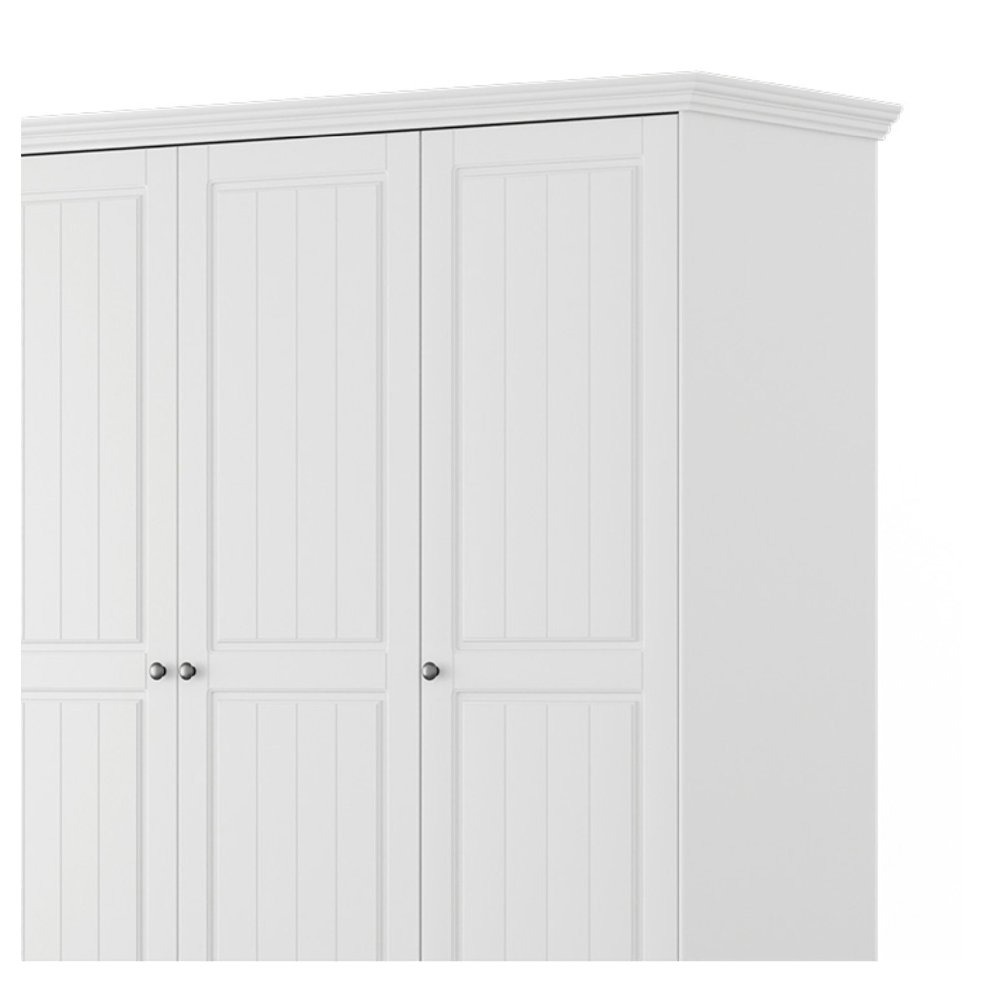 Šatní skříň BELLU 4D v bílém nadčasovém provedení je zdobena množství dekorativních prvků vytvářející romantický vzhled jako jsou kulaté úchyty, dekorativní frézování, vrchní část připomínající antické pilastry nebo zajímavě řešený tvar podstavy. Vyrobena je z masivního dřeva borovice, které jí dodává potřebnou pevnost a odolnost.
