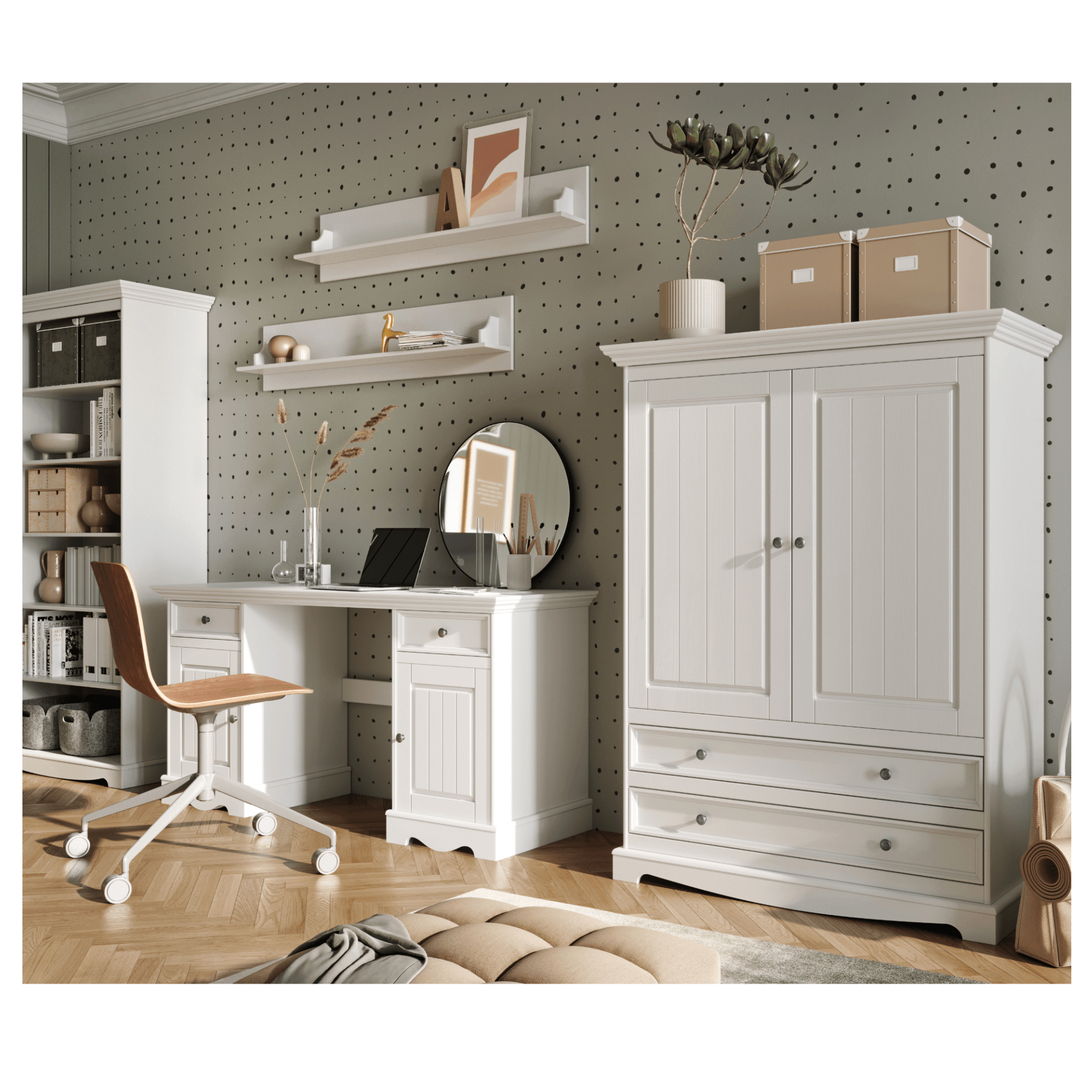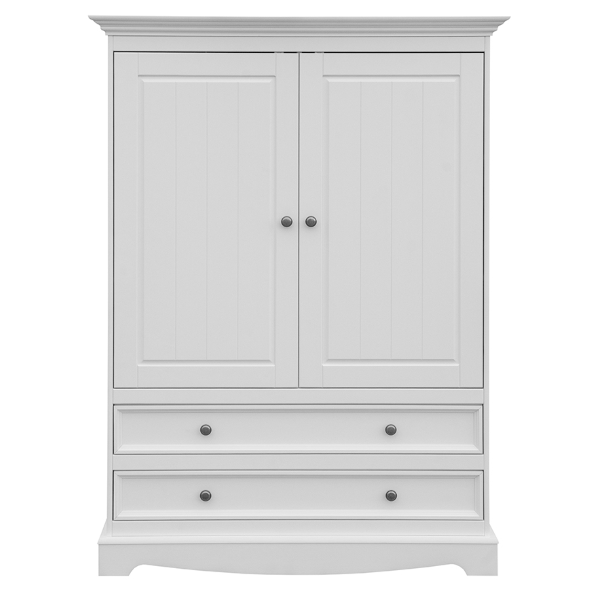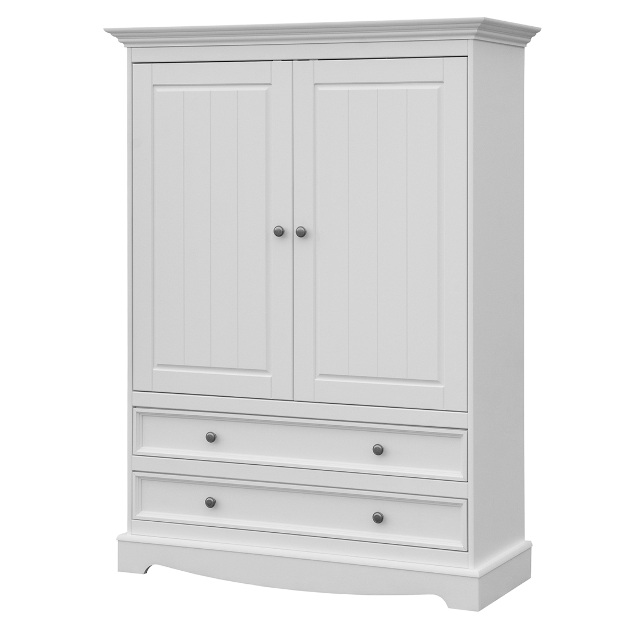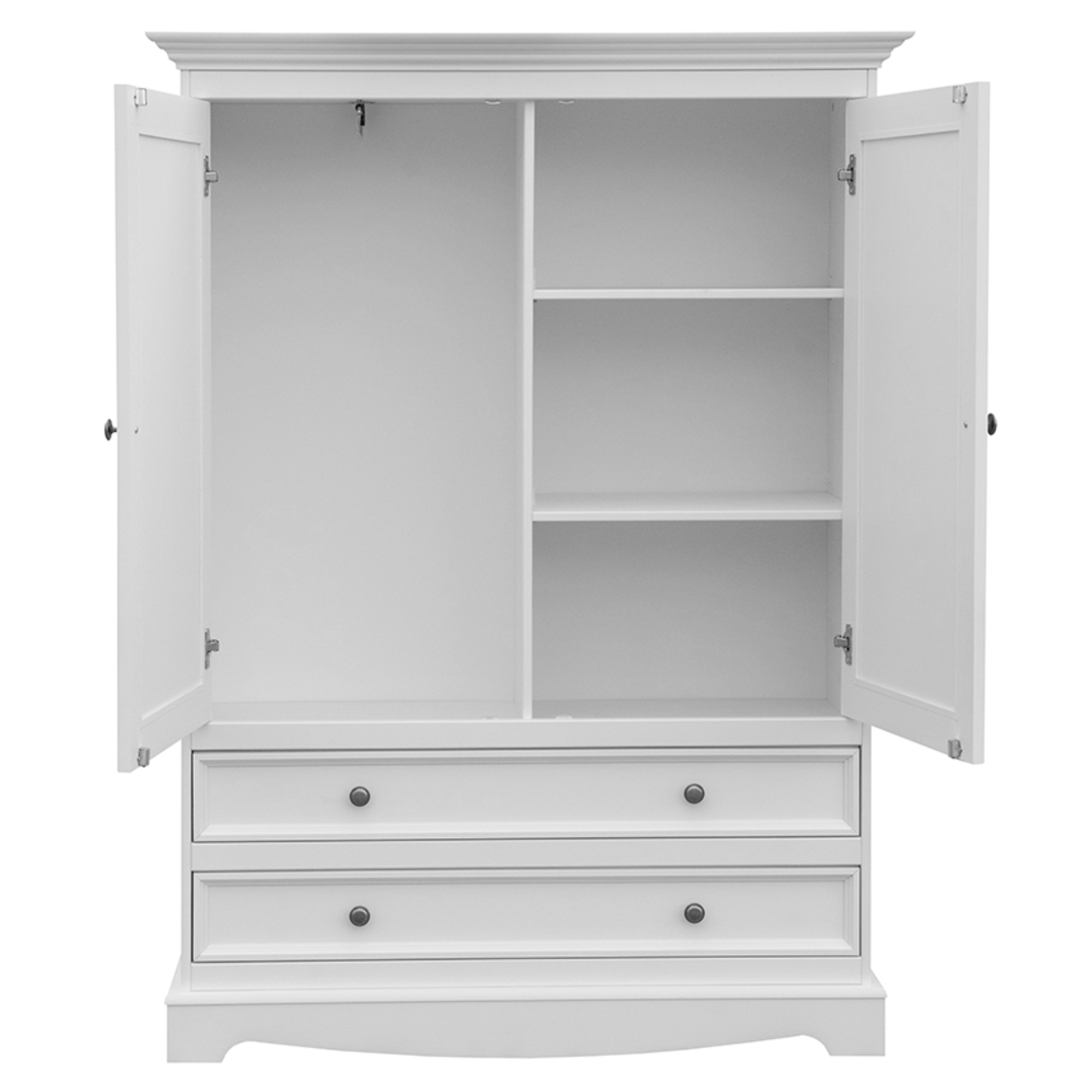 Konstrukce skříně je vyrobena z masivního dřeva borovice v bílé barvě s prosvítající jedinečnou kresbou dřeva. Vybavena je dvojicí otočných dveří, které ukrývají prakticky řešený úložný prostor. Pravá strana obsahuje 2 vložené police nabízející dostatek místa pro uložení poskládaného šatstva či doplňků. Levá strana disponuje 1 šatní tyčí pro pohodlné zavěšení mačkavých kousků nebo bund a kabátů. Pod párem klasických dveří naleznete ještě 2 praktické zásuvky s tichým dovíráním, které můžete využít pro uložené drobnějšího oblečení.