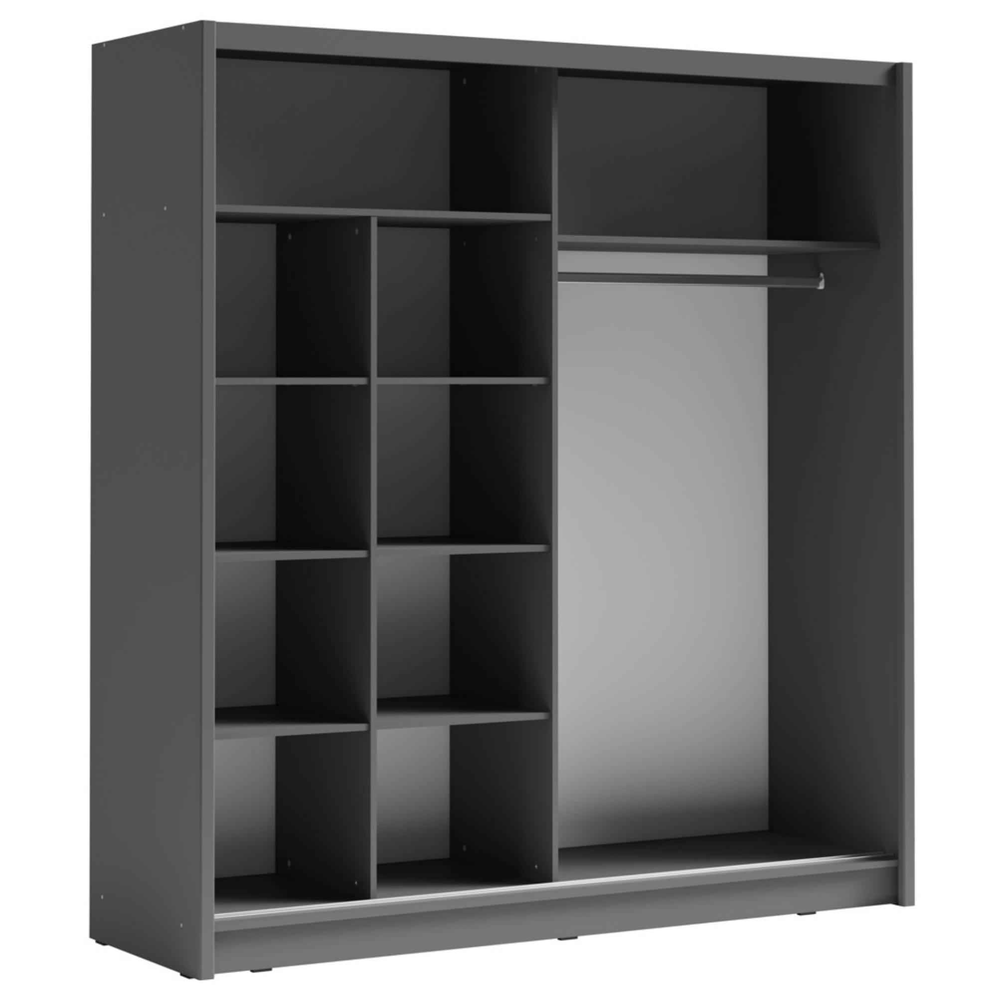 Za posuvnými dveřmi najdete 8 vložených polic pro uskladnění oblečení, lůžkovin, nebo jiných předmětů, které nepotřebujete mít zrovna na očích. Pro zavěšení ramínek je zde šatní tyč. Dveře s děleným zrcadlem, opticky zvětší váš interiér.