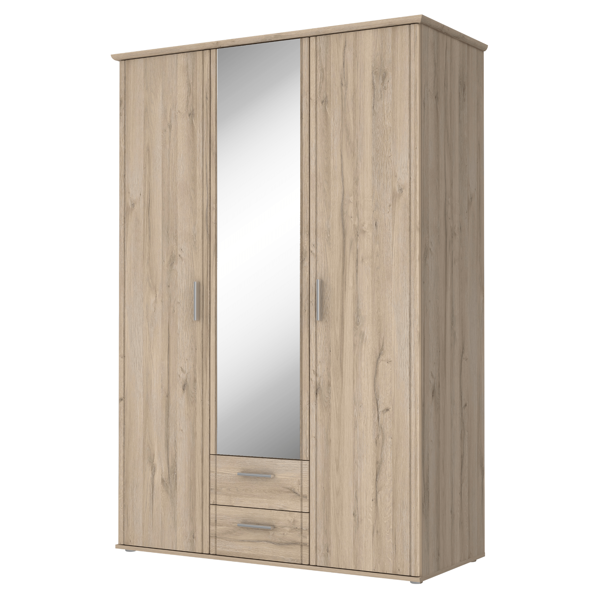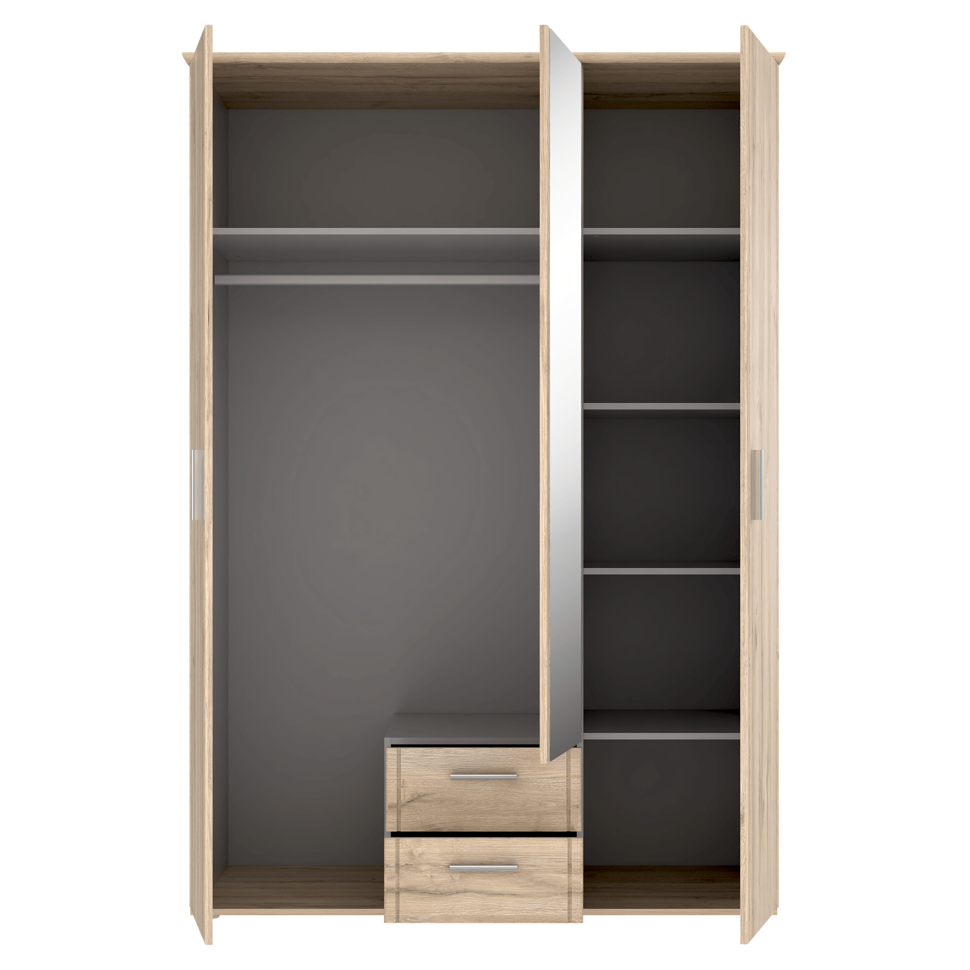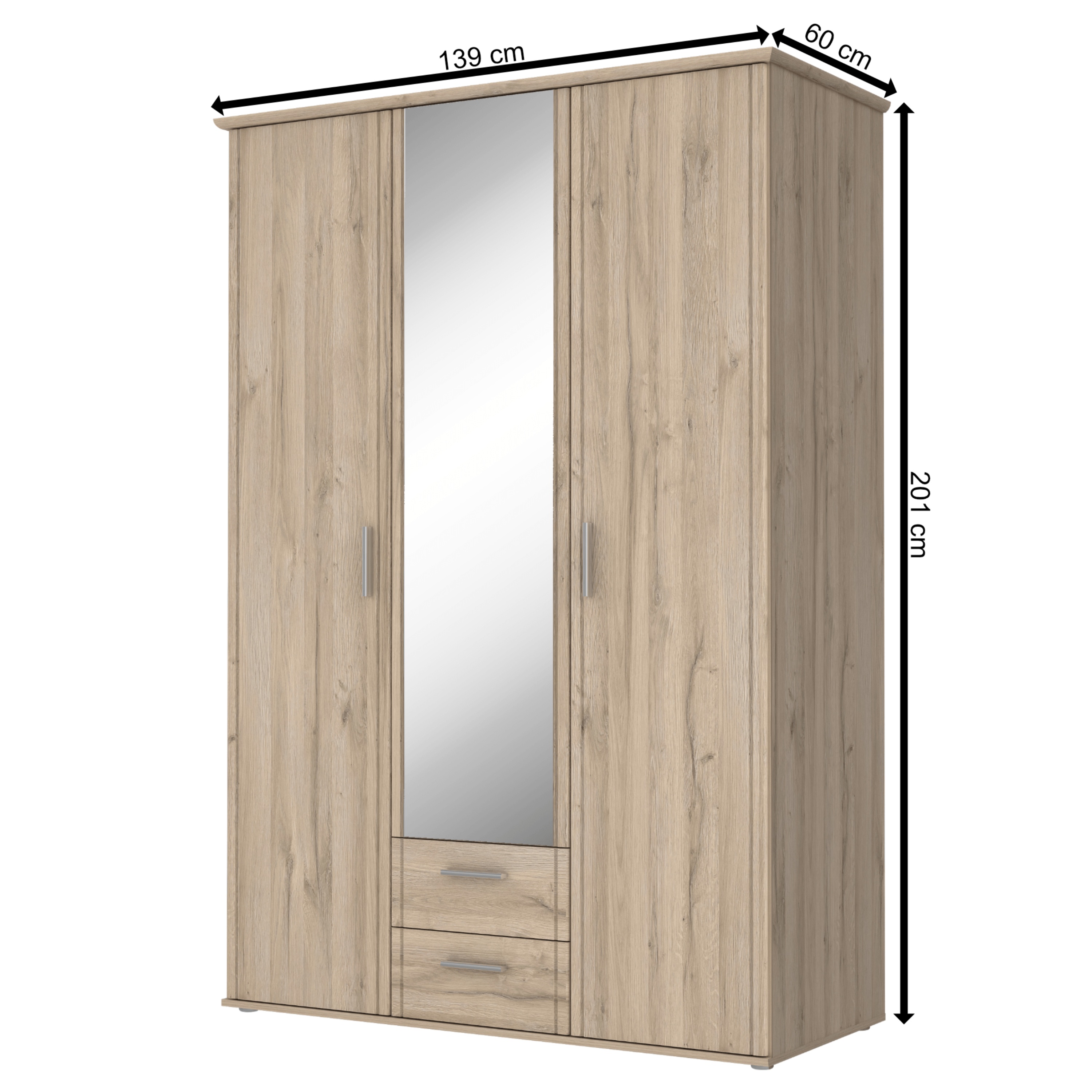 Skříň disponuje 3 otočnými dveřmi z nichž 1 jsou celé vyplněné zrcadlovou plochou, kde si můžete kdykoliv zkontrolovat a upravit svůj vzhled. Členěné vnitřní vybavení skříně sestává ze 4 vložených polic na pravé straně a 1 šatní tyče a 1 širší vložené police ve zbylé části skříně. Skříň disponuje také 2 praktickými zásuvkami. Stříbrné, plastové úchyty vám usnadní otevírání jednotlivých částí. Skříň je vyrobena z laminované dřevotřísky, která není náročná na údržbu.