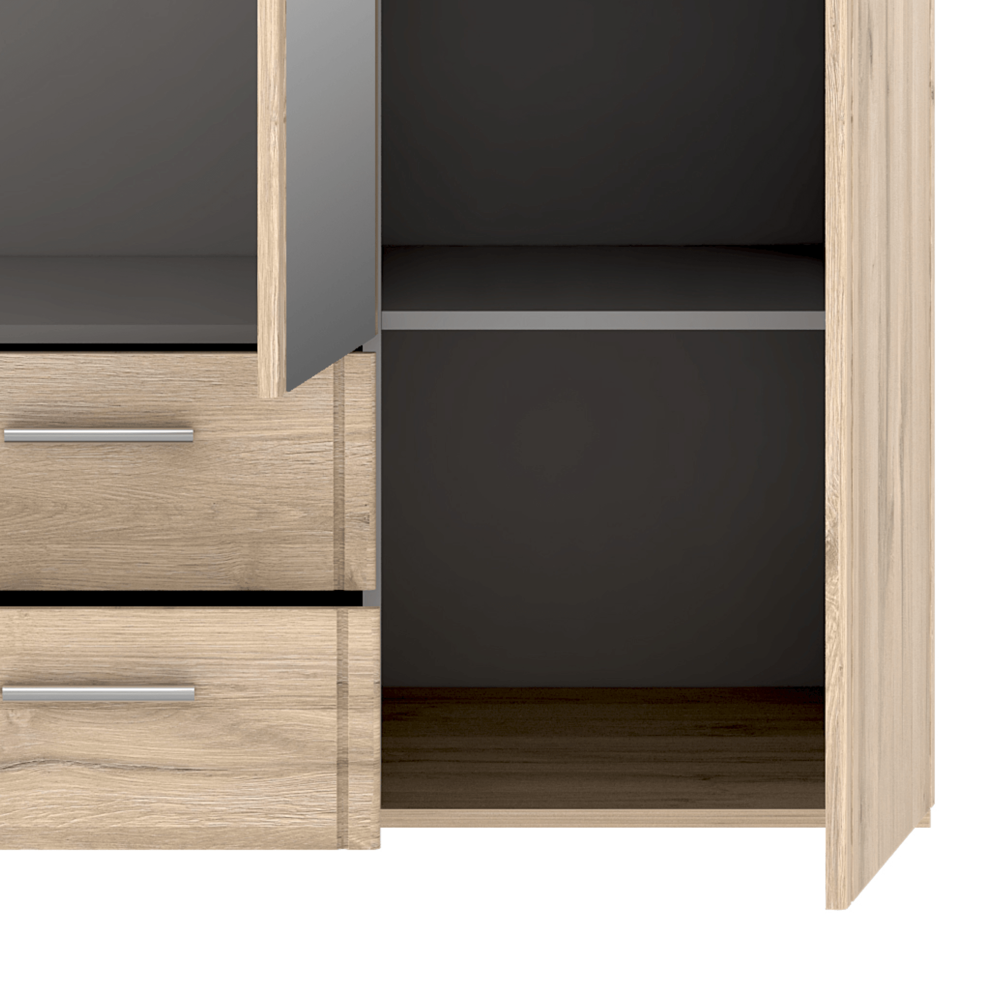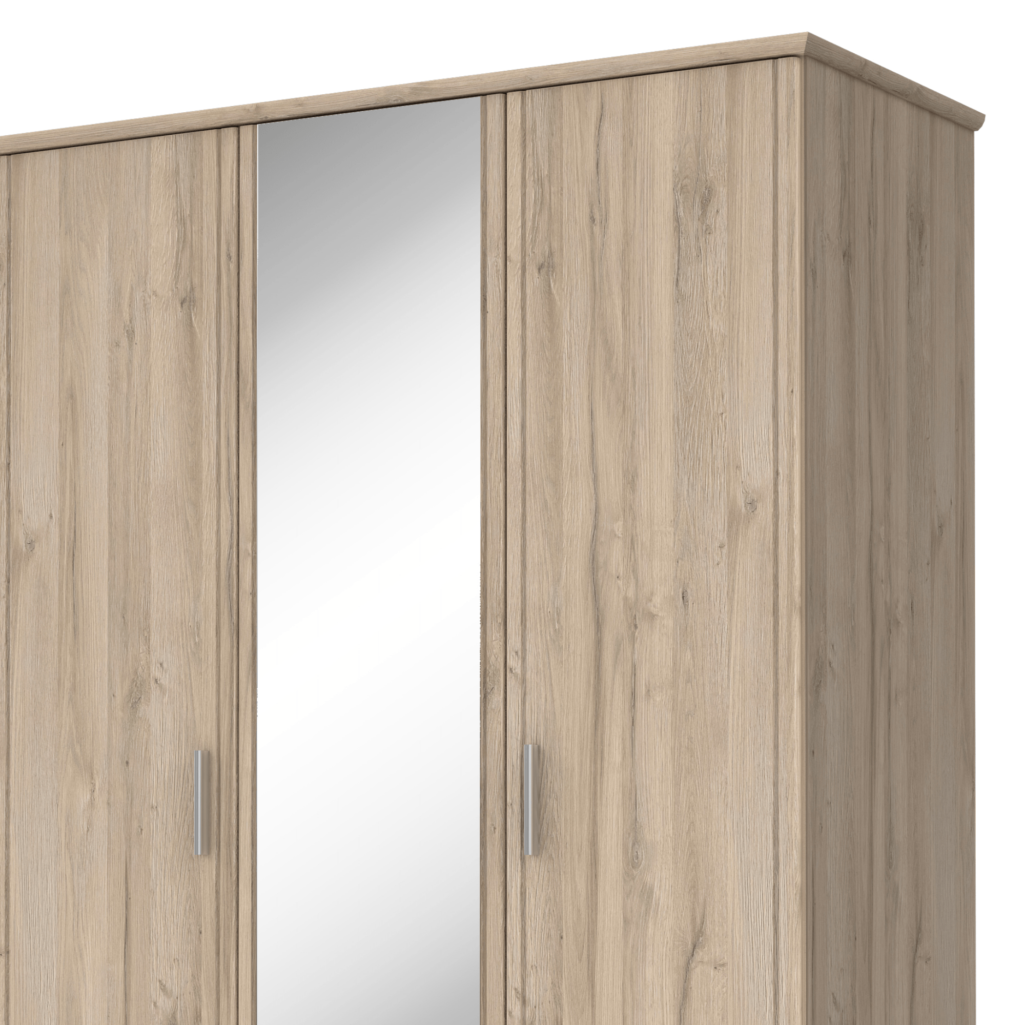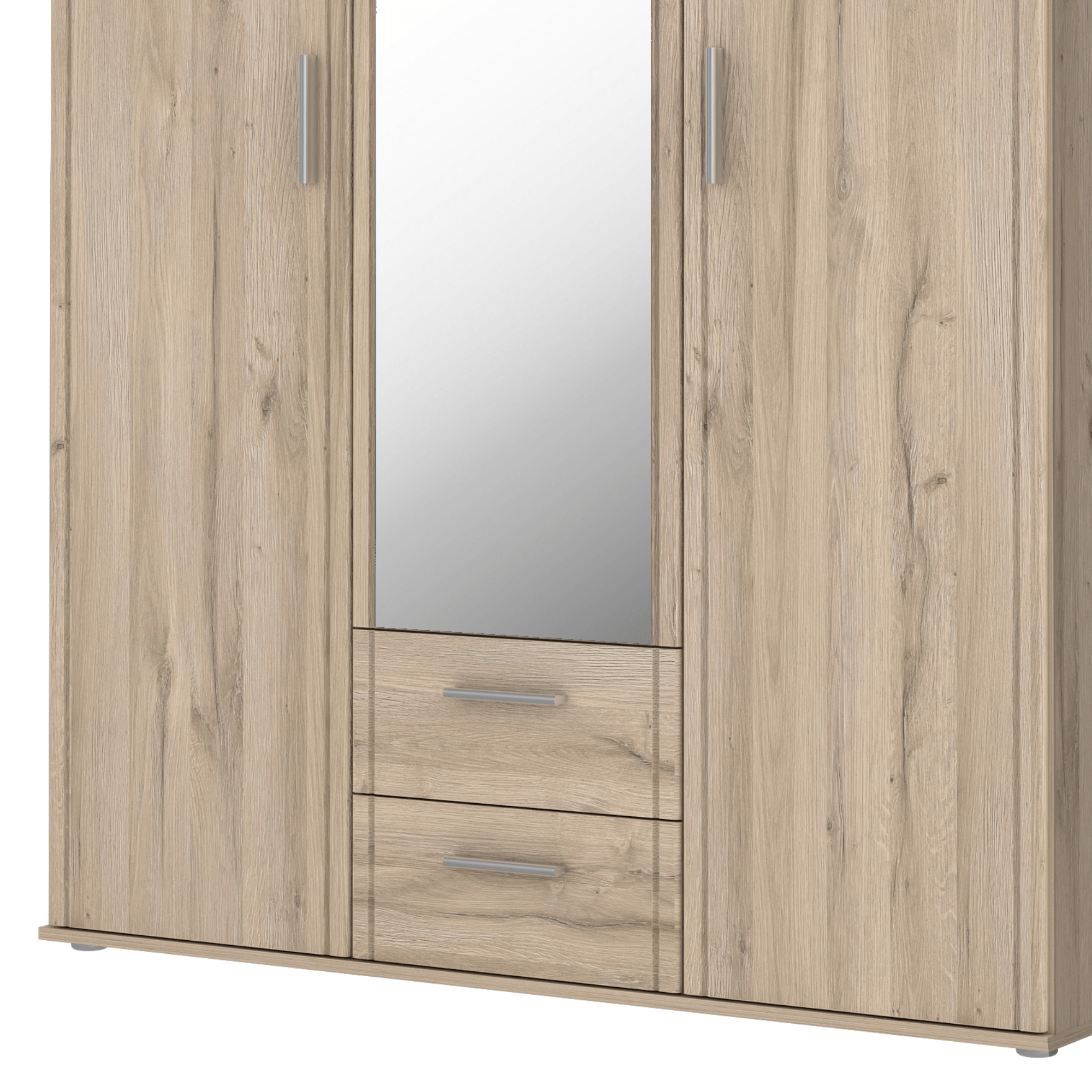 Skříň disponuje 3 otočnými dveřmi z nichž 1 jsou celé vyplněné zrcadlovou plochou, kde si můžete kdykoliv zkontrolovat a upravit svůj vzhled. Členěné vnitřní vybavení skříně sestává ze 4 vložených polic na pravé straně a 1 šatní tyče a 1 širší vložené police ve zbylé části skříně. Skříň disponuje také 2 praktickými zásuvkami. Stříbrné, plastové úchyty vám usnadní otevírání jednotlivých částí. Skříň je vyrobena z laminované dřevotřísky, která není náročná na údržbu.