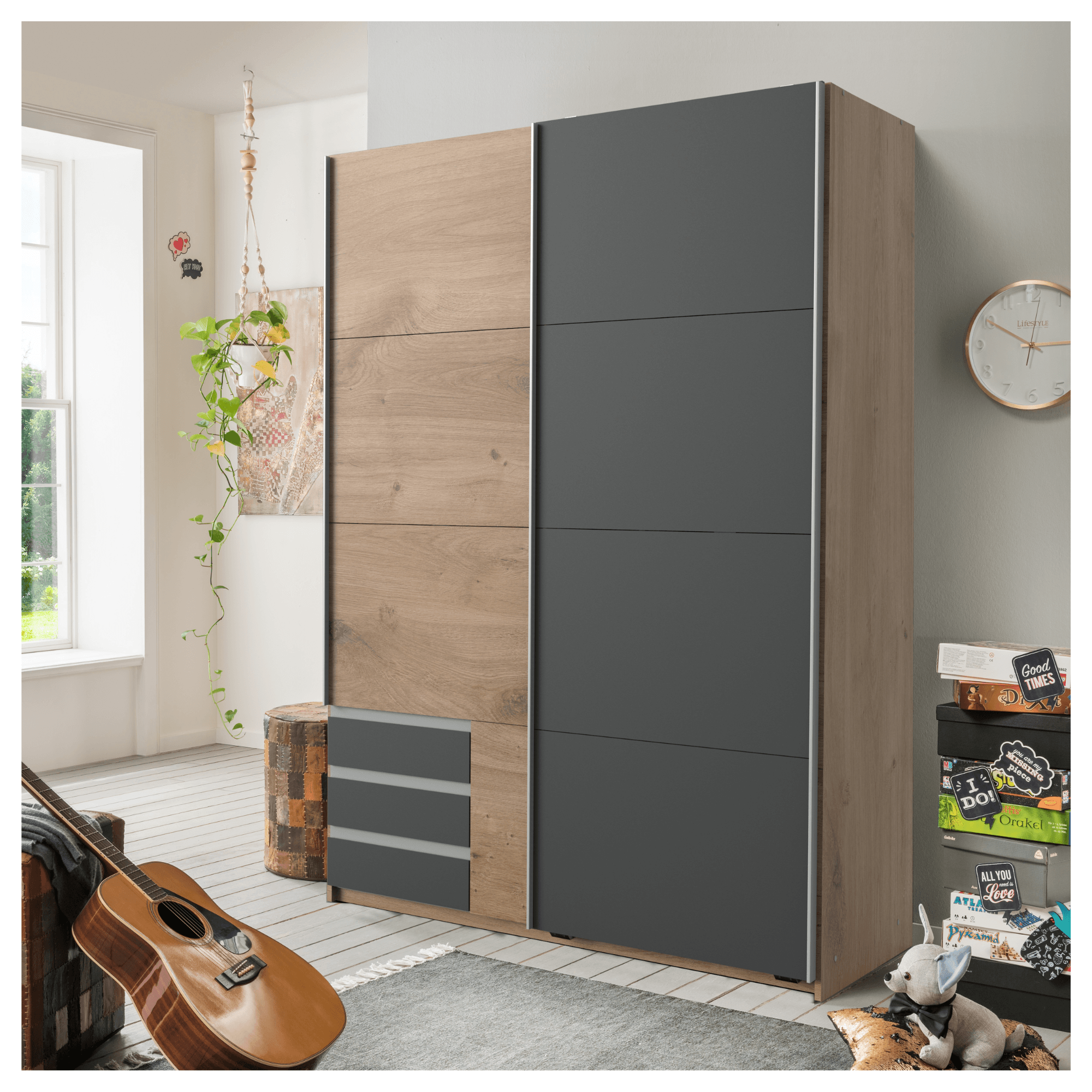 Šatní skříň ERICA - grafitová/přírodní, šířka 135 cm