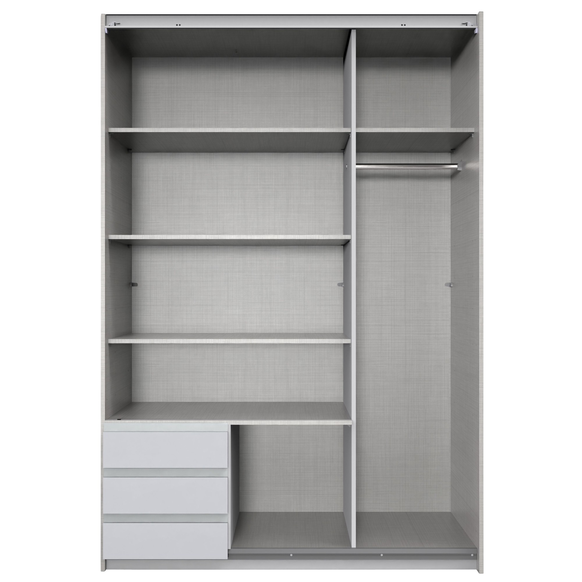 Vnitřní část skříně nabízí velice praktické řešení pro uskladnění, které se skládá ze 2 bloků. Na pravé straně naleznete 1 šatní tyč, která umožňuje pohodlné zavěšení větších oděvů nebo těch, u kterých chcete zabránit pomačkání. Prostorná horní police poskytuje dostatečné místo pro uložení lůžkovin nebo aktuálně nepoužívaného oblečení. Levá strana obsahuje 4 vložené police, které bez problému pojmou množství poskládaného oblečení a doplňků. 3 menší zásuvky jsou ideální pro uložení drobností. Skříň uzavírají posuvné dveře, které šetří cenný prostor vně i uvnitř skříně. Konstrukce je vyrobena z laminovaného dřevěného materiálu, který se vám bude snadno udržovat.