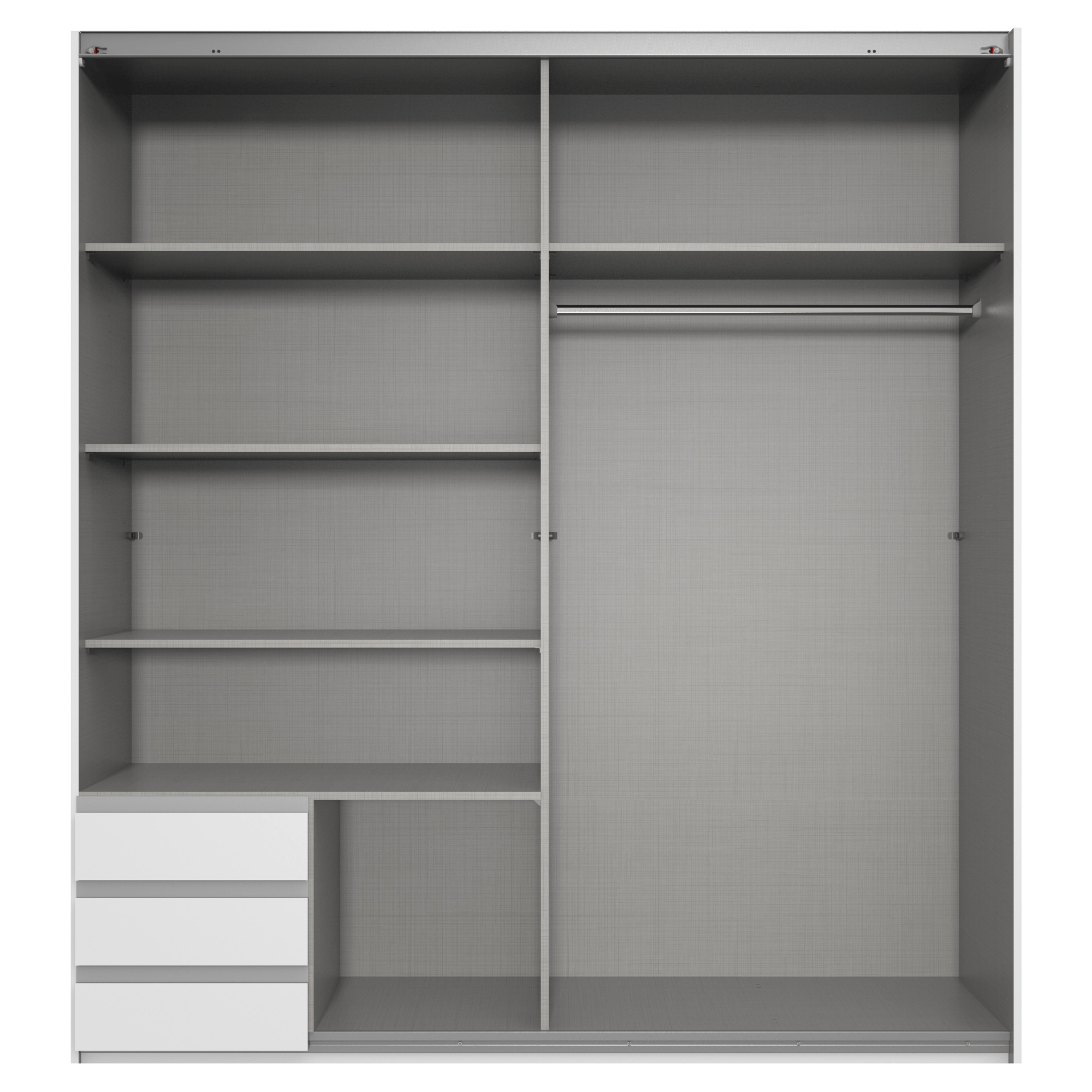 Vnitřní část skříně nabízí velice praktické řešení pro uskladnění, které se skládá ze 2 bloků. Na pravé straně naleznete 1 šatní tyč, která umožňuje pohodlné zavěšení větších oděvů nebo těch, u kterých chcete zabránit pomačkání. Prostorná horní police poskytuje dostatečné místo pro uložení lůžkovin nebo aktuálně nepoužívaného oblečení. Levá strana obsahuje 4 vložené police, které bez problému pojmou množství poskládaného oblečení a doplňků. 3 menší zásuvky jsou ideální pro uložení drobností. Skříň uzavírají posuvné dveře, které šetří cenný prostor vně i uvnitř skříně. Konstrukce je vyrobena z laminovaného dřevěného materiálu, který se vám bude snadno udržovat.