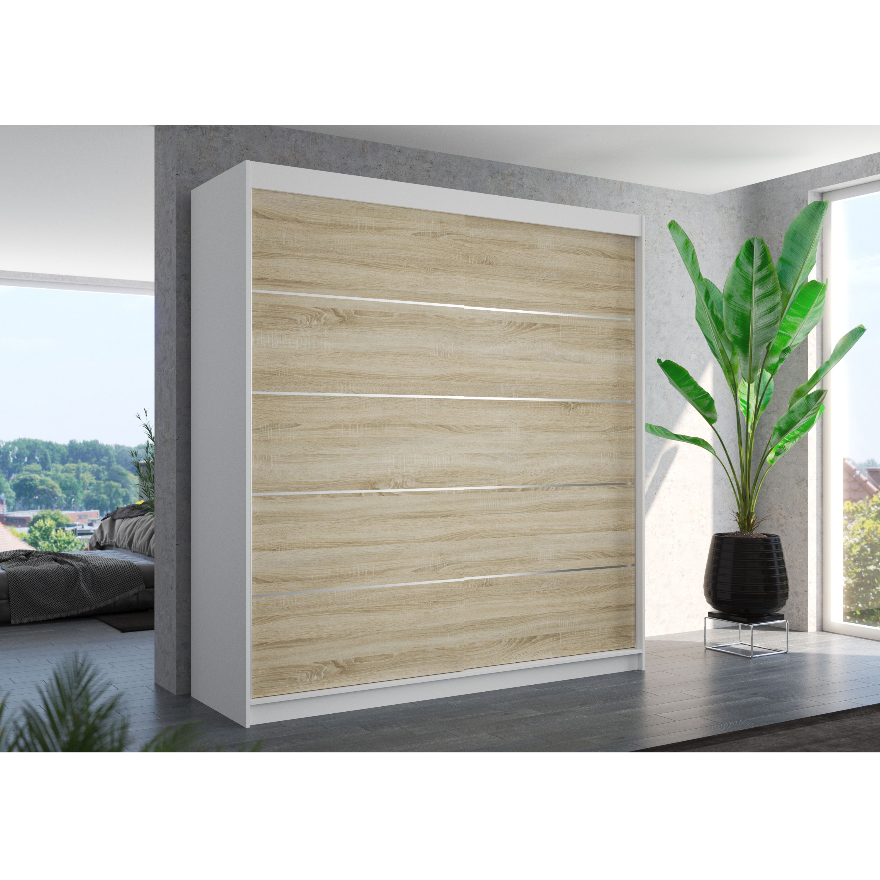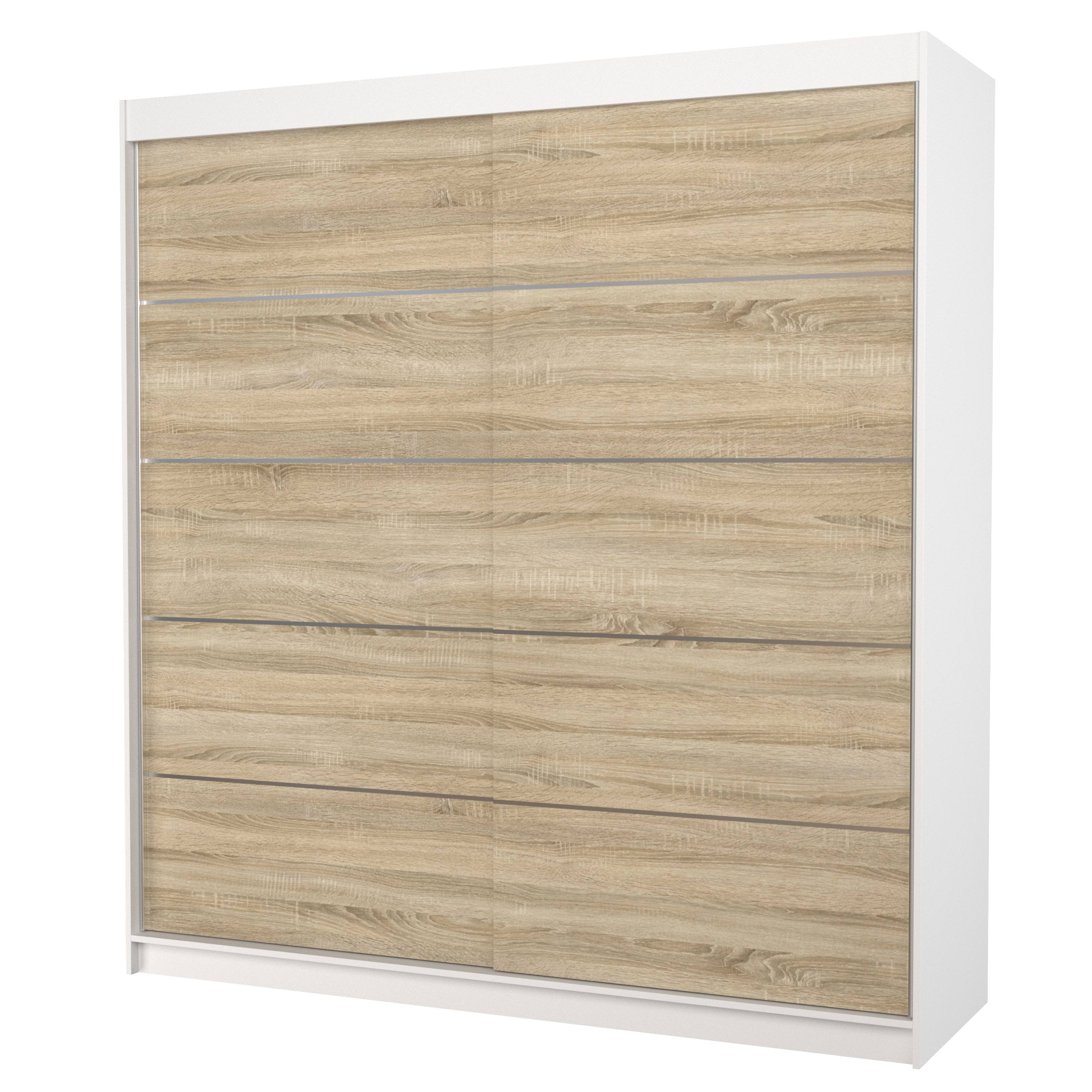 Skříň je uzavíratelná praktickými posuvnými dveřmi, které šetří cenné místo vně skříně. Vnitřní vybavení potom sestává ze 4 polic na každé straně pro uložení složeného oblečení, doplňků nebo úložných boxů, zatímco prostřední část je vybavena šatní tyčí a širokou policí nad ní. Skříň tak nabízí i místo pro zavěšení kabátů, košil nebo šatů a také prostor pro skladování sezonních věcí. Konstrukce skříně je vyrobena z laminovaného dřevěného materiálu doplněného o ABS hrany chránící před mechanickým poškozením.