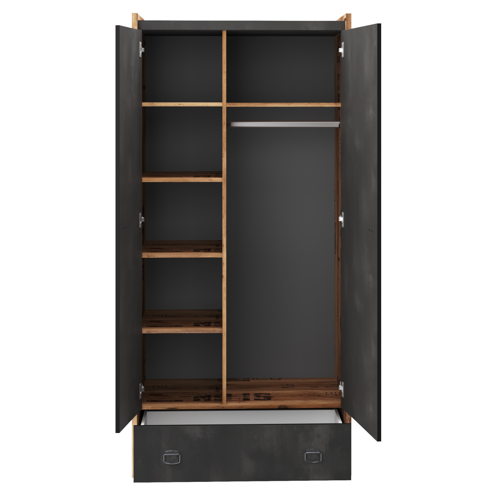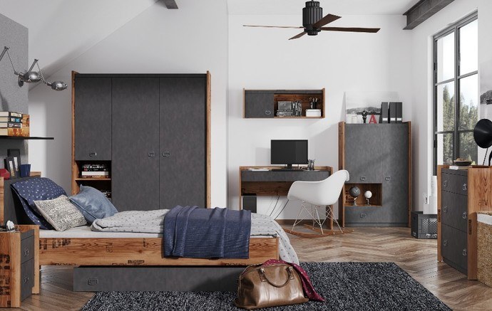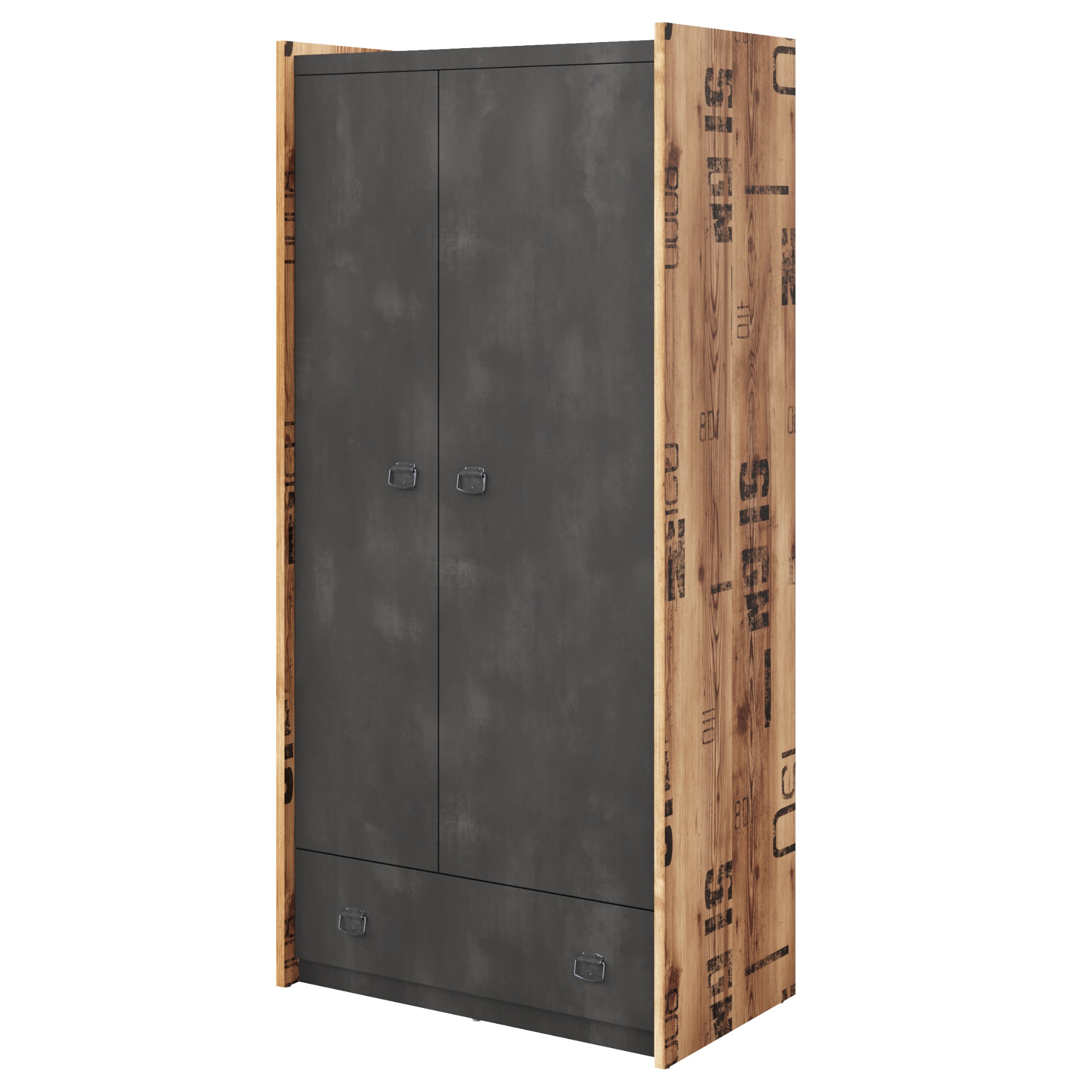 Šatní skříň FARGO 02 v industriálním stylu je dokonalým řešením úložných prostor do menších a sourozeneckých pokojů. Ocelově šedá barva otočných dvířek a korpus v dekoru smrku canyon s potisky dodává nábytku naprostou originalitu.