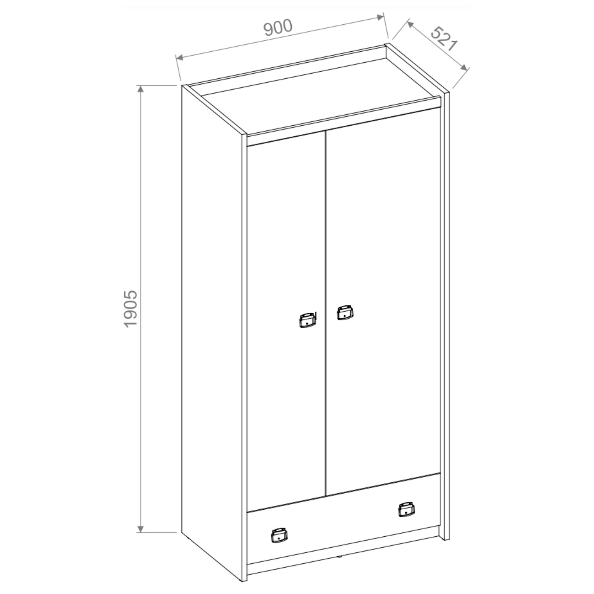 Skříň disponuje 5 vloženými policemi, šatní tyčí a prostornou zásuvkou. Poskytuje tak dostatek místa pro uložení oděvů, úložných boxů nebo sportovního vybavení. Hlavním materiálem je laminovaná dřevotřísková deska, která je doplněna o přední část z dřevovláknité MDF desky s ABS hranami. Tento materiál disponuje odolností vůči mechanickému zatížení a působení vlhkosti. Skříň je nenáročná na údržbu. Skříň lze kombinovat s ostatním nábytkem z programu FARGO.