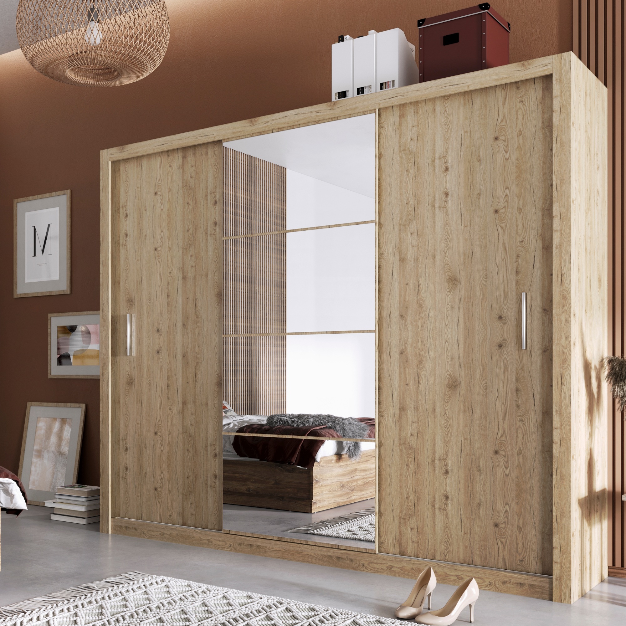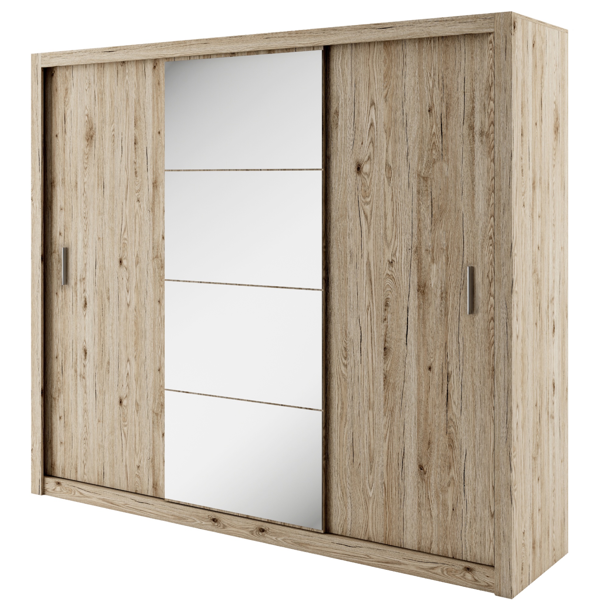 Šatní skříň má 3 posuvné dveře, které se neotvírají do prostoru a ušetří tak spoustu místa. Jedny dveře jsou vybaveny praktickým zrcadlem. Za dveřmi se nachází prostorné členěné vnitřní vybavení sestavené ze 6 vložených polic a 2 šatní tyčí. Decentní úchytky usnadňují otevírání jednotlivých částí. Skříň je vyrobena z laminovaného dřevěného materiálu, který je odolný a nenáročný na údržbu. Chcete mít interiér sjednocený do jednoho stylu? Podívejte se na další nábytek ze stejnojmenného nábytkového programu IDEA.